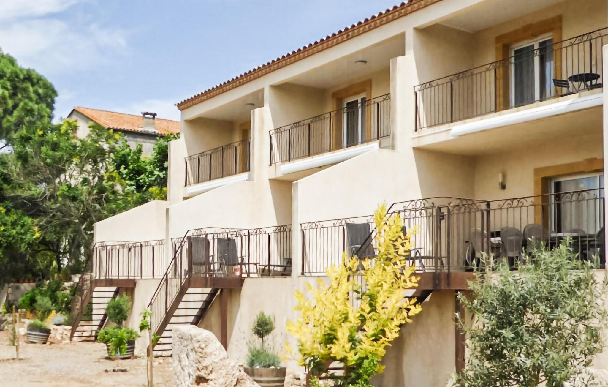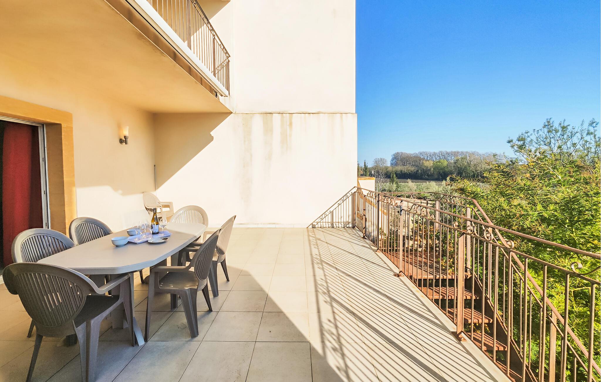 Från din balkong har du en underbar utsikt över det vidsträckta landskapet. Ät frukost här eller fördjupa dig i din semesterläsning. Du kan när som helst svalka dig i den gemensamma poolen och njuta av lugnet och tystnaden i den gröna trädgården på en av solstolarna.
