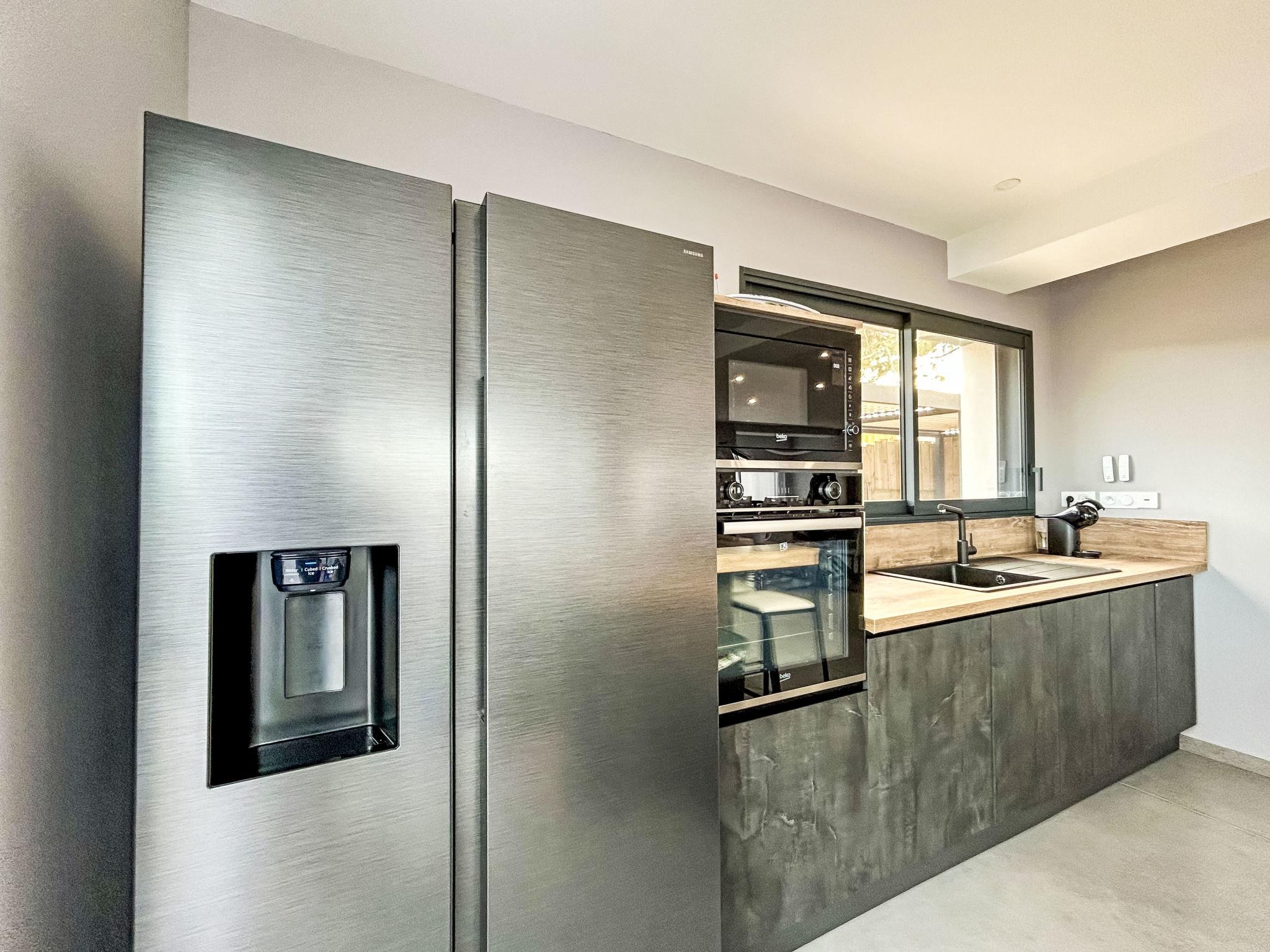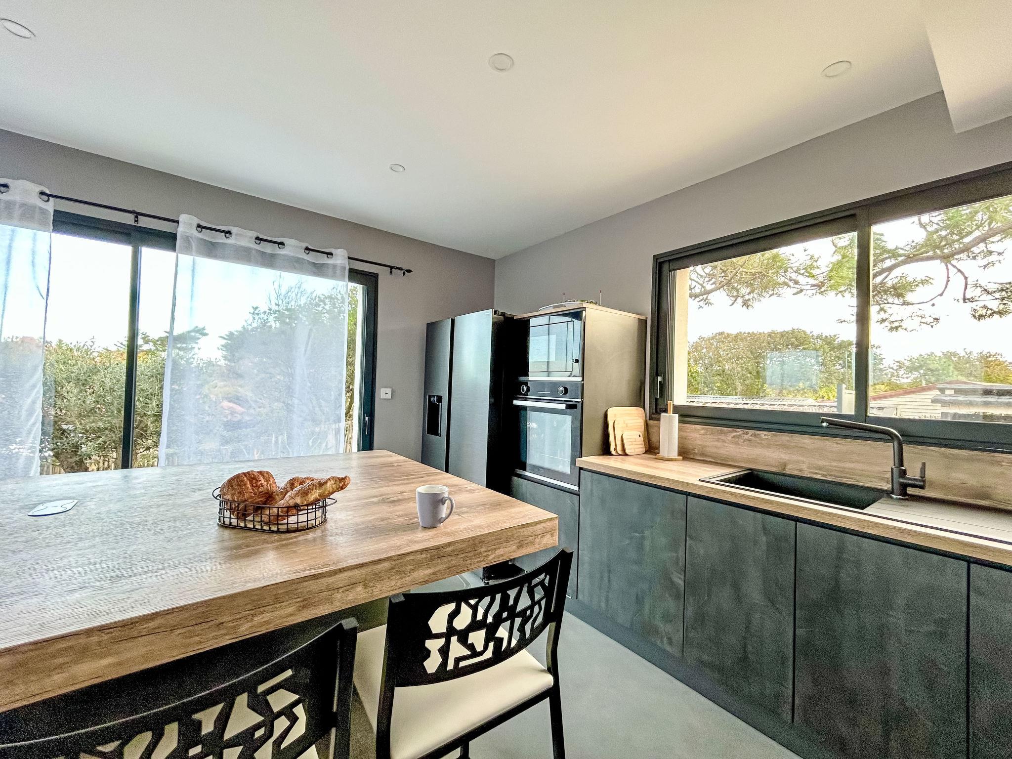 6-room villa 160 m2 on 2 levels. Beautiful and modern furnishings: living/dining room 72 m2 with TV (flat screen). 1 room with 1 french bed (160 cm, length 200 cm), shower. Exit to the terrace. Large, open kitchen (oven, dishwasher, 4 induction hot plates, toaster, kettle, microwave, electric coffee machine, Capsules for coffee machine (Dolce gusto) extra). Sep. WC. Air-conditioning. Upper floor: 3 rooms, each room with 1 french bed (160 cm, length 200 cm), shower. Exit to the terrace. 1 room with 2 x 2 bunk beds (90 cm, length 190 cm). Large terrace 115 m2 partly roofed. Terrace furniture, barbecue, deck chairs. Partial view of the sea. Facilities: Internet (WiFi, free). Please note: non-smoking house. Smoke alarm. Offer by a private individual according to Art. 155, IV of CGI.