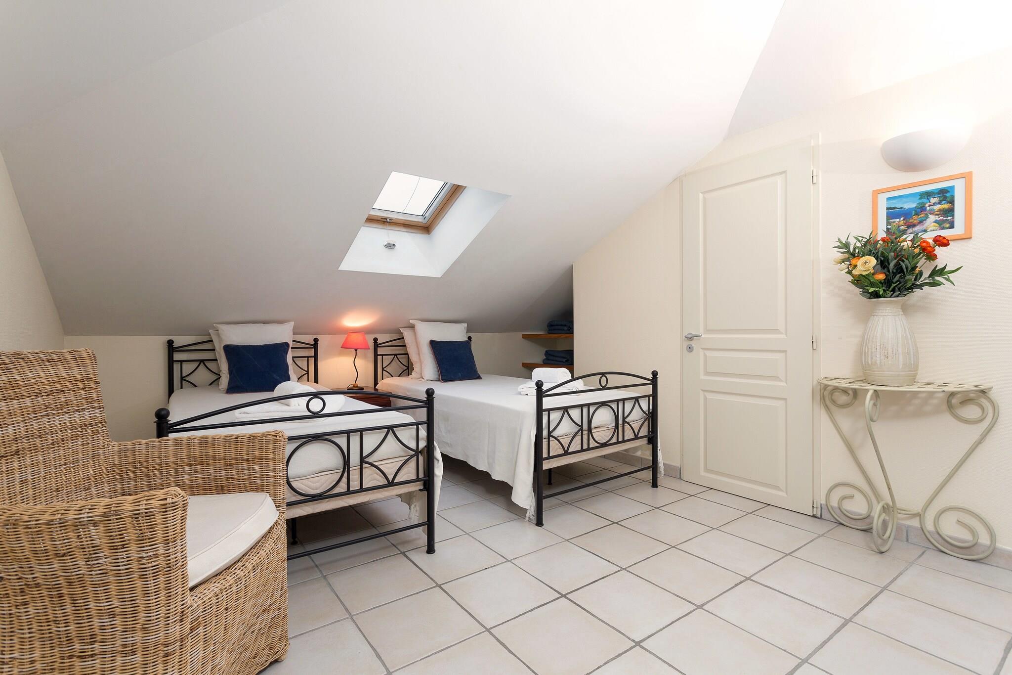 Bottenvåningen: (Vardagsrum(bäddsoffa, TV(satellit), öppen spis), Matsal(fransk balkong), Kök(ugn, mikrovågsugn, diskmaskin), sovrum(Dubbelsäng eller 2 enkelsängar), sovrum(Dubbelsäng eller 2 enkelsängar), sovrum(Dubbelsäng eller 2 enkelsängar), sovrum(Dubbelsäng eller 2 enkelsängar), badrum(badkar, Bubble bath, handfat), badrum(dusch, handfat), badrum(dusch, handfat), WC, WC, förråd(tvättmaskin)) värme(central), terrass, trädgård, trädgårdsmöbler, swimmingpool(privat, delas med andra gäster , opened from Apr upto and including Oct)