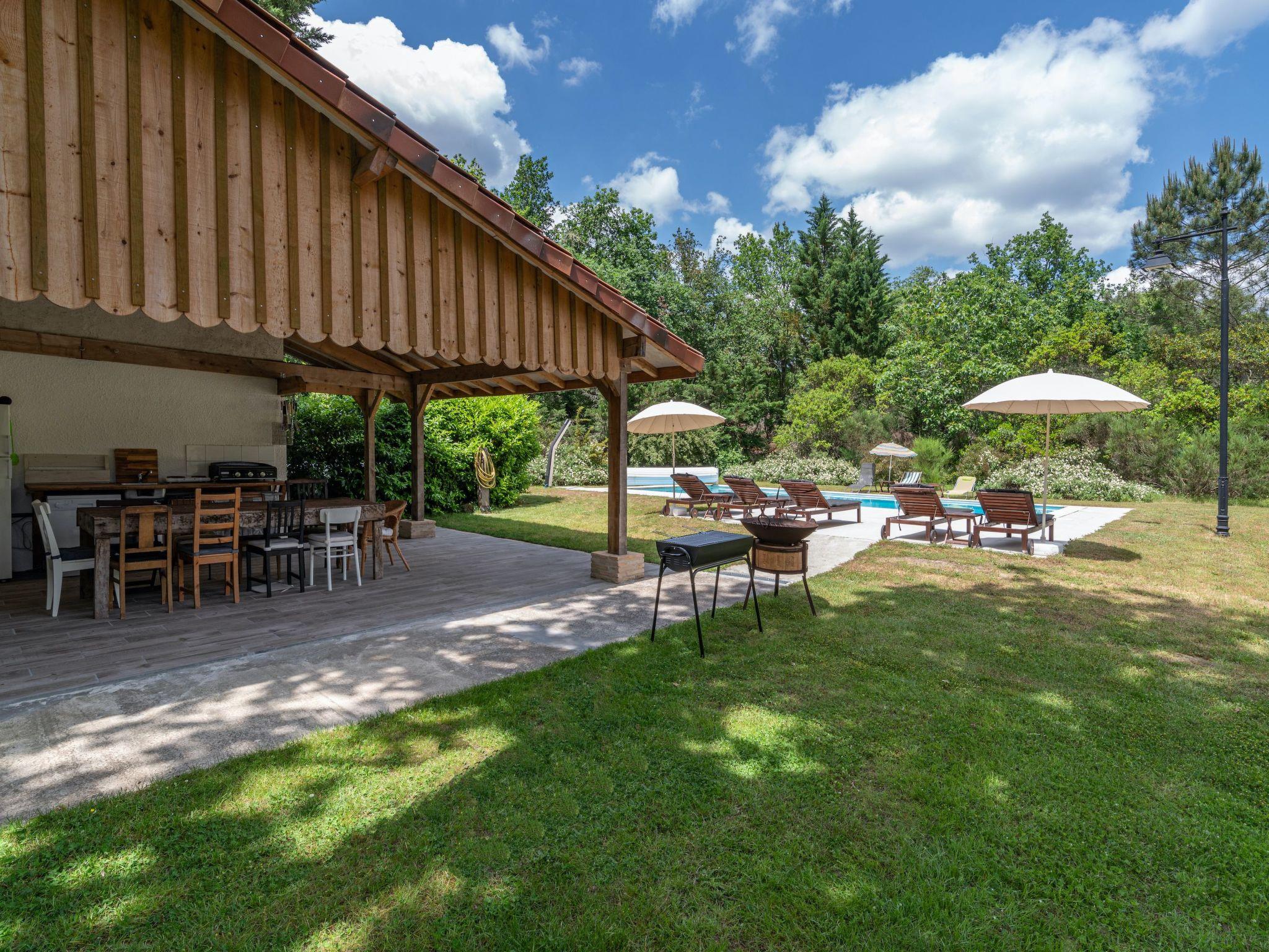 Venture outside to the cuisine d’été, a favored feature providing a summer kitchen and covered dining area with two large dining tables, comfortably seating up to 16 guests. The kitchen area, equipped with a fridge-freezer, dishwasher, and electric hob, alongside a standard charcoal barbecue, invites memorable al fresco dining by the private 5x11m swimming pool. The mature secluded gardens, filled with grand oaks and tall pines, offer various seating areas to enjoy the sun or shade.
