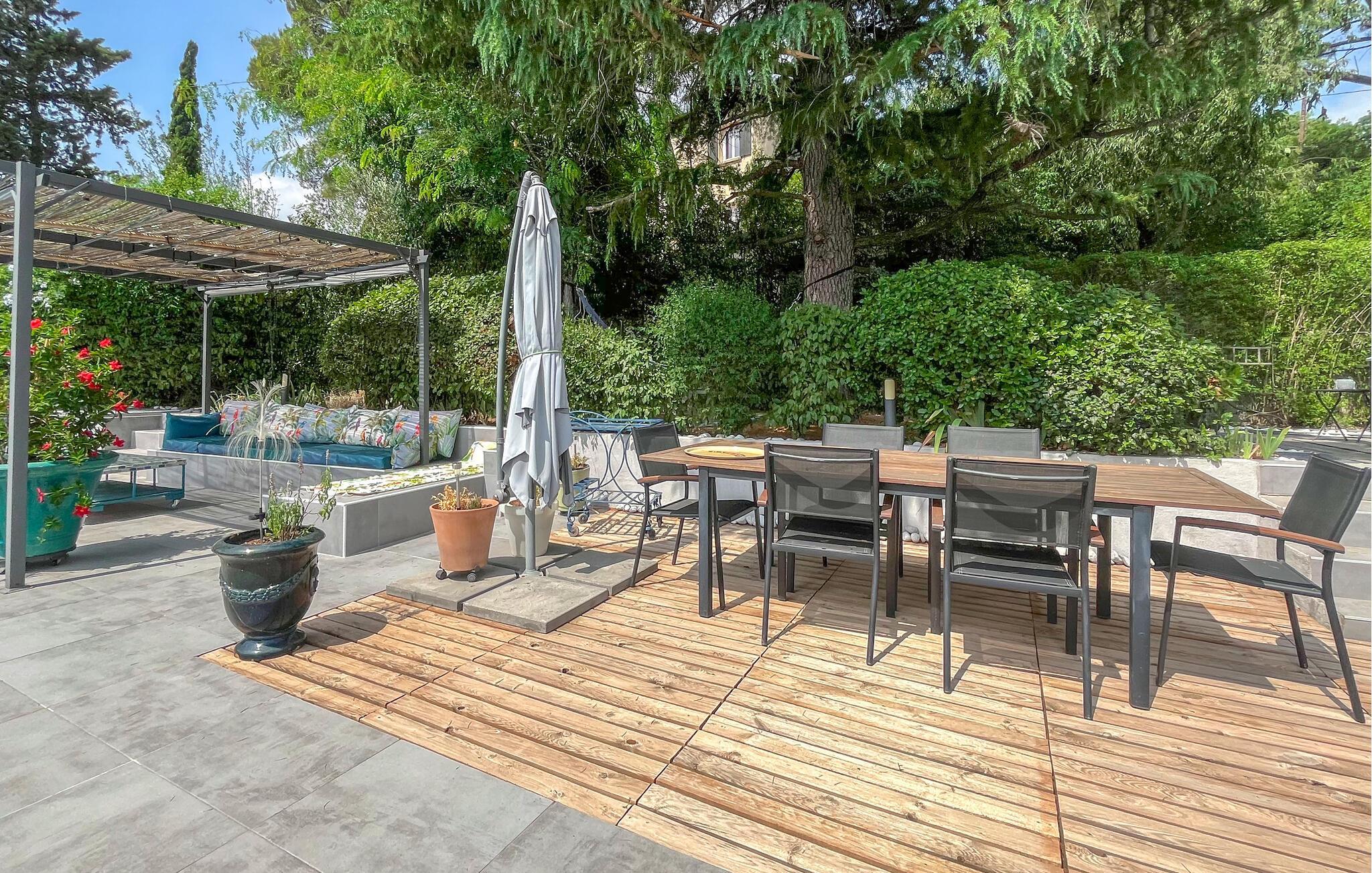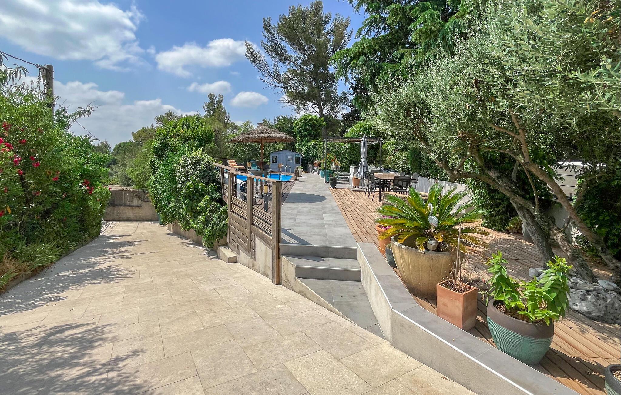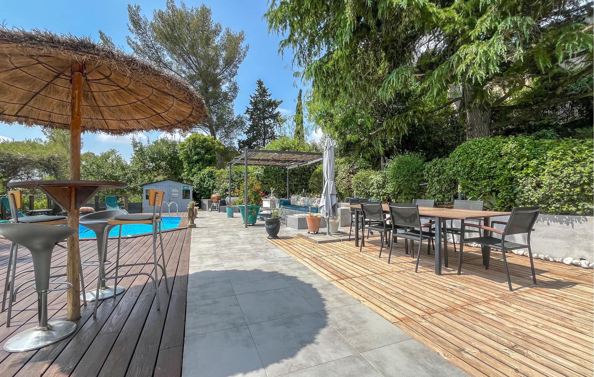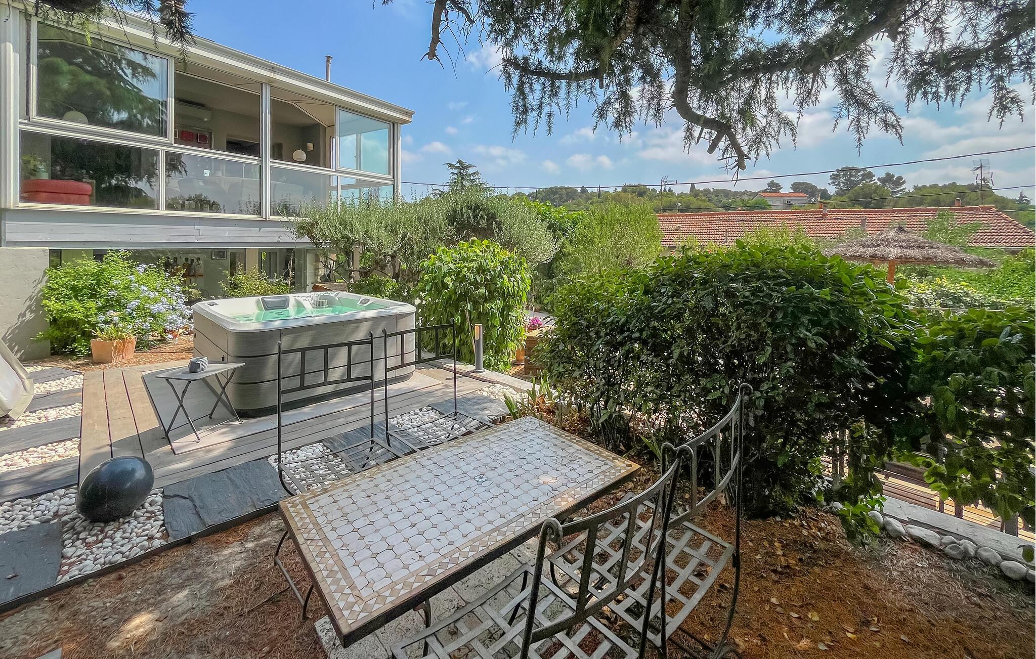 Detta rymliga och smakfullt moderniserade semesterhus ligger på höjderna av Nîmes och erbjuder dig den perfekta utgångspunkten för en mängd olika aktiviteter. Tillaga kulinariska höjdpunkter med färska produkter från veckomarknaden och slå dig ner i den ljusa matplatsen med panoramafönster. Använd den rymliga soffgruppen för mysiga läsesessioner eller sällskapliga spelkvällar.