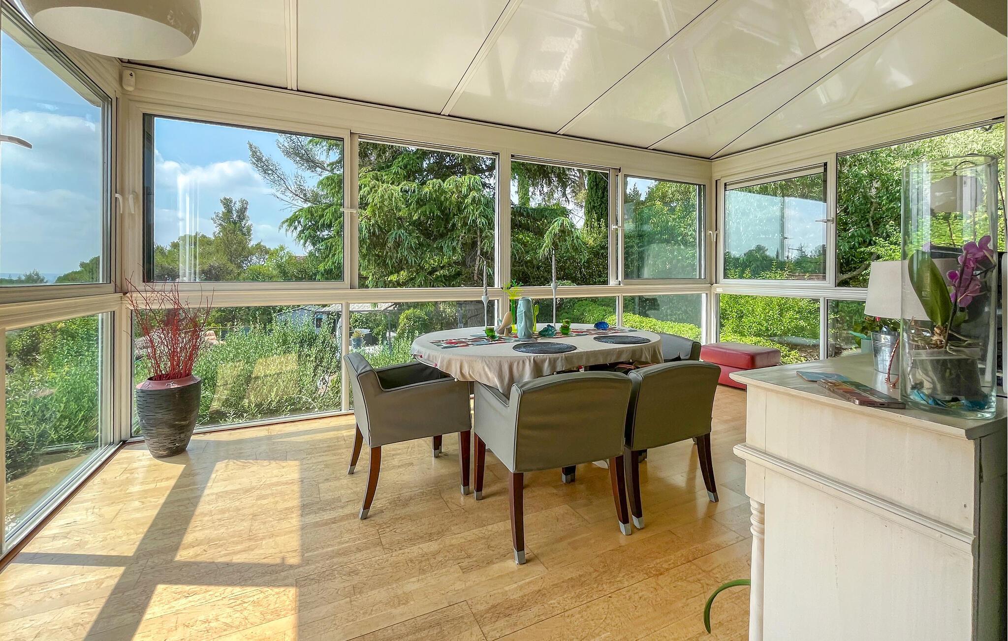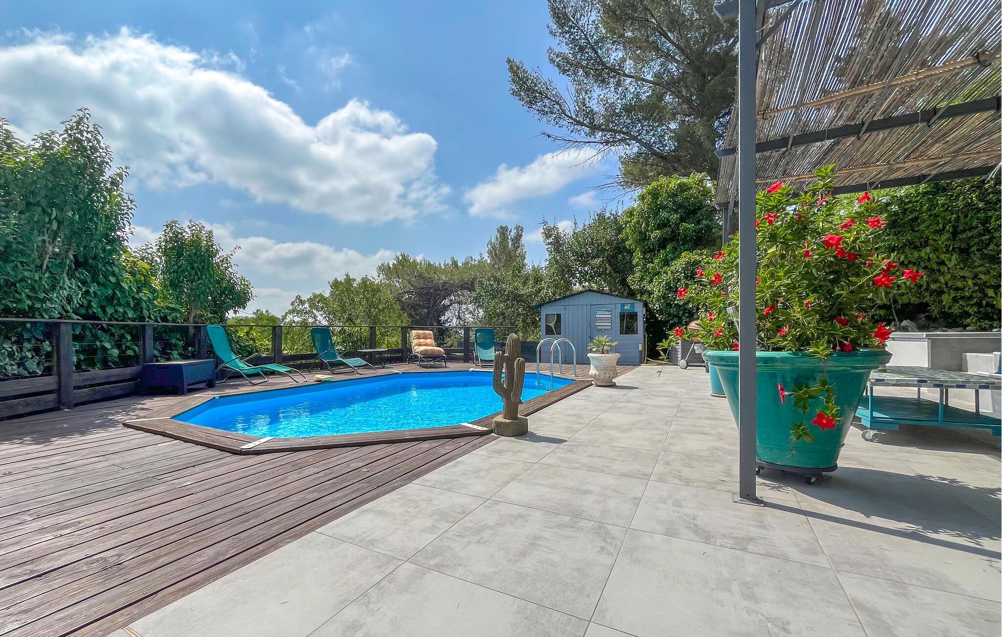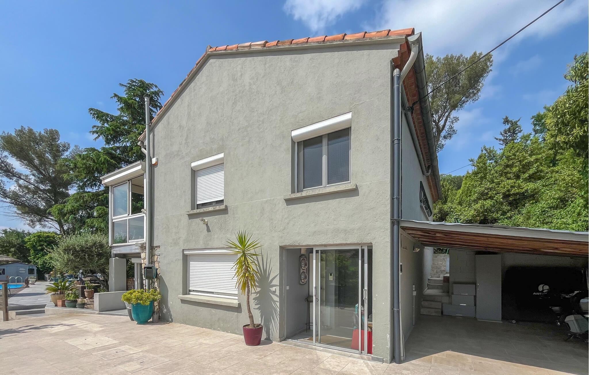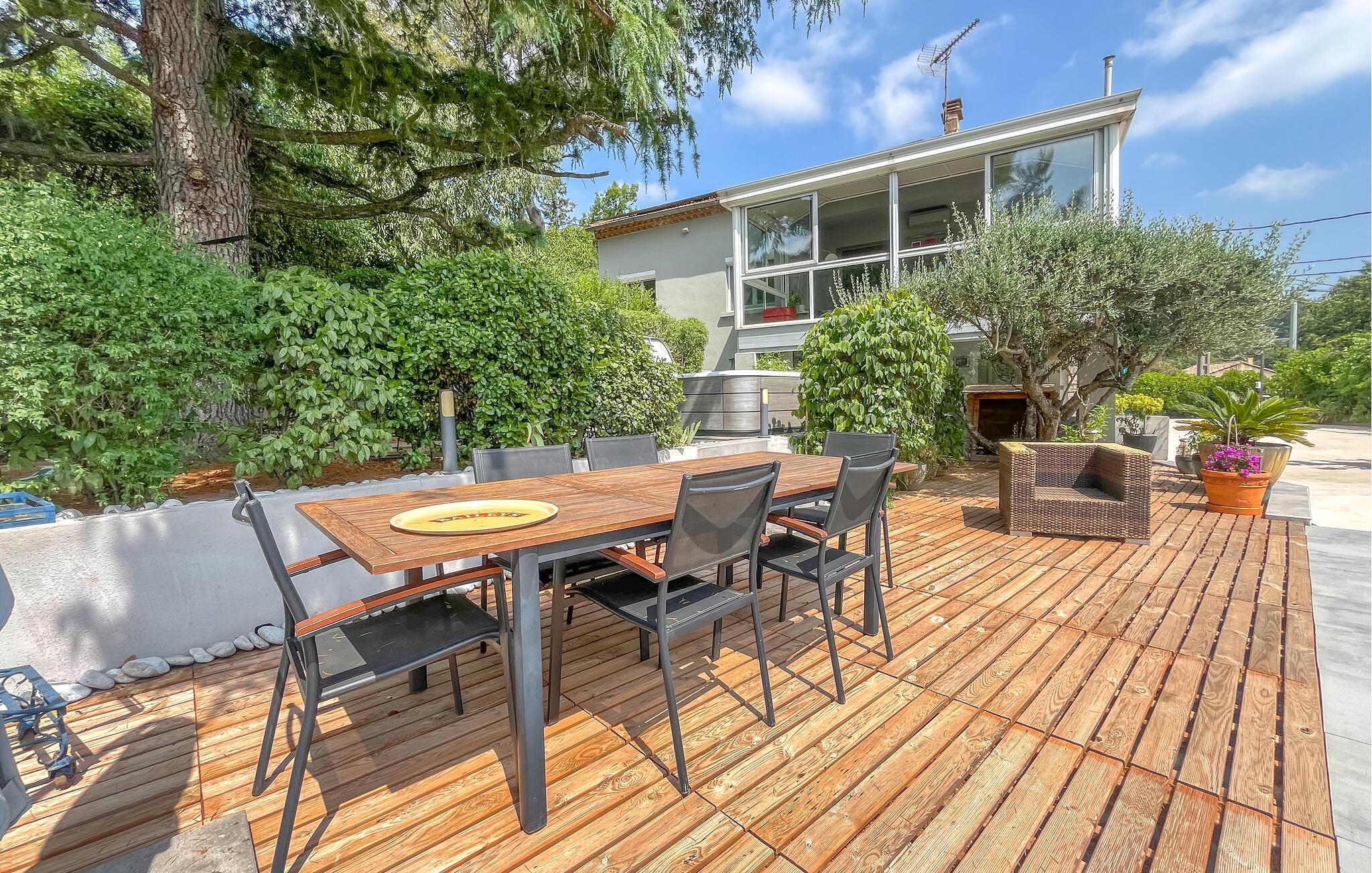 Detta rymliga och smakfullt moderniserade semesterhus ligger på höjderna av Nîmes och erbjuder dig den perfekta utgångspunkten för en mängd olika aktiviteter. Tillaga kulinariska höjdpunkter med färska produkter från veckomarknaden och slå dig ner i den ljusa matplatsen med panoramafönster. Använd den rymliga soffgruppen för mysiga läsesessioner eller sällskapliga spelkvällar.