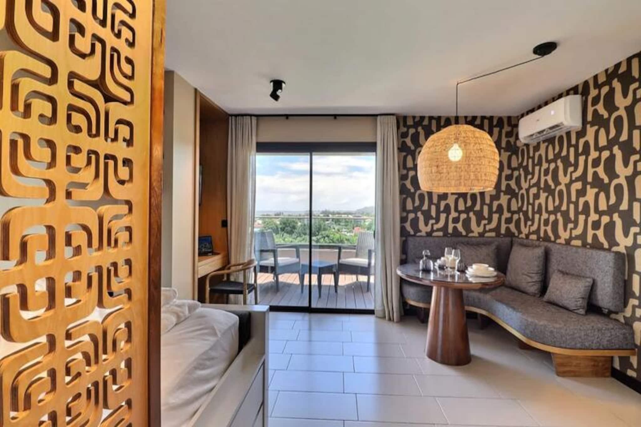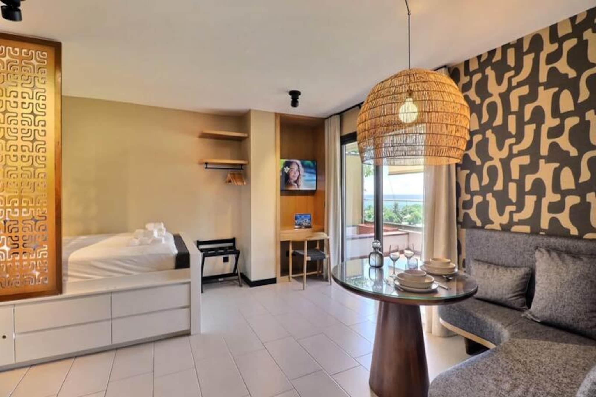 Högt ovanför Papeetes pulserande gator erbjuder Mahana Suite en hisnande tillflyktsort där stadslandskap möter den turkosa lagunen och frodiga berg. Belägen på 8:e våningen i det nyrenoverade Lagon Bleu-residenset, inbjuder denna moderna tillflyktsort dig att fördjupa dig i Polynesiens skönhet medan du njuter av bekvämligheterna i ett modernt boende. Från panoramaterrassen kan du se solen gå upp över havet eller stadens ljus glittra mot natthimlen – en utsikt som känns som ett levande vykort varje ögonblick av din vistelse.\n\nStig in och upptäck ett utrymme designat för avkoppling och elegans. Sviten är helt luftkonditionerad, vilket garanterar komfort i det tropiska klimatet, och har en raffinerad inredning med noggranna ytbehandlingar. Det ljusa vardagsrummet öppnar sig mot terrassen och skapar en sömlös koppling mellan inomhus- och utomhusliv. En mysig sovplats, separerad av en elegant dekorativ skiljevägg, erbjuder avskildhet, medan det moderna köket är utrustat med allt du behöver, inklusive spishäll, kaffebryggare och tvättmaskin. Höghastighets-Wi-Fi och en smart-TV ger underhållning och bekvämlighet, vilket gör denna svit idealisk för både fritids- och affärsresenärer.\n\nGäster i Mahana Suite har också exklusiv tillgång till bekvämligheterna på Lagon Bleu-residenset. Svalka dig i poolen under den tahitiska solen eller ladda batterierna i det välutrustade gymmet. Oavsett om du är här för att utforska Polynesiens underverk eller bara varva ner, erbjuder denna residens den perfekta balansen mellan urban sofistikering och ö-charm.\n\nMed sitt oslagbara läge, fantastiska utsikt och lyxiga bekvämligheter är Mahana Suite din inkörsport till Papeetes magi i stil och komfort.