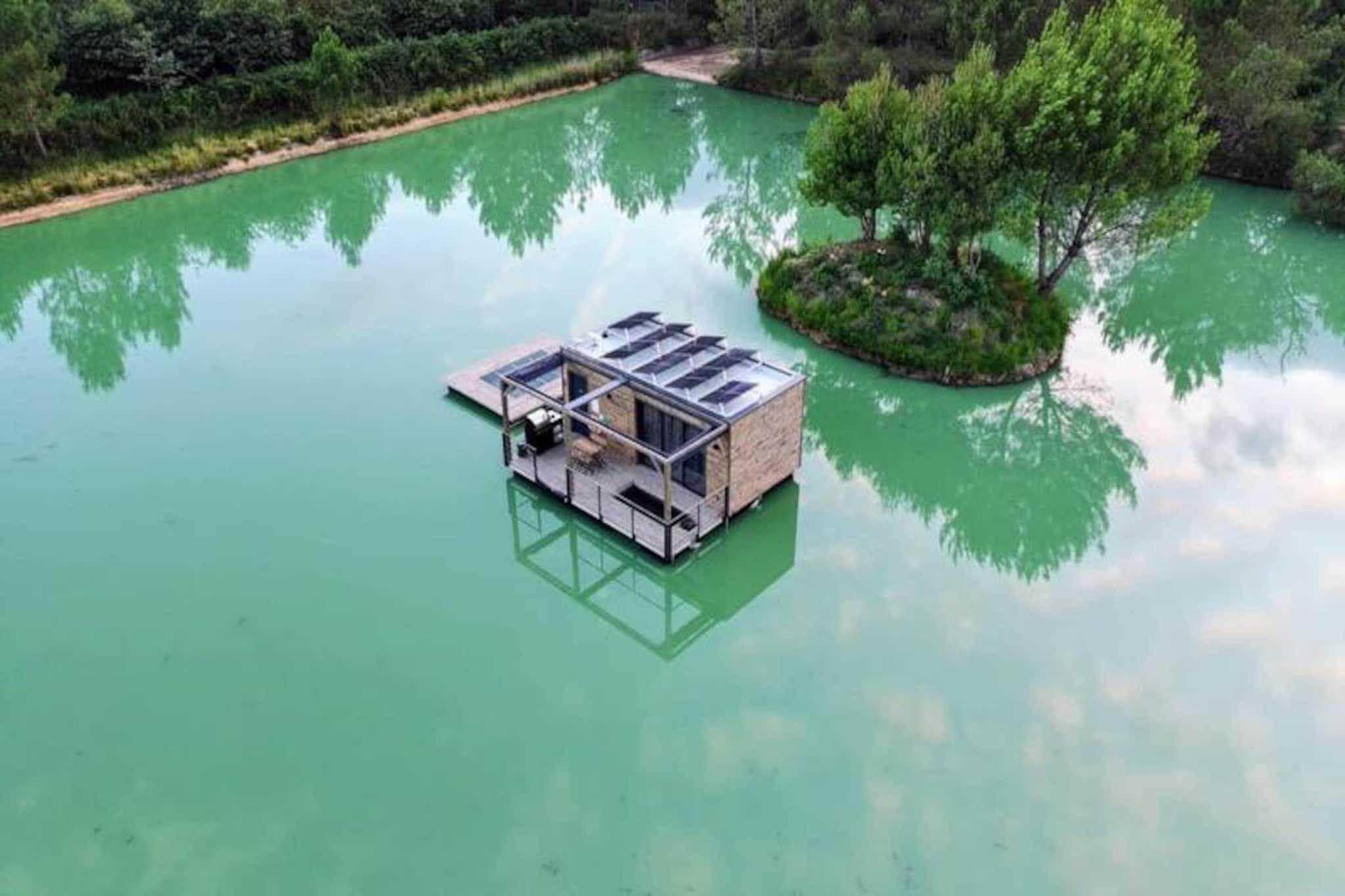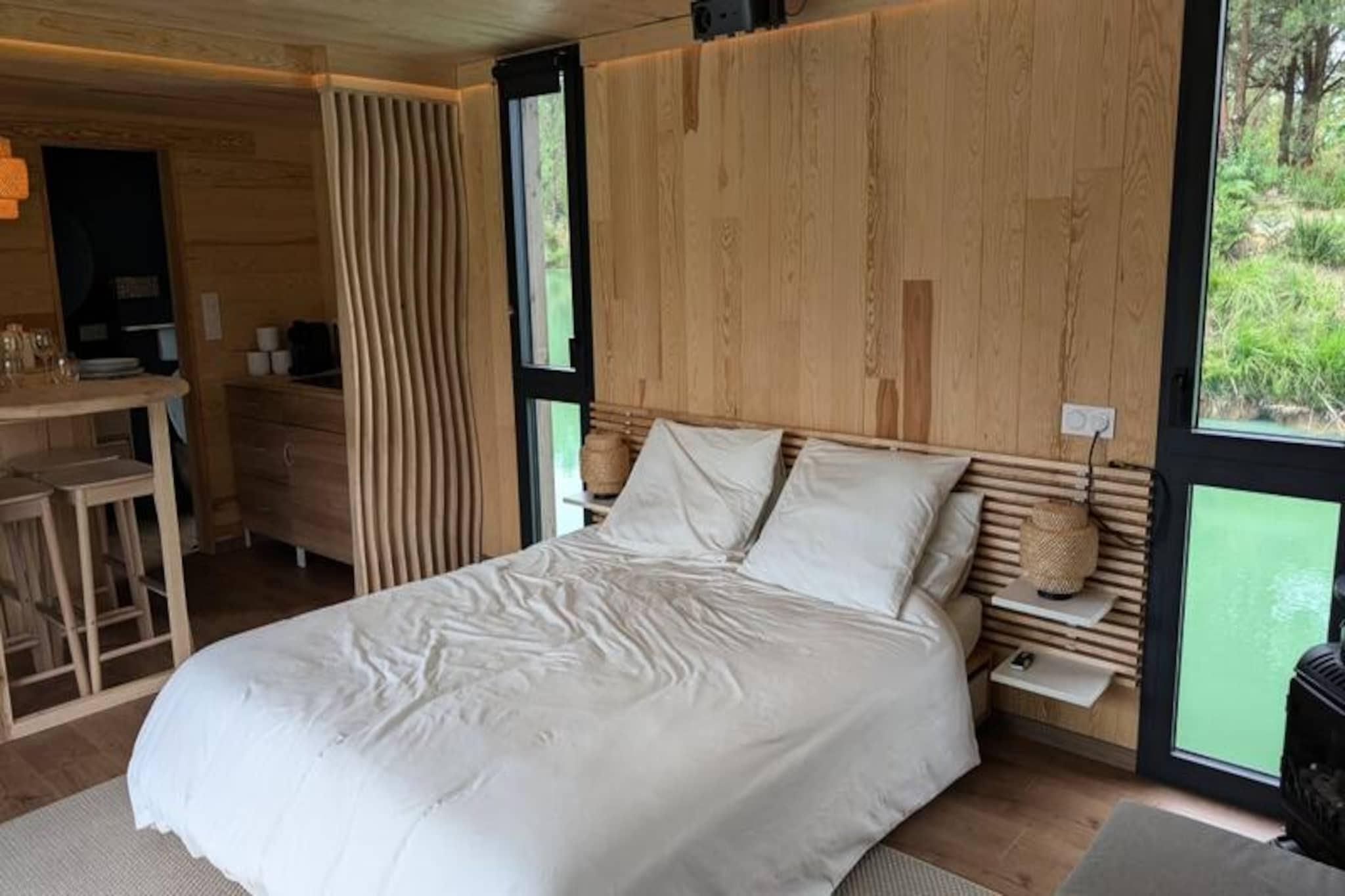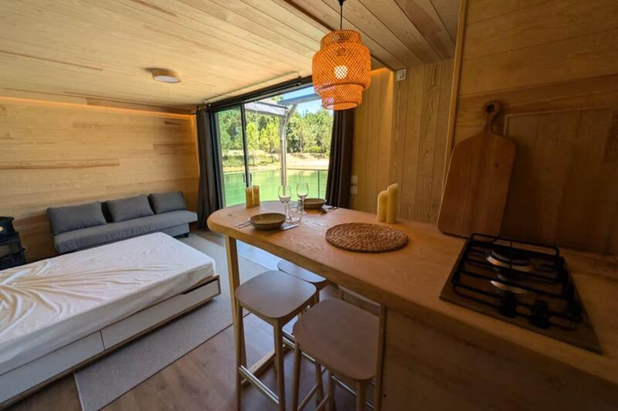 Tänk dig att fly till en fridfull flytande stuga, som vaggar mjukt mitt i en privat damm, omgiven av orörd natur. Här råder lugnet. Det finns inga vägar, inga grannar – bara det lugnande ljudet av vatten och den fascinerande synen av koikarpar som glider graciöst under dina fötter. Denna unika reträtt, som endast nås med motorbåt, inbjuder dig att koppla bort dig från världen och återknyta kontakten med livets enkla nöjen. Stugans minimalistiska design och naturliga miljö skapar den perfekta atmosfären för att varva ner och njuta av varje ögonblick. Inuti hittar du alla bekvämligheter i ett modernt boende. En mysig dubbelsäng och en bäddsoffa rymmer upp till fyra gäster, medan det fullt utrustade köket har kylskåp, gasspis, handfat och kaffebryggare. Badrummet har dusch och miljövänlig toalett med filtrerat vatten för din bekvämlighet. Underhållning finns nära till hands med en videoprojektor som erbjuder Netflix, Prime Video och Disney+. Solenergi och satellit-Wi-Fi säkerställer en självförsörjande men ändå uppkopplad upplevelse. På vintern håller en gasspis dig varm, medan en fläkt ger komfort under sommaren. Stig ut till din privata terrass, komplett med trädgårdsmöbler, gasolgrill och ett hängande nät över vattnet – perfekt för avkoppling och ro i den fridfulla omgivningen. Lodgens miljömedvetna design inkluderar solenergi och avloppsrening genom fytoremediering, vilket säkerställer harmoni med miljön. Tillval som en frukostkorg eller en gourmetcharkuteriskiva ger din vistelse en touch av njutning. Denna avskilda oas ligger bara en timme från Bordeaux och Bergerac och erbjuder den ultimata flykten från vardagens stress och stress. Oavsett om du tittar på koikarpar, lyssnar på vinden i träden eller bara njuter av stillheten, lovar denna flytande lodge en tidlös upplevelse för att återknyta kontakten med naturen och dig själv.