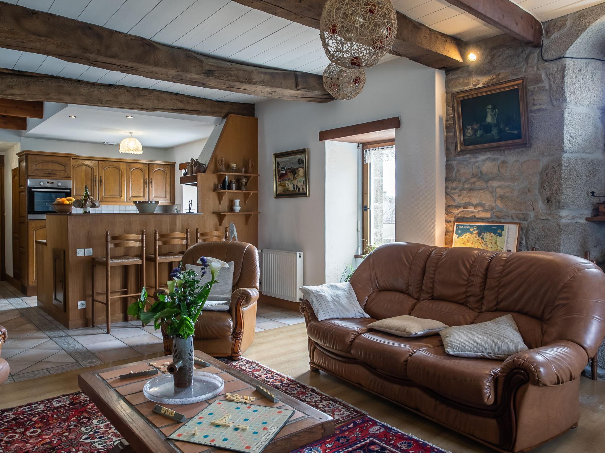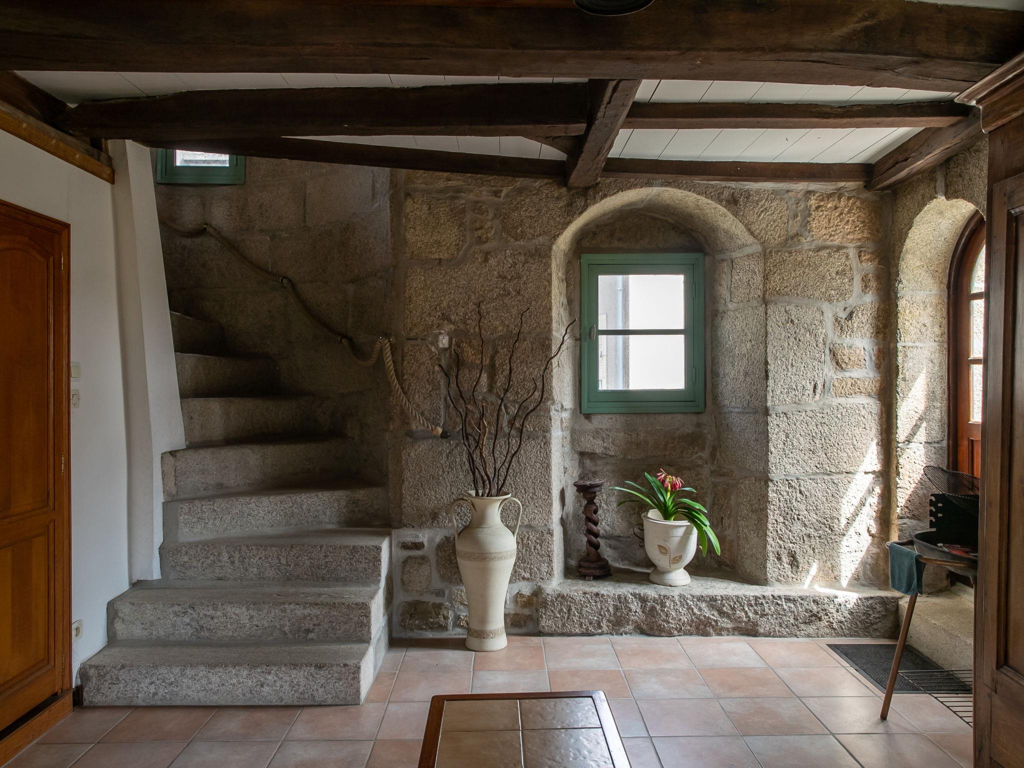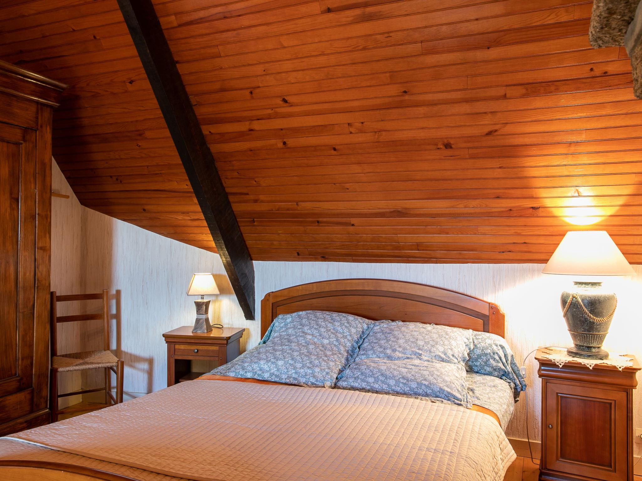 "Manoir des Halles", 4-room house 110 m2 on 2 levels, on the upper ground floor. Beautiful and rustic furnishings: upper floor: living/dining room with open-hearth fireplace, dining table, TV, international TV channels, radio, CD-player and DVD. Open kitchen (1 hot plate, oven, dishwasher, 3 gas rings, toaster, kettle, microwave, freezer, electric coffee machine) with small dining table. Sep. WC. Gas heating. 2nd upper floor: (spiral staircase), 1 room with 1 french bed (140 cm, length 190 cm), bath/WC. 2 rooms, each room with 1 french bed (140 cm, length 190 cm), shower/WC. Balcony, south facing position and west facing position. Terrace furniture, barbecue (portable), deck chairs (2). Facilities: washing machine, dryer, iron, children's high chair, baby cot. Internet (WiFi, free). Please note: non-smoking house. Maximum 1 pet/ dog allowed. If the additional bed is not reserved, the room with the single bed remains closed. 29185 000058B1