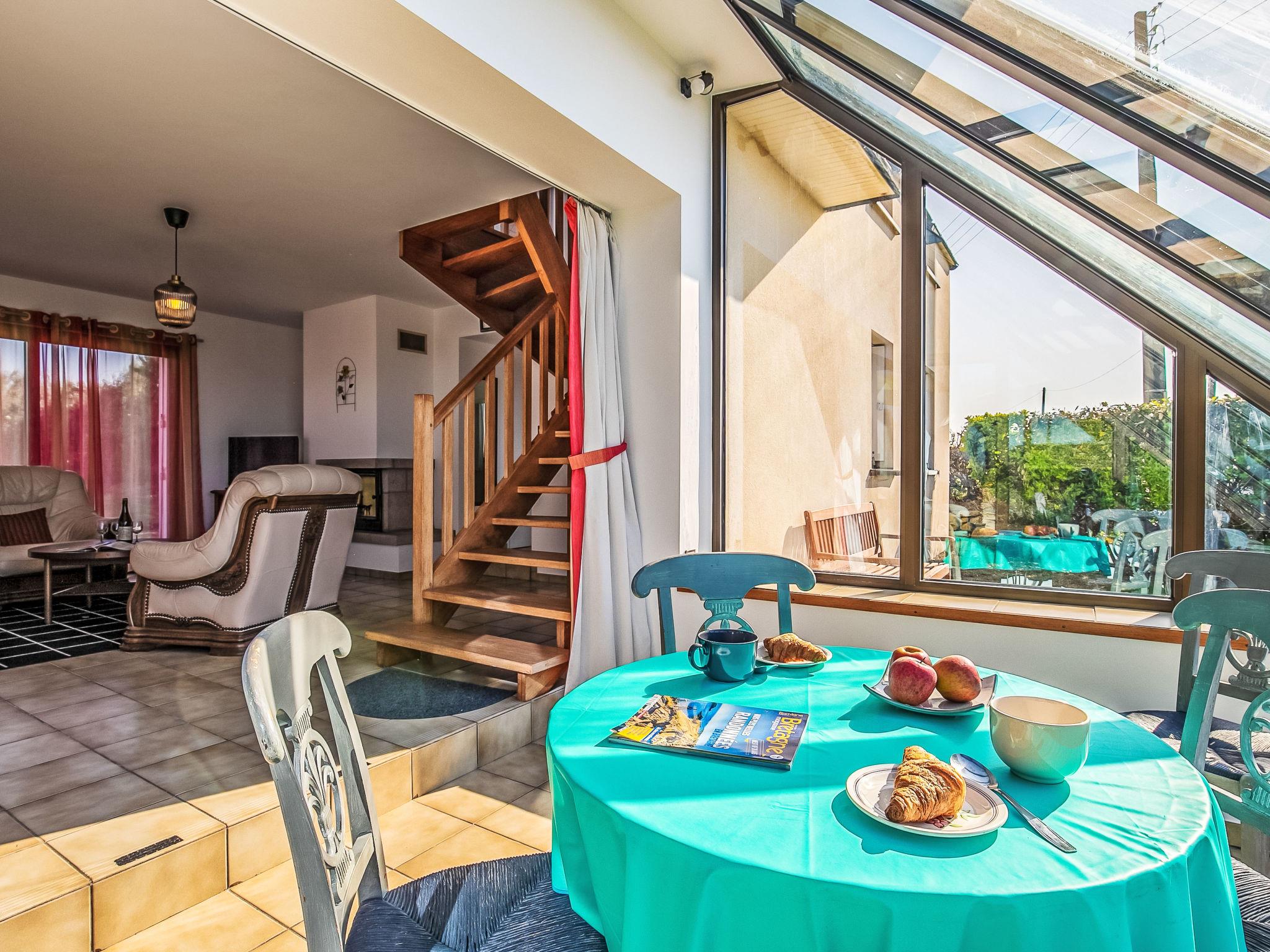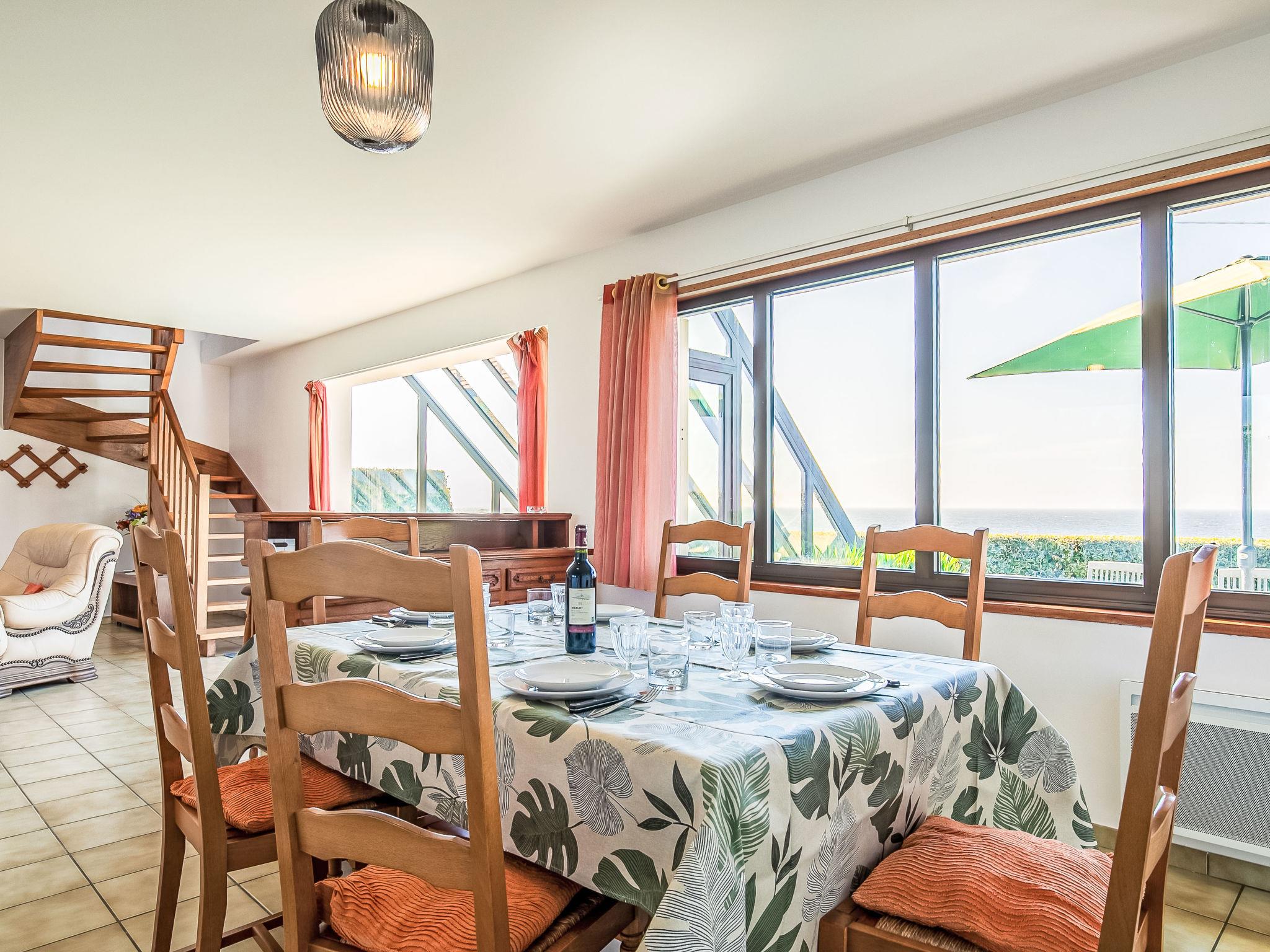 "Les Romarins", 5-room house 140 m2 on 2 levels. Comfortable and cosy furnishings: living/dining room with panoramic window with Scandinavian wood stove, dining table and satellite TV. Exit to the garden. 1 room with 1 double bed. Open kitchen (1 hot plate, oven, dishwasher, 3 gas rings, toaster, kettle, microwave, freezer, electric coffee machine). Shower, sep. WC. Upper floor: living room. 2 rooms with sloping ceilings, each room with 2 beds. Bathroom, sep. WC, double hand-basin. Electric heating. Terrace. Terrace furniture, barbecue (portable), deck chairs (2), box-room. Beautiful panoramic view of the sea. Facilities: washing machine, iron, children's high chair, baby cot. Internet (WiFi, extra). Please note: non-smoking house. Smoke alarm.