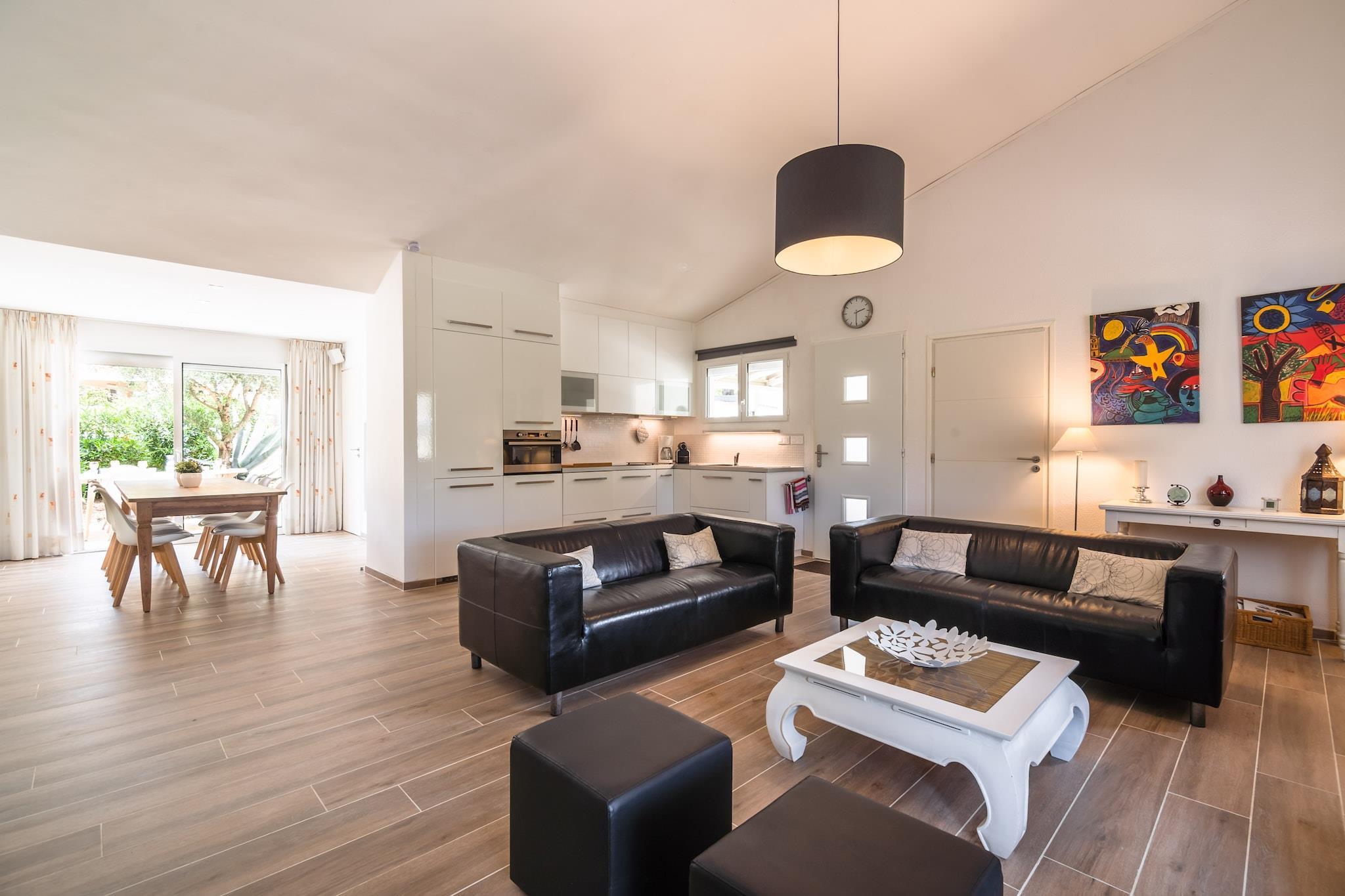 Bottenvåningen: (Vardagsrum(TV(platt-tv), matbord, öppen spis, sitthörna, fransk balkong, luftkonditionering), Kök(Kokplattor(Spis med 4 kokplattor, induktion), brödrost, Fläkt, kaffebryggare(koppar, kaffetratt, kaffekapslar), kombi ugn/mikro, diskmaskin, kylskåp, frys), sovrum(2x enkelsäng(90 x 200 cm)), sovrum(2x enkelsäng(90 x 200 cm)), sovrum(2x enkelsäng(90 x 200 cm)), badrum(dusch(Duschkabin), handfat, toalett ), badrum(dusch(Duschkabin), handfat, toalett ), WC, grovkök(tvättmaskin, strykbräda, strykjärn)) utomhuskök, dusch, fransk balkong, terrass(tak), terrass, trädgård(privat, anlagd trädgård, upplyst, 1500 m2), trädgårdsmöbler, solstole, grill(träkol), swimmingpool(privat, 10 x 5 m.), boule