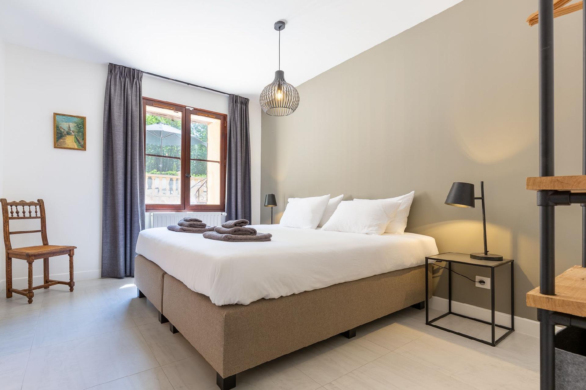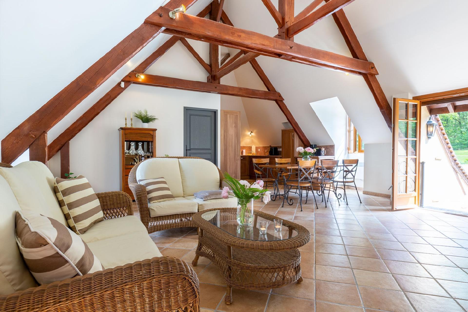 On the ground floor, there are three bedrooms each with a private bathroom, a spacious and well-equipped kitchen and a cosy living room with a dining table and cosy seating area overlooking the front garden full of fruit trees. Outside the summer period, you can also rent only this part. On the upper floor - accessible via an external staircase - there is a second kitchen, living room and two bedrooms, ideal for accompanying grandparents or teens who appreciate a little extra privacy.