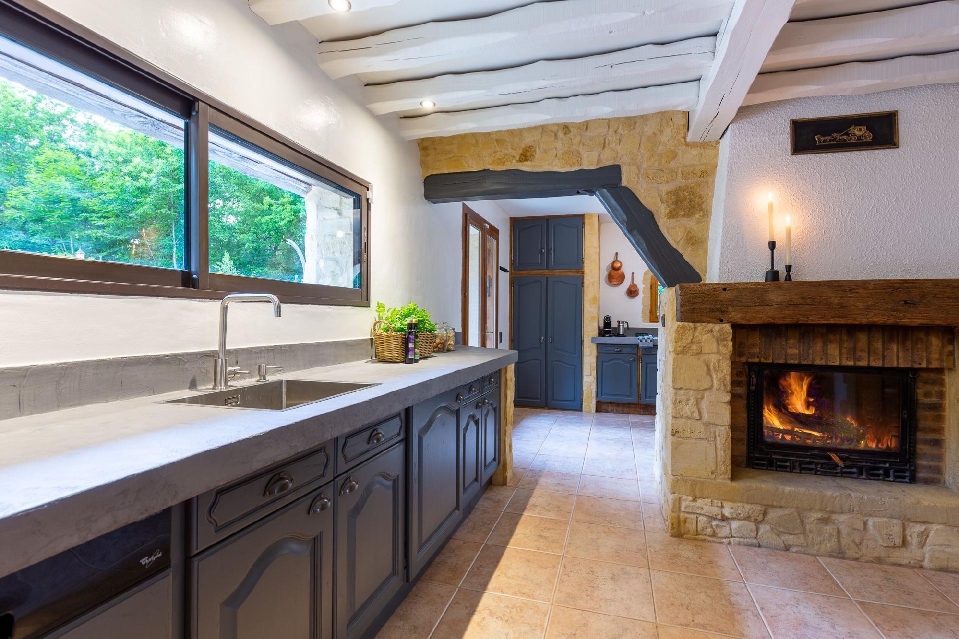 Very spacious kitchen with a fireplace and all modern appliances including an American fridge, microwave, oven, gas hob, air fryer, toaster, dishwasher and washing machine. There is a separate coffee corner in the kitchen with a Nespresso machine, milk frother, classic coffee maker and kettle.