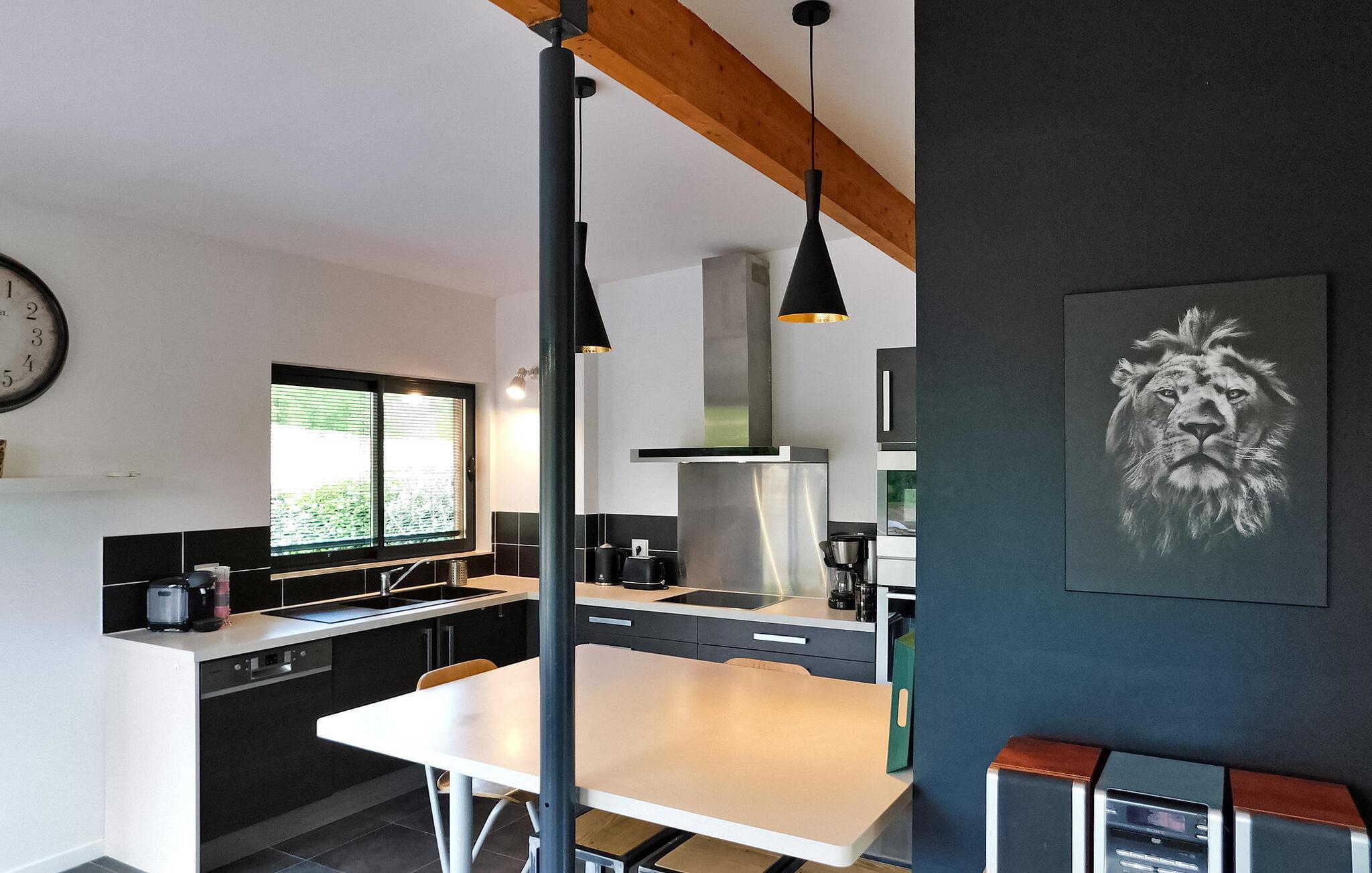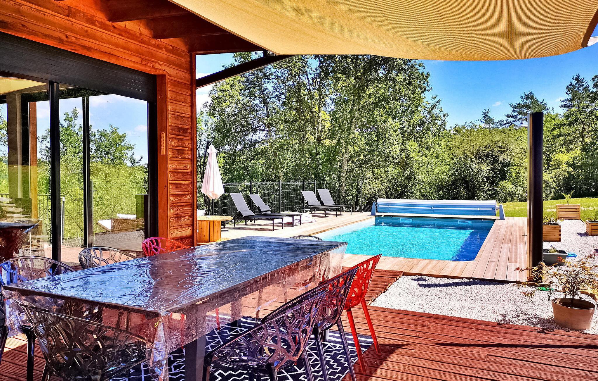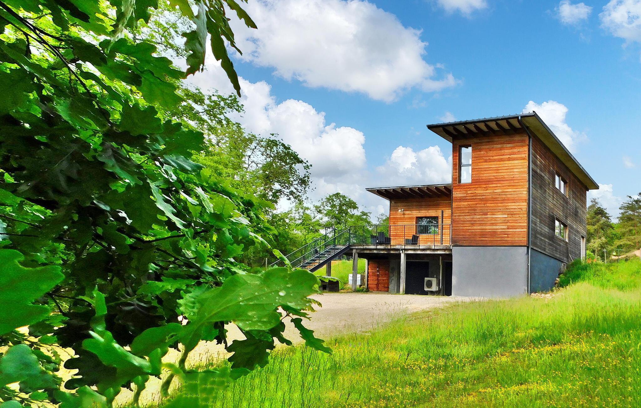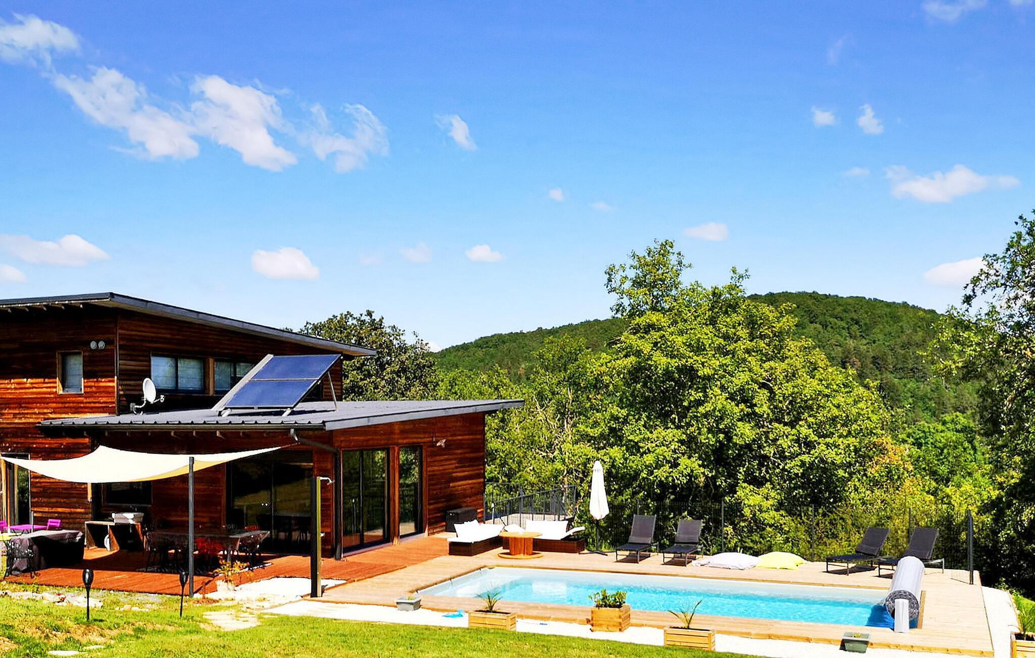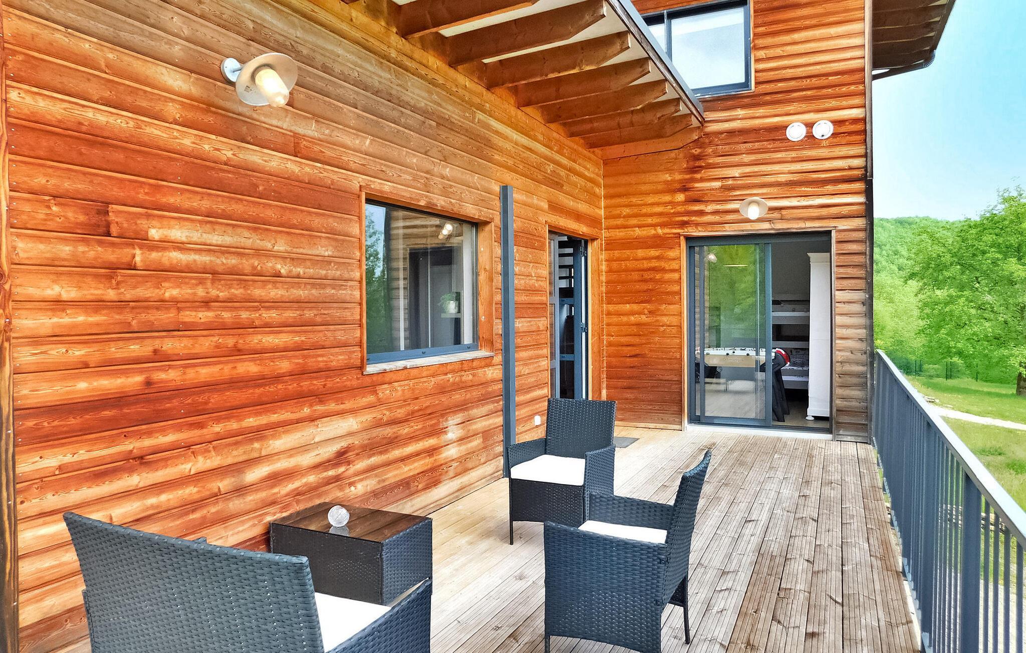 Detta moderna semesterhus i trä i Dordogne ligger i en fridfull lantlig miljö nära Saint Amand de Coly. Huset har en luftkonditionerad och ljus bottenvåning med en mysig sittgrupp, en matplats och ett kök med öppen planlösning utrustat med de viktigaste apparaterna. Det finns också två sovrum på bottenvåningen, varav det ena är utrustat med våningssängar och ett fotbollsbord för barn. På övervåningen finns två luftkonditionerade sovrum och ett gemensamt duschrum. På tomten finns en privat uppvärmd pool, en lekplats med studsmatta och lekstuga, flera terrasser med trädgårdsmöbler och en plancha. Observera att huvudingången sker via en trätrappa med ledstänger och en grind. På vintern värms huset upp med en pelletskamin. Huset ligger på landsbygden utanför byn Saint-Amand-de-Coly (lokal livsmedelsbutik, restaurang och bröddepå).