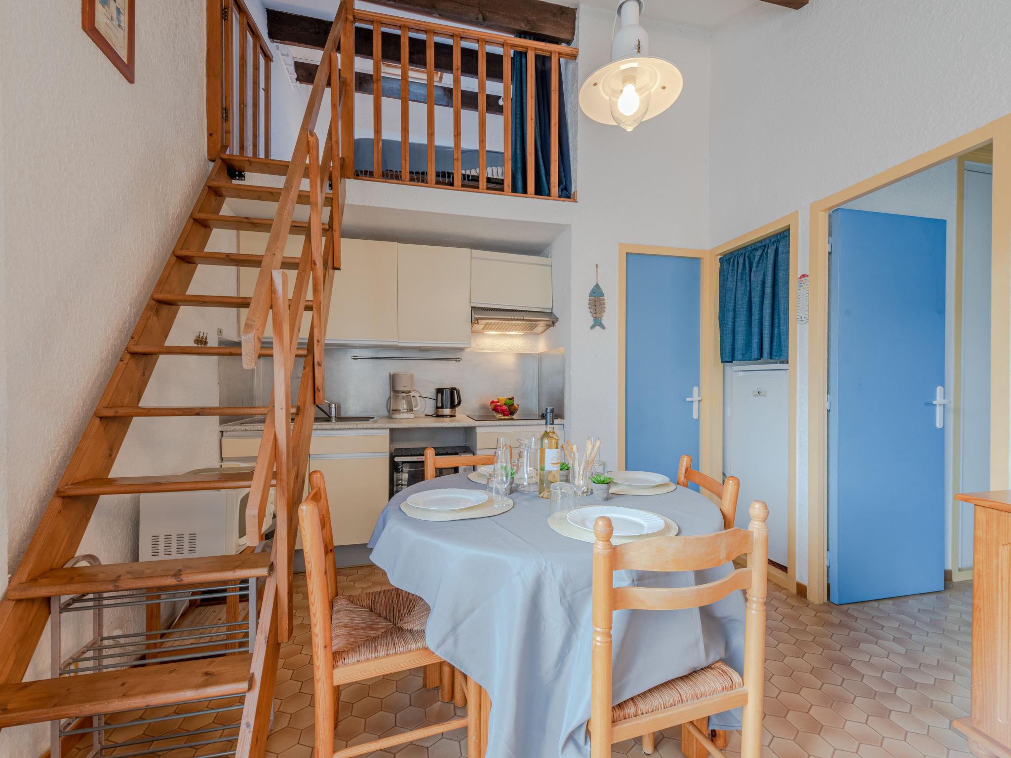 2-room apartment 28 m2 on 1st floor. Living/dining room with TV. Exit to the terrace. 1 room with 1 french bed (140 cm, length 190 cm). Kitchenette (mini-oven, 4 ceramic glass hob hotplates, toaster, kettle, microwave, freezer, electric coffee machine). Shower/WC. Electric heating, air-conditioning. Upper floor: (steep stair) open gallery with sloping ceilings, ceiling height 120 - 190 cm with 1 bed (140 cm, length 190 cm). Terrace, north-east facing position. Terrace furniture. Facilities: washing machine, iron, baby cot, hair dryer. Internet (WiFi, extra). Parking space n C11 E5. Please note: smoke alarm. Offer by a private individual according to Art. 155, IV of CGI.