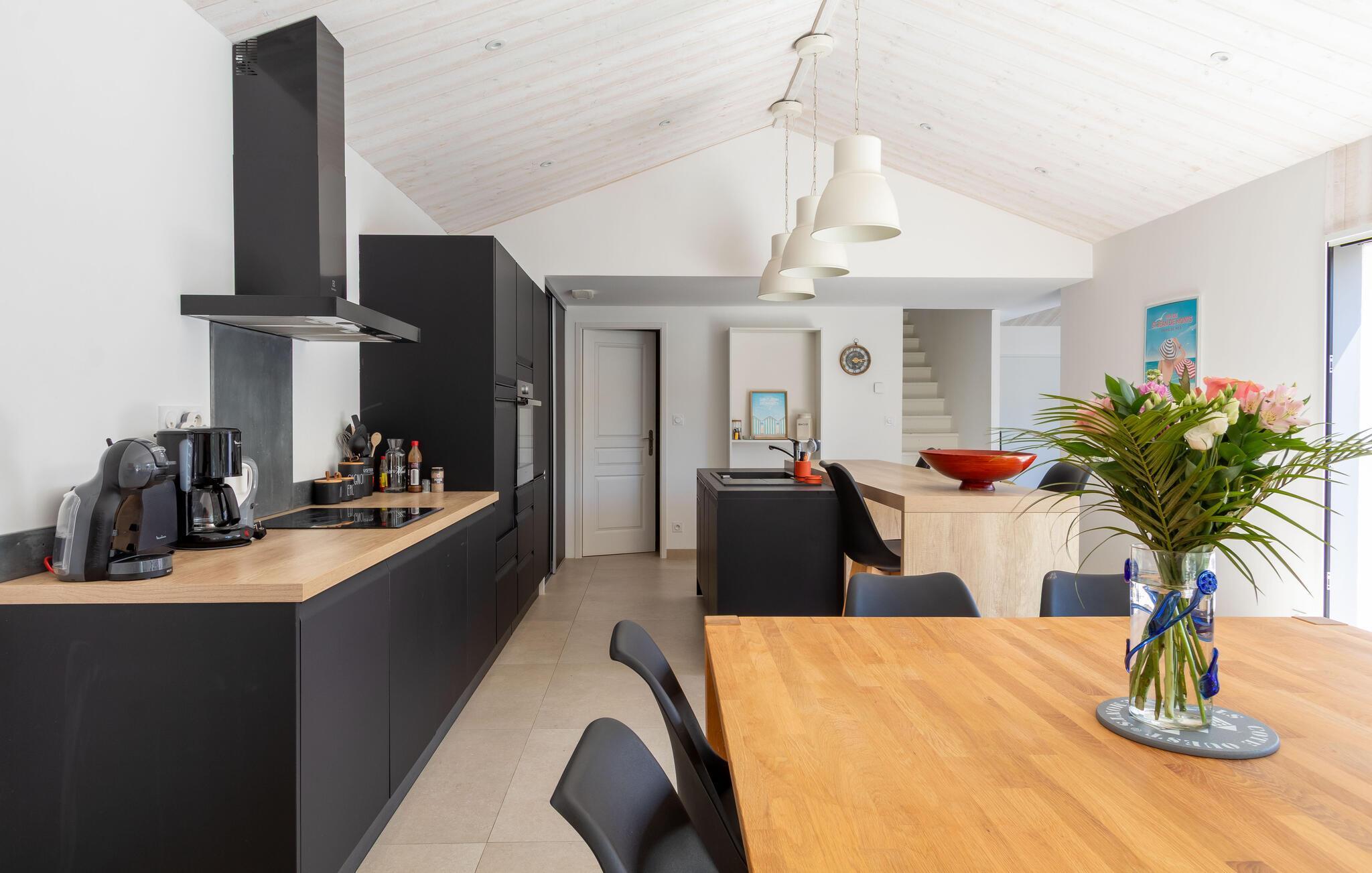 Detta barnvänliga semesterhus välkomnar dig med en ljus och bekväm vardagsrumsdel där du kan njuta av avkopplande dagar med vänner eller familj. Njut av trevliga matlagningskvällar och glada måltider och gör dig bekväm i det rymliga vardagsrummet för harmoniska spelkvällar eller lugn lästid.
