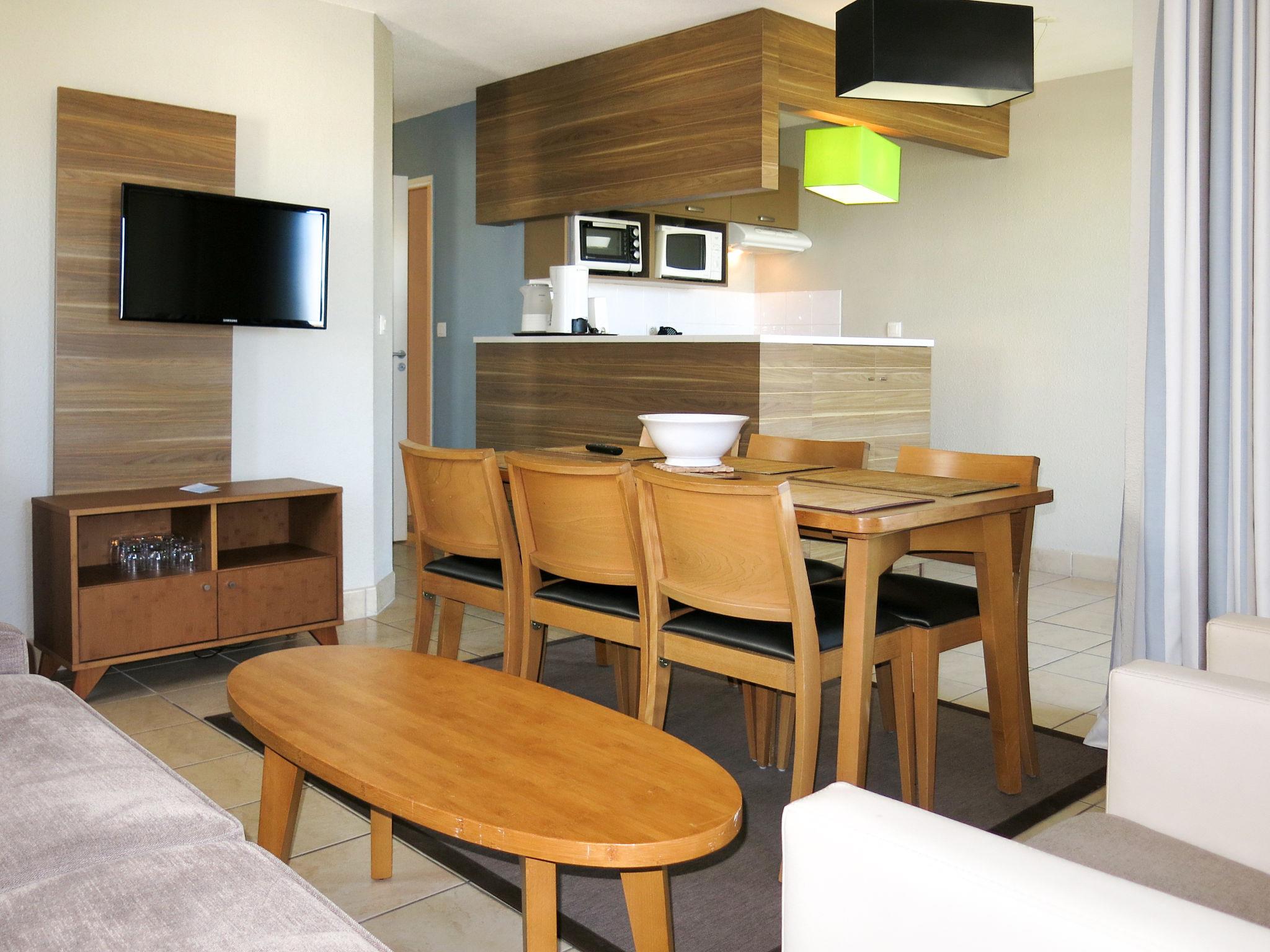 "Reine Marine - T3 Balcon Lat. Mer", 3-room apartment 54 m2. Comfortable and beautiful furnishings: living/sleeping room with 1 double sofabed (140 cm, length 200 cm), dining table and satellite TV. Exit to the balcony, to the terrace. 2 rooms, each room with 2 beds (90 cm, length 200 cm). Kitchenette (oven, dishwasher, 4 ceramic glass hob hotplates, toaster, kettle, microwave, electric coffee machine). Bath/shower, sep. WC. Electric heating. Balcony or terrace. Terrace furniture. Side view of the sea. Facilities: children's high chair, baby cot. Internet (WiFi, free). Please note: maximum 1 pet/ dog allowed. Smoke alarm. Offer by a commercial proprietor according to Art. 155, IV, CGI