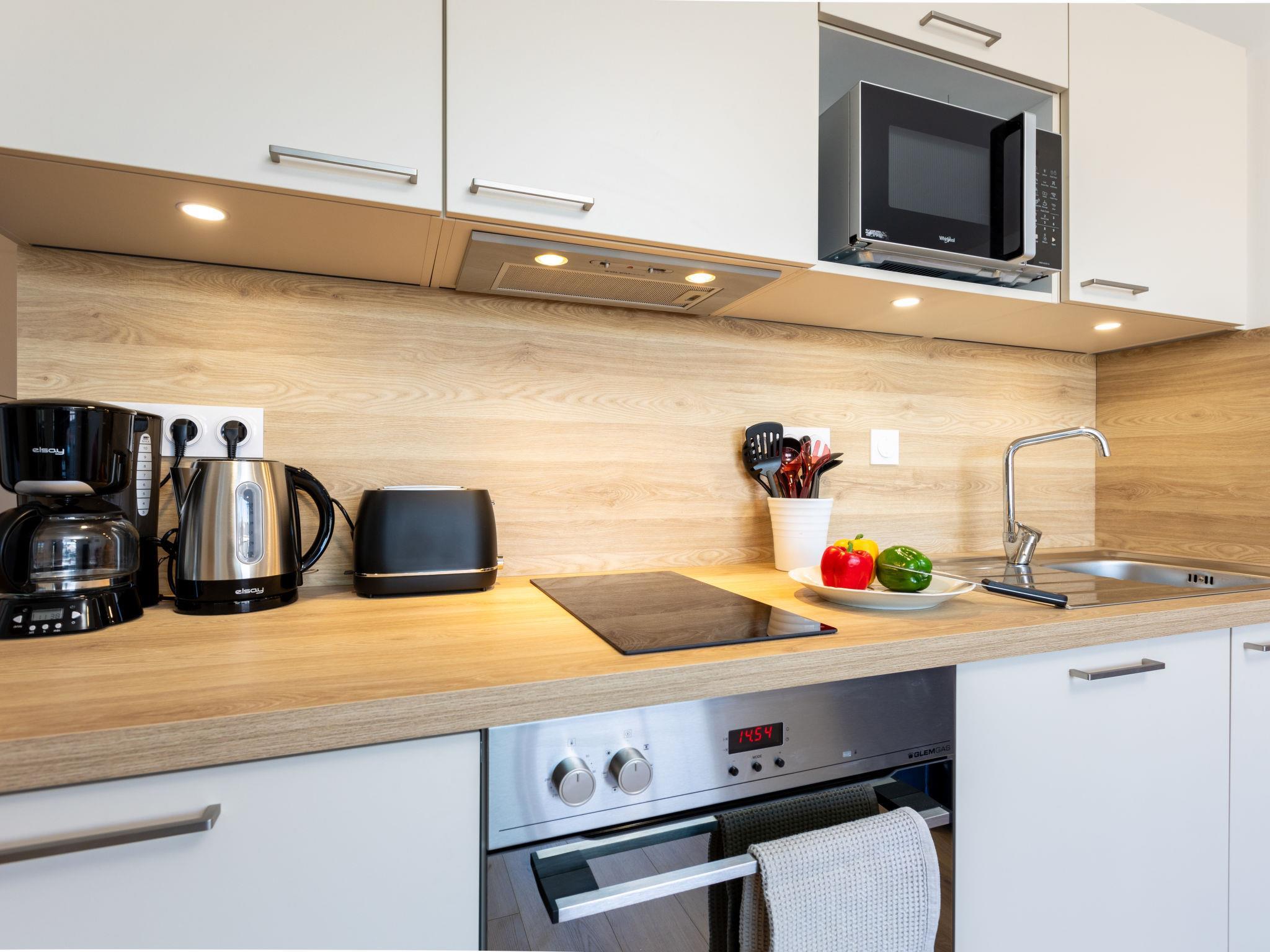 2-room apartment 41 m2 on 2nd floor. Modern and tasteful furnishings: large living/dining room with 1 double sofabed (1 x 160 cm, length 200 cm), TV (flat screen). Exit to the terrace. 1 room with 1 french bed (2 x 80 cm, length 200 cm). Exit to the terrace. Open kitchen (oven, dishwasher, 3 induction hot plates, toaster, kettle, microwave, electric coffee machine). Shower, sep. WC. Gas heating. Terrace 12 m2. Terrace furniture. Facilities: washing machine, hair dryer. Internet (WiFi, free). Parking space n 20 (roofed, fenced 1 car). Please note: smoke alarm. 352880036095F