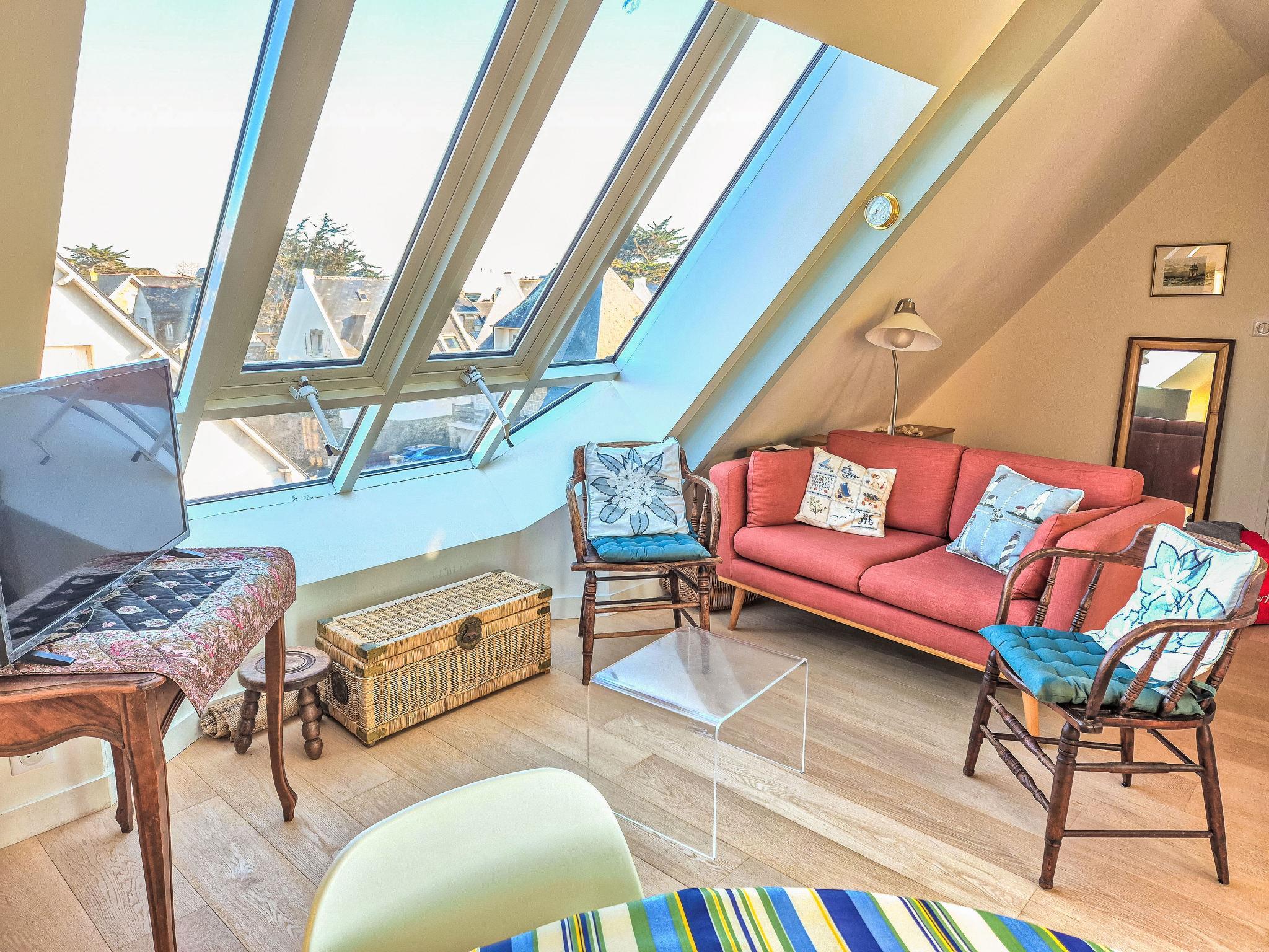 "Fleurs d'Ajoncs", 5-room maisonette 61 m2. Bright, partly with sloping ceilings, comfortable and beautiful furnishings: large living/dining room with sloping ceilings with CD-player and hi-fi system. Exit to the terrace. 1 room with 1 bed (90 cm, length 190 cm). 1 room with 1 french bed (1 x 160 cm, length 200 cm). Open kitchen (oven, dishwasher, 3 induction hot plates, toaster, kettle, microwave, electric coffee machine, Capsules for coffee machine (Nespresso) extra). Shower/WC. On the lower ground floor: 1 room with 2 beds (90 cm, length 190 cm). 1 room with 1 french bed (1 x 140 cm, length 190 cm). Exit to the balcony. Shower/WC. Electric heating, boiler (200 litres). Very beautiful view of the sea. Facilities: washing machine, dryer. Internet (WiFi, free). Please note: non-smokers only. Smoke alarm. 35288803076D4