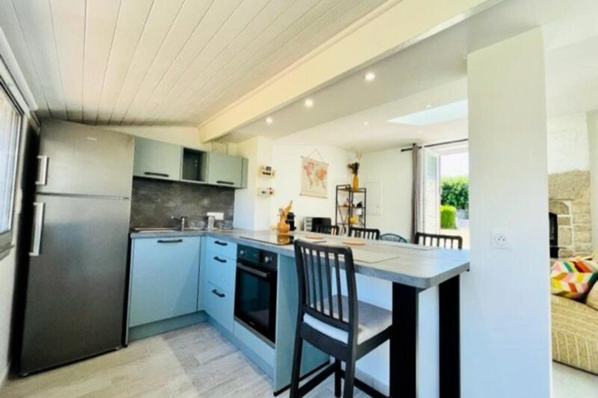 Denna charmiga etagevåning T2, helrenoverad och täcker 50 m², är idealisk för upp till 4 gäster. Beläget i det fridfulla Kervihan-området i Saint-Pierre Quiberon, erbjuder fastigheten ett mysigt vardagsrum med en 140 cm bäddsoffa och en TV, perfekt för avkoppling efter en dag av utforskning. Det öppna, fullt utrustade köket har moderna apparater som ugn, kylskåp, induktionshäll, Nespresso-kaffebryggare, vattenkokare, brödrost och mikrovågsugn, med ett högt bord och pallar för avslappnad middag. Sovrummet har en bekväm säng på 140 cm, medan badrummet är utrustat med dusch och toalett. Boendet tillåter inte husdjur. Bara 700 meter från den vilda kusten och 1 km från stranden Port-Bara, är denna etagevåning idealiskt belägen för att njuta av den fantastiska naturen. Saint-Pierre Quiberon är känt för sina vackra stränder och lugna atmosfär, vilket ger en perfekt bas för utomhusaktiviteter. Med flera natursköna promenader och närliggande attraktioner har du mycket att utforska. Boendet ligger också en kort bilresa från lokala butiker, kaféer och restauranger. Etagevåningen har två inhägnade trädgårdar: en 25 m² stor trädgård i söderläge med utemöbler och en ytterligare 400 m² trädgård för ytterligare avkoppling. Fastigheten erbjuder bekvämligheten med parkering för upp till 3 fordon och är utrustad med täcken för en bekväm vistelse. Valfria tjänster som slutstädning, hyra av sängkläder och barnomsorgsutrustning finns tillgängliga. Uppvärmnings- och energikostnader ingår från 25 maj till 28 september 2024.