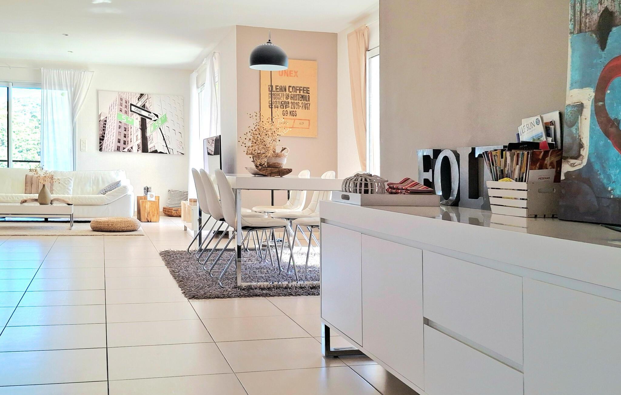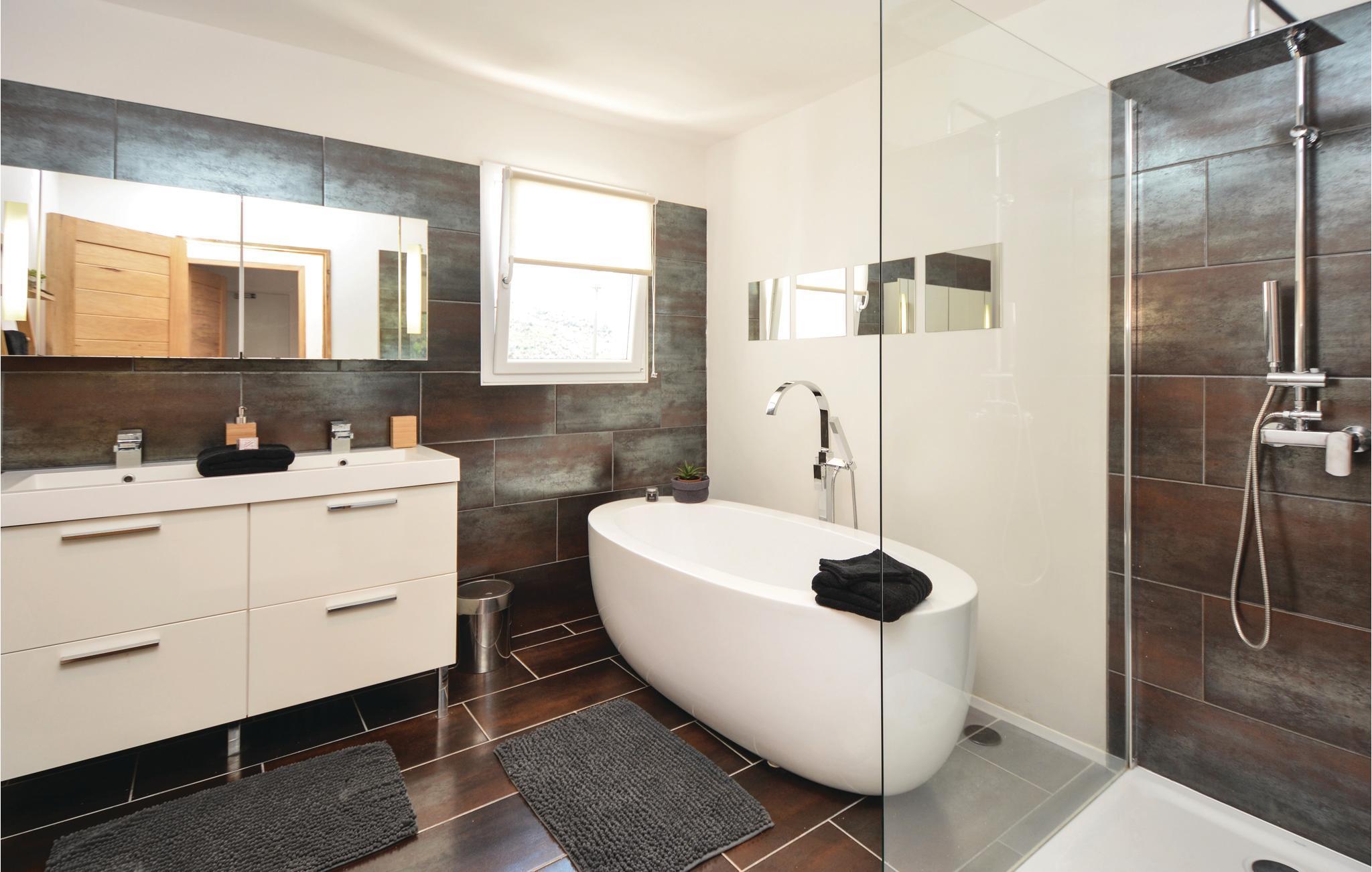 Förutom ett ultramodernt kök med matlagningsö som öppnar sig mot det stora vardagsrummet har det smakfullt inredda boendet även ett badrum med både badkar och dusch.