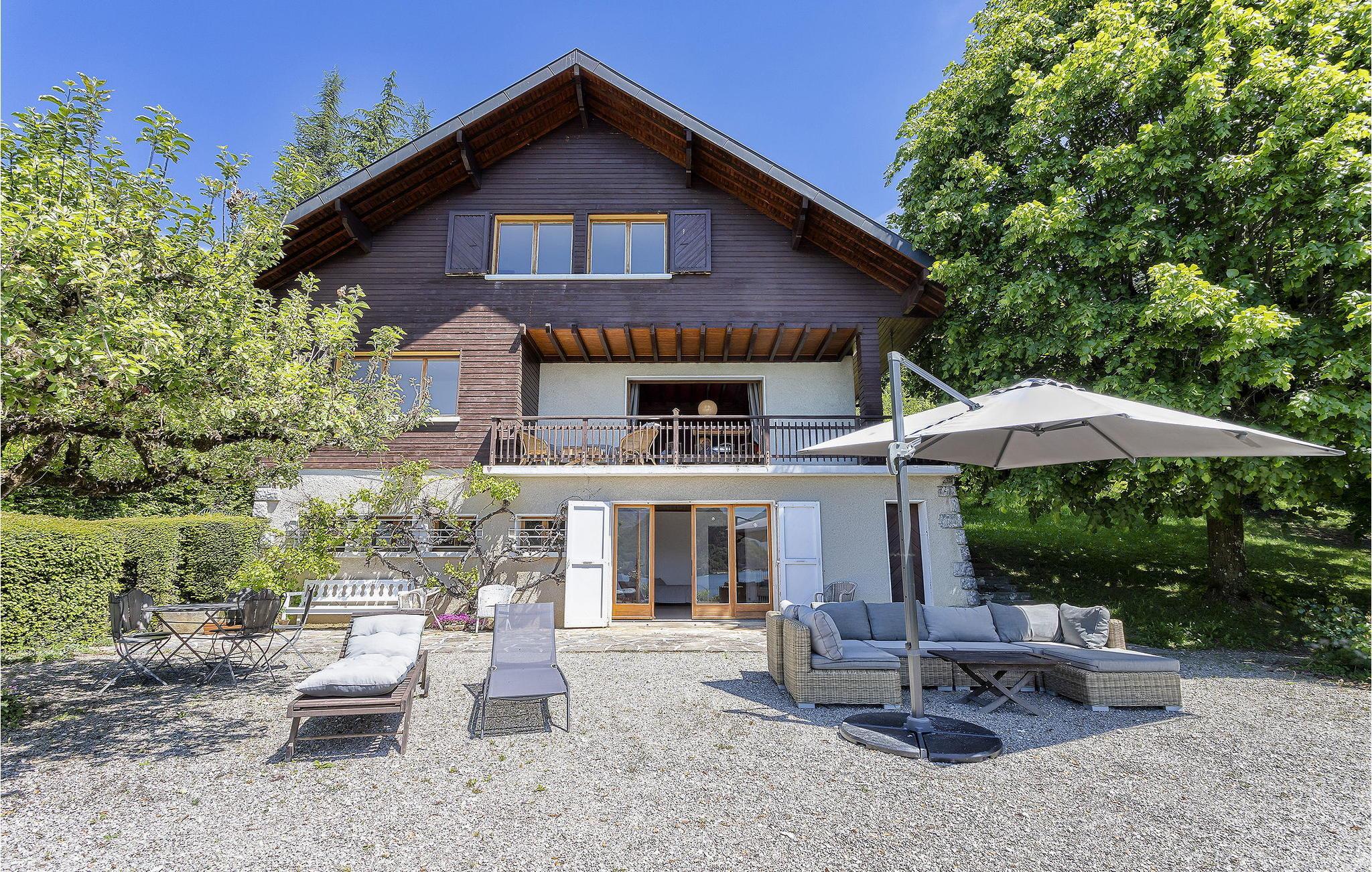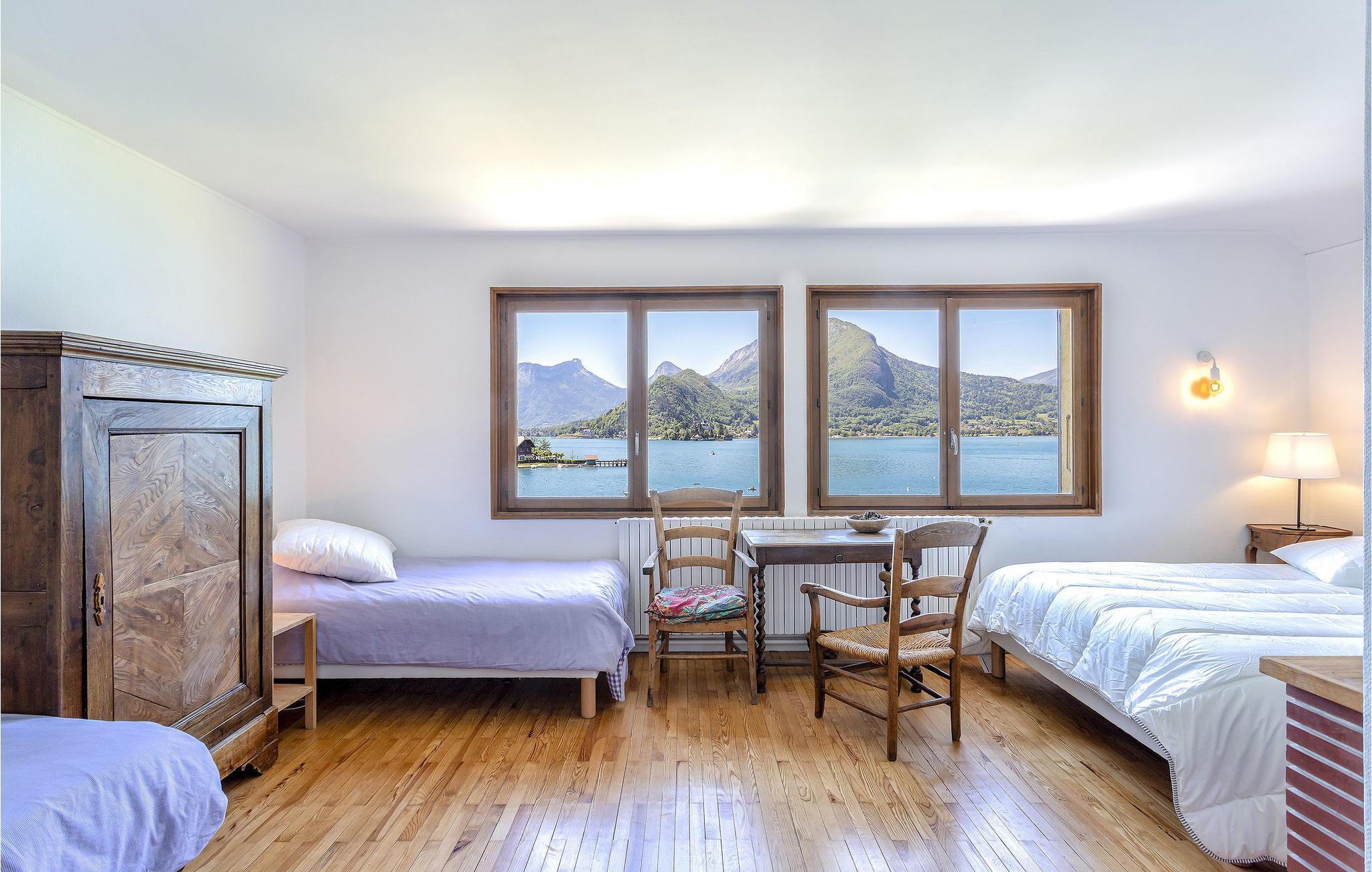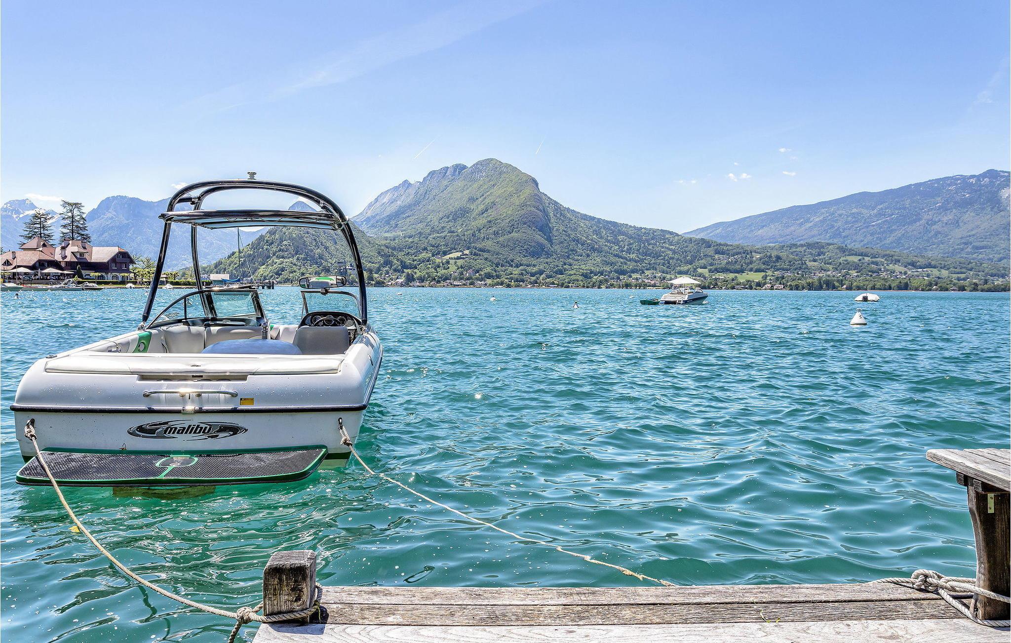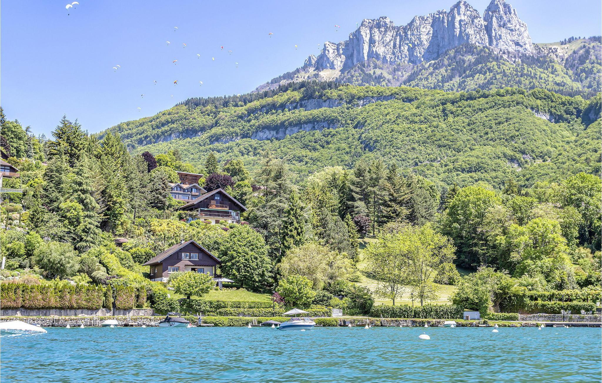 Detta familjevänliga semesterhus ligger i hjärtat av Talloiresbukten och erbjuder en hisnande panoramautsikt över Annecysjön, som sträcker sig från Talloiresbukten till slottet Duingt. Detta rymliga boende har på bottenvåningen ett vardagsrum och ett sovrum med magnifik sjöutsikt och tillgång till trädgården, ett duschrum, en tvättstuga och en stor utomhusterrass med utsikt över sjön. Första våningen består av ett vardagsrum med sjöutsikt, ett separat, välutrustat kök och två sovrum med enastående utsikt över sjön och trädgården och ett gemensamt badrum. På översta våningen finns ytterligare sovrum, alla bekvämt inredda och med olika utsikter över det omgivande området, samt ett praktiskt duschrum. Utanför fastigheten finns en helt inhägnad trädgård med en stor terrass vid sjön, gräsmattor, ett skogsområde och trädgårdsmöbler. Bilparkering för fyra bilar finns tillgänglig. Observera att snöutrustning krävs under vintermånaderna och att barn måste vara under uppsikt hela tiden på grund av fastighetens läge vid sjön. Huset ligger i hjärtat av Talloiresbukten vid Annecysjön och har ett idealiskt läge för att njuta av de berömda restaurangerna i Talloiresbukten och många sport- och kulturaktiviteter. Vattensportaktiviteter äger rum precis utanför dörren till Cercle Nautique de Talloires: Segling, rodd, paddeluthyrning, kajaker och, i bukten, vattenskidåkning och uthyrning av trampbåtar. Alla lokala butiker i Talloires ligger cirka 700 meter bort, inklusive ett bageri, livsmedelsbutik och restauranger. Njut av skönheten i Talloires Bay och Annecysjön från detta charmiga familjesemesterhus, som lovar en oförglömlig vistelse i hjärtat av en pittoresk miljö.