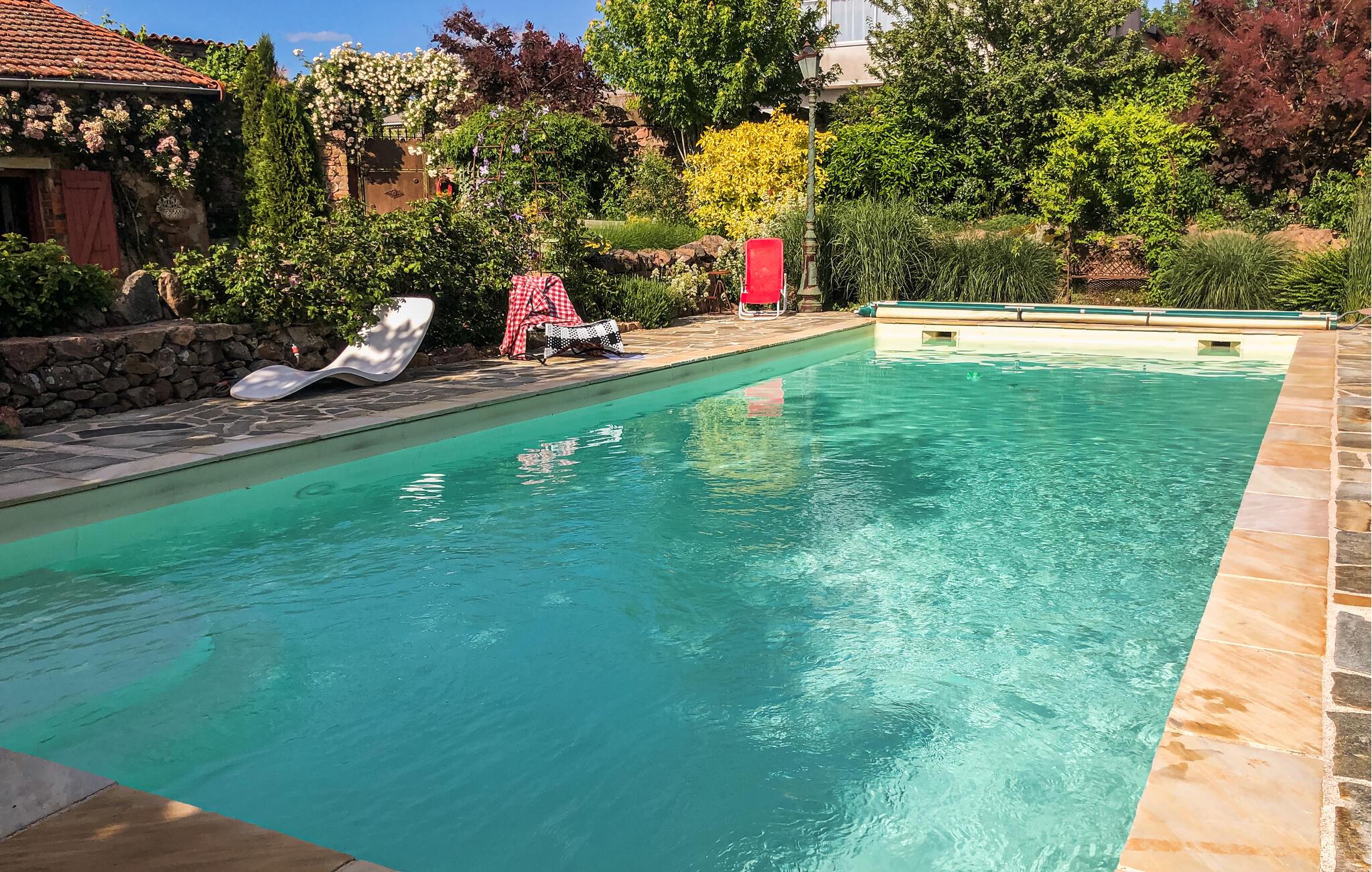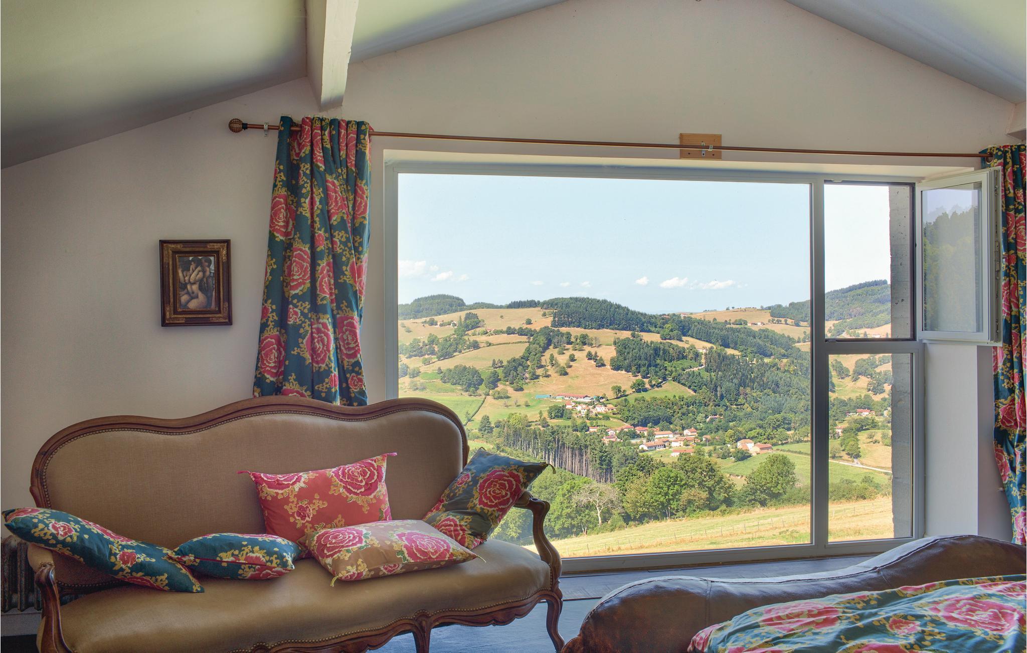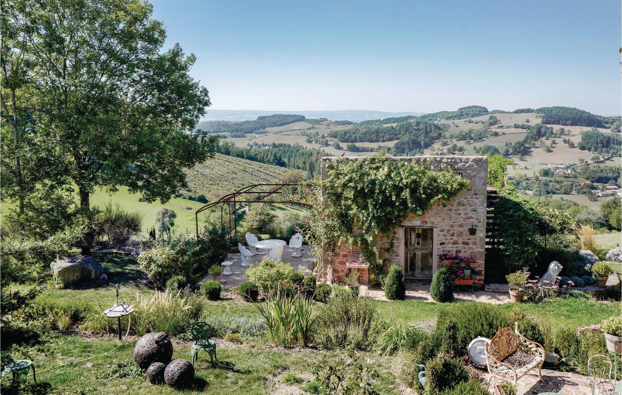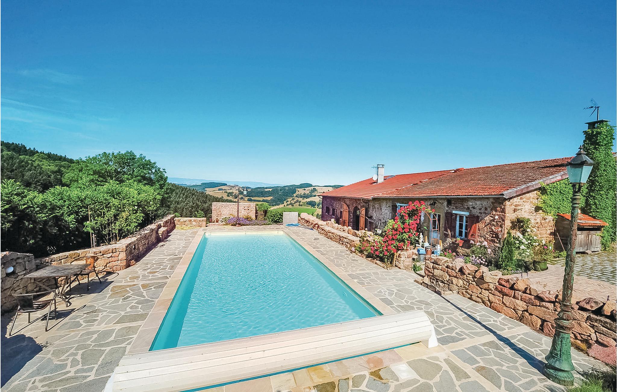 Denna rymliga semesterbostad med mycket charm ligger i den gröna och mycket charmiga regionen Monts du Beaujolais. Tack vare sitt läge mitt i naturen är det helt i sten byggda huset en liten bit av paradiset. Det öppnar sig mot en idyllisk trädgård med gräsmatta på 2 000 m² och har en stor privat pool och tre terrasser. Från den soldränkta takterrassen på ett litet uthus kan gästerna njuta av en hisnande panoramautsikt. Stora glasfronter och förtrollande dekoration ger en behaglig atmosfär inne i huset. Förutom rumsinredningen bidrar en skicklig blandning av moderna, barocka och rustika föremål, bekväma och högkvalitativa möbler naturligtvis till ditt välbefinnande. Du kan spela din egen musik via den Bluetooth-högtalare som ägarna tillhandahåller.