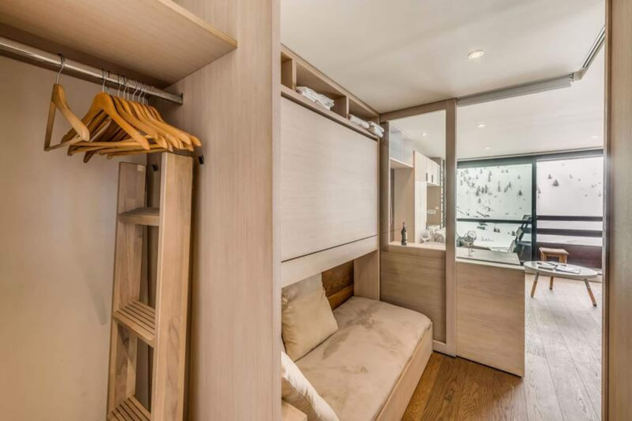 Högt ovanför Tignes Le Lacs skimrande vatten erbjuder denna premiumstudio i den berömda Residence LE PALAFOUR en alpin flykt som ingen annan. Belägen på 2 100 meters höjd har fastigheten direkt tillgång till ski-in/ski-out, vilket placerar dig direkt på sluttningarna av en av världens mest berömda skidorter. Från din balkong i söderläge kan du njuta av fri utsikt över sjön och de omgivande topparna, en daglig påminnelse om de franska Alpernas skönhet och lugn. Oavsett om du är här för spännande vintersport eller de livliga sommaraktiviteterna, är denna plats en port till oförglömliga äventyr. \n\nStudioen renoverades 2018 och är en harmonisk blandning av modern komfort och smart design, perfekt för upp till fyra gäster. Vardagsrummet i entrén har en enkelsäng och en hopfällbar våningssäng, som smart kan avdelas för att skapa en privat sovplats på natten. Det ljusa och funktionella vardagsrummet har en bäddsoffa, platt-TV och en matplats som öppnar upp mot balkongen. Det fullt utrustade köket inbjuder dig att enkelt laga mat, med diskmaskin, keramikhäll, kombinationsugn och till och med en raclettegrill för autentisk alpin mat. Badrummet är lika välutrustat med handdukstork och en elegant dusch. Hotelltjänster som sängkläder, handdukar och slutstädning garanterar en problemfri vistelse. \n\nStig ut och upptäck bekvämligheten med hotellets köpcentrum, komplett med sportbutiker, skidskolor, en stormarknad och mysiga bagerier. Bara 50 meter bort ligger vattenparken LE LAGON som erbjuder avkoppling och nöje, medan sport- och kulturkomplexet TIGNESPACE ligger bara 100 meter från din dörr. Under varje säsong förvandlas Tignes Le Lac till ett centrum för aktiviteter, från skidåkning och snowboardåkning på vintern till vandring, mountainbike och sjöaktiviteter på sommaren. Med sitt oslagbara läge, moderna bekvämligheter och hisnande utsikt är denna studio den perfekta basen för din alpina semester.