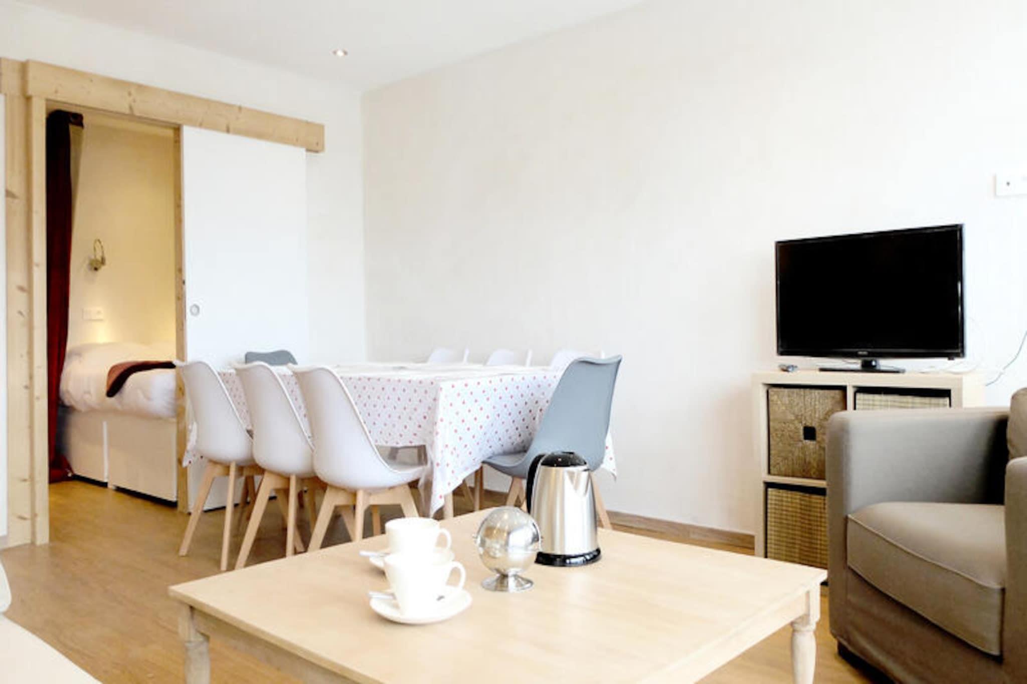 Badande i solljus och belägen i hjärtat av Tignes le Lac, erbjuder denna inbjudande lägenhet i Le Bec Rouge-residenset en oöverträffad alpin upplevelse. Tänk dig att vakna upp till hisnande panoramautsikt från din balkong i söderläge, kliva ut i backarna bara några ögonblick från din dörr och fördjupa dig i den pulserande energin hos en av de mest kända skidorterna i de franska Alperna. Oavsett om du är här för vinterspänning eller sommaräventyr, placerar denna fastighet dig i centrum av allt. \n\nDen renoverade lägenheten på 52 m² är designad för komfort och bekvämlighet och rymmer upp till sju gäster. Den omsorgsfullt utformade planlösningen inkluderar ett mysigt vardagsrum med matplats och två bäddsoffor, ett välutrustat kök med moderna apparater som ugn, diskmaskin och kyl/frys, och ett charmigt sovrum med dubbelsäng. Ytterligare sovplatser inkluderar en enkelsäng i alkoven och ett skidförvaringsskåp för enkel förvaring. Efter en dag i backarna kan du varva ner i värmen i ditt vardagsrum eller njuta av bekvämligheter som tvättmaskin och TV. \n\nGå ut och hitta allt du behöver inom gångavstånd – skidbutiker, restauranger, barer, en stormarknad och till och med ett postkontor. Skidskolan ligger bekvämt i närheten, vilket gör detta till ett utmärkt val för familjer eller nybörjare. På sommaren öppnar My Tignes-kortet upp en värld av aktiviteter, från mountainbike till paddleboarding på sjön. För dig som söker avkoppling erbjuder de pittoreska omgivningarna och den friska alpina luften den perfekta tillflyktsorten. \n\nOavsett om du snubblar genom puderiga backar eller utforskar de natursköna lederna i Tignes, är Le Bec Rouge din port till oförglömliga minnen. Med sitt utmärkta läge, moderna bekvämligheter och fantastiska utsikt är detta boende det perfekta valet för din nästa bergssemester.