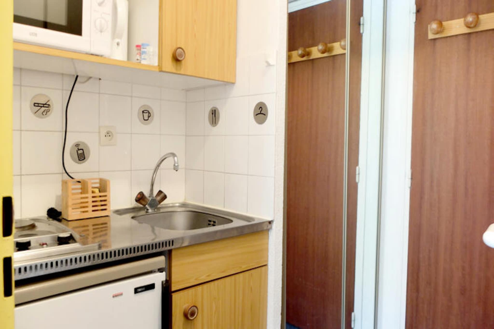 Högt över världen, där den alpina luften är frisk och uppfriskande, ligger det mysiga Rond Point des Pistes C-boendet i Tignes Val Claret. Perfekt beläget vid foten av bergbanan som leder till Grande-Motte-glaciären på imponerande 3 050 meter, erbjuder denna studio en oöverträffad inkörsport till de majestätiska sluttningarna och den hisnande utsikten över de franska Alperna. Oavsett om du är här för att karva dig genom orörd snö eller sola dig i sommarsolen, är detta din perfekta tillflyktsort i bergen. Kliv in i denna charmiga studio på 15 m², omsorgsfullt utformad för att rymma två gäster. Belägen på tredje våningen med hiss, inbjuder balkongen i väster att varva ner med utsikt över de omgivande topparna. Vardagsrummet har en våningssäng, en matplats och en TV för mysiga kvällar. Pentryt är utrustat med nödvändigheter, inklusive en elektrisk spis, kylskåp och mikrovågsugn, vilket säkerställer att du har allt som behövs för en bekväm vistelse. Ett eget duschrum och toalett kompletterar utrymmet, medan ett skidförvaringsskåp på bottenvåningen håller din utrustning säker och redo för äventyr. Alldeles utanför dörren hittar du ett pulserande utbud av butiker, skiduthyrning, skidskolor, restauranger och afterski-anläggningar, vilket gör det enkelt att fördjupa sig i den livliga atmosfären i Tignes Val Claret. På vintern är backarna bara några minuter bort, medan sommaren ger dig My Tignes-kortet, som ger tillgång till en rad spännande aktiviteter som vandring, mountainbike och vattensporter. Oavsett om du söker adrenalinfyllda dagar eller lugna alpina stunder, erbjuder Rond Point des Pistes C den perfekta blandningen av bekvämlighet, komfort och äventyr. Boka din vistelse idag och skapa oförglömliga minnen i hjärtat av de franska Alperna.