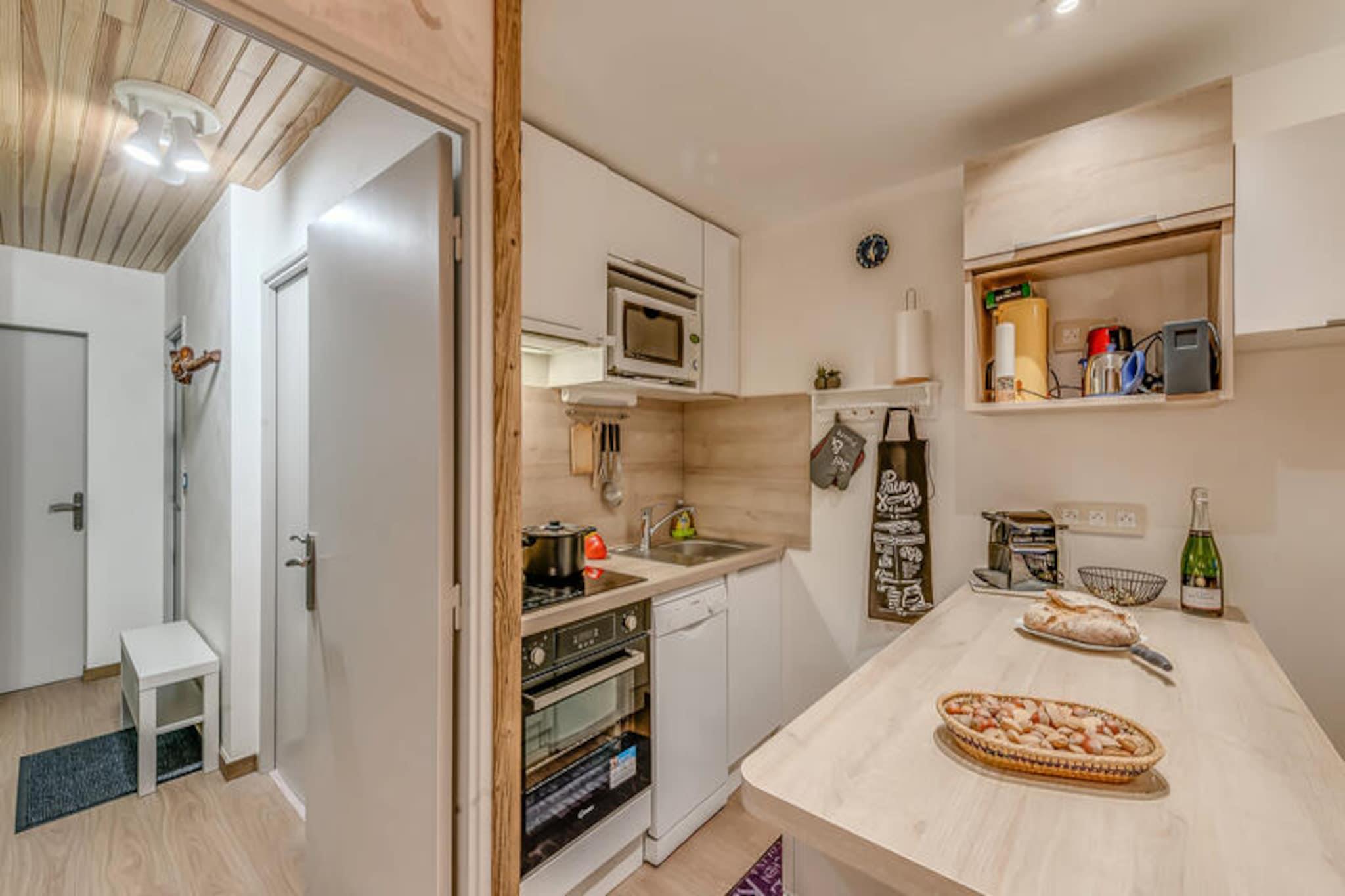 Högt ovanför de fantastiska franska Alperna, i det soliga och familjevänliga området Tignes Le Lavachet, erbjuder Résidence GLACIERS en perfekt alpin tillflyktsort för resenärer som söker både komfort och bekvämlighet. Med butiker som en stormarknad, bageri och sportbutiker bara 20 meter bort, och backarna bara 50 meter från din dörr, garanterar detta läge enkel tillgång till stolliftarna Chaudannes och Péquis. Oavsett om du är här för spännande skidäventyr eller fridfulla bergsutsikter, placerar detta charmiga residens dig i hjärtat av allt. Gratisbussar förbinder dig med Tignes Le Lac och Tignes Val Claret på bara fem minuter, vilket gör din vistelse ännu enklare. \n\nDenna premium 3-stjärniga lägenhet, belägen på 4:e våningen, har omsorgsfullt renoverats för att ge modern komfort. Den är 39 m² stor och rymmer upp till fem gäster med ett mysigt sovrum med en dubbelsäng och en enkelsäng, samt ett vardagsrum med en bäddsoffa. Den söderläge balkongen inbjuder dig att njuta av det alpina solskenet, medan den norrläge balkongen erbjuder en lugnare tillflyktsort. Det fullt utrustade köket, komplett med spishäll, ugn, kylskåp och diskmaskin, gör det till en fröjd att laga mat. Ytterligare bekvämligheter inkluderar ett badrum med badkar, handfat och tvättmaskin, samt en separat toalett och gott om förvaringsutrymme.\n\nGästerna får tillgång till hotelltjänster som sängkläder, handdukar, slutstädning (exklusive köket) och Wi-Fi, vilket garanterar en problemfri upplevelse. För extra bekvämlighet finns privata skidförvaringsskåp och en hiss tillgängliga i residenset. Tillval som babyutrustning och täckt parkering kan bokas i förväg.\n\nOavsett om du utforskar backarna, njuter av lokal mat eller bara kopplar av i din lägenhet, lovar Résidence GLACIERS en oförglömlig alpin semester. Med hisnande utsikt och enkel tillgång till allt som Tignes har att erbjuda, är detta den perfekta basen för dina bergsäventyr.