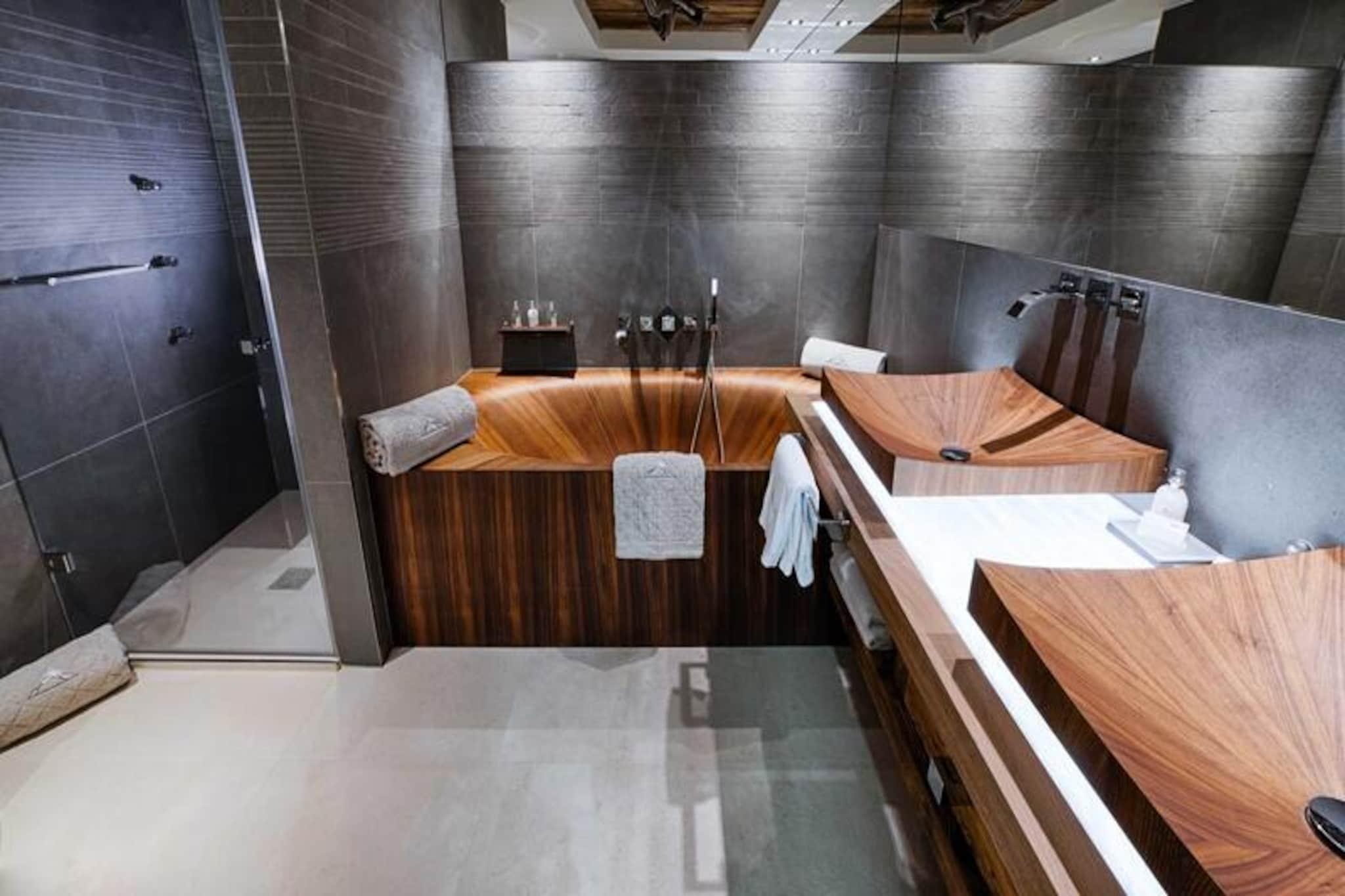 Tänk dig att vakna upp till den friska alpluften och den hisnande utsikten över de franska Alperna i den lyxiga Cap Crystal Lodge Penthouse i Tignes les Brévières. Denna exklusiva tillflyktsort, bara 150 meter från närmaste skidlift, erbjuder en oöverträffad bergsresa för familjer och vänner som söker både äventyr och avkoppling. Oavsett om du är här för att ta dig fram genom orörda backar eller varva ner i lugn komfort, lovar denna takvåning en oförglömlig upplevelse i hjärtat av Tignes. Takvåningen, som sträcker sig över en imponerande yta på 400 m², är omsorgsfullt utformad för att kombinera modern elegans med mysig alpin charm. Det rymliga vardagsrummet, komplett med öppen spis, erbjuder den perfekta miljön för kvällar där man delar historier och skratt. Köket med öppen planlösning är fullt utrustat för att laga läckra måltider, medan sovrummen erbjuder en fristad av komfort. Tre sovrum med king size-säng, inklusive ett med eget badrum och balkong, garanterar vilsamma nätter, medan barnrummet, med våningssängar och en enkelsäng, är perfekt för yngre gäster. Takterrassen är en riktig höjdpunkt, med ett privat spa med jacuzzi, hamam och bastu, där du kan koppla av efter en dag i backarna. Gästerna har också tillgång till den uppvärmda poolen och gymmet på det närliggande Santa Terra Residence. Läget är idealiskt, med den charmiga byn Tignes les Brévières precis utanför dörren. Utforska dess pittoreska gator, njut av lokal savoyardisk mat eller dra nytta av skidanläggningarna i världsklass bara några minuter bort. Utöver skidåkning erbjuder området en mängd aktiviteter, från snöskor till natursköna vandringar, vilket gör det till ett resmål året runt för naturälskare. Med sitt oslagbara läge, lyxiga bekvämligheter och omtänksamma detaljer som inkluderad frukost under speciella semesterveckor är Cap Crystal Lodge Penthouse mer än ett ställe att bo på – det är en plats att skapa värdefulla minnen. Oavsett om du söker äventyr, avkoppling eller lite av båda, är denna alpina oas det perfekta valet för din nästa semester.