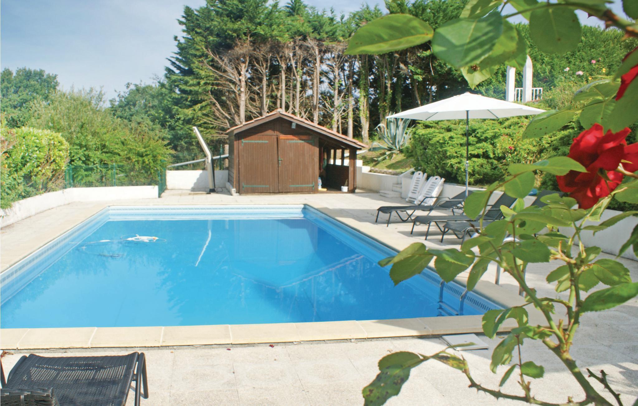 Denna semesterfastighet är en del av en vacker egendom nära byn Arcangues, bara 10 minuter med bil från den eleganta badorten Biarritz och 20 km från den spanska gränsen. Det står mitt i en omfattande, anlagd trädgård med utsikt över Pyrenéerna. Några trappsteg leder upp till den privata poolen, som värms upp av ett solsystem. Förutom verandan finns det en mysig terrass på framsidan av huset, perfekt för grillar. Golfentusiaster kan ägna sig åt sin hobby på flera internationellt erkända banor i det omgivande området, till exempel Golf de Chantaco, Golf de Biarritz eller Golf dArcangues. De lantliga omgivningarna och Pyrenéerna är hem för många vackra vandringsleder, och adrenalinjunkies kan njuta av ett fantastiskt forsränningsäventyr i Nives raviner. Åk till Biarritz för lite shopping och upplev det baskiska köket på någon av stadens många restauranger. Sedan kan du sträcka på benen vid havet. I den charmiga hamnstaden Saint-Jean-de-Luz, där traditionella festligheter äger rum regelbundet under hela året, finns det ett trevligt urval av barer för en pratstund på kvällen. Den vänliga ägaren, som bor i en angränsande byggnad, ger dig gärna bra tips för dina utflykter i det omgivande området. Bilparkering finns på fastigheten.