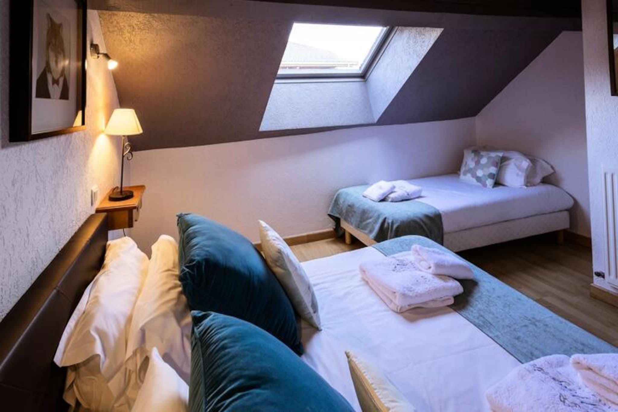 I den charmiga byn Les Verneys, bara 2 km från hjärtat av Valloire, erbjuder denna rymliga duplexlägenhet en perfekt blandning av traditionell alpin charm och modern komfort. Omgiven av hisnande utsikt över bergen är denna fastighet en idealisk tillflyktsort för familjer och grupper som söker en lugn men bekväm bas för sina semesteräventyr. Med sin terrass i söderläge kan du njuta av solen och den friska bergsluften och skapa oförglömliga minnen under alla årstider. \n\nLägenheten rymmer bekvämt upp till 12 gäster fördelade på fem välutrustade sovrum. Bottenvåningen har ett mysigt vardagsrum med TV och Wi-Fi, ett öppet kök utrustat med moderna apparater och ett praktiskt duschrum. På övervåningen hittar du ytterligare sovrum och badrum, vilket garanterar gott om utrymme och avskildhet för alla. Fastigheten inkluderar även ett skidrum med pjäxtork, gemensam cykelförvaring och tillgång till gym, bastu, ångbad och jacuzzi, vilket ger avkoppling efter en dags utforskande.\n\nVinterentusiaster kommer att uppskatta närheten till Verneys stolslift och ESF-skidskola, bara 400 meter bort, samt längdskidspår och en nybörjarlift i närheten. På sommaren förvandlas byn till en fristad för utomhusaktiviteter, med en golfbana, tennisbanor och en lekplats inom gångavstånd. Lokala bekvämligheter som ett bageri och en tidningskiosk ligger bara 350 meter bort, medan en regelbunden buss förbinder dig med Valloires pulserande centrum.\n\nOavsett om du är här för att åka skidor, vandra eller bara varva ner, erbjuder denna duplexlägenhet i Les Verneys den perfekta kombinationen av komfort, bekvämlighet och alpin charm för en oförglömlig semesterupplevelse.