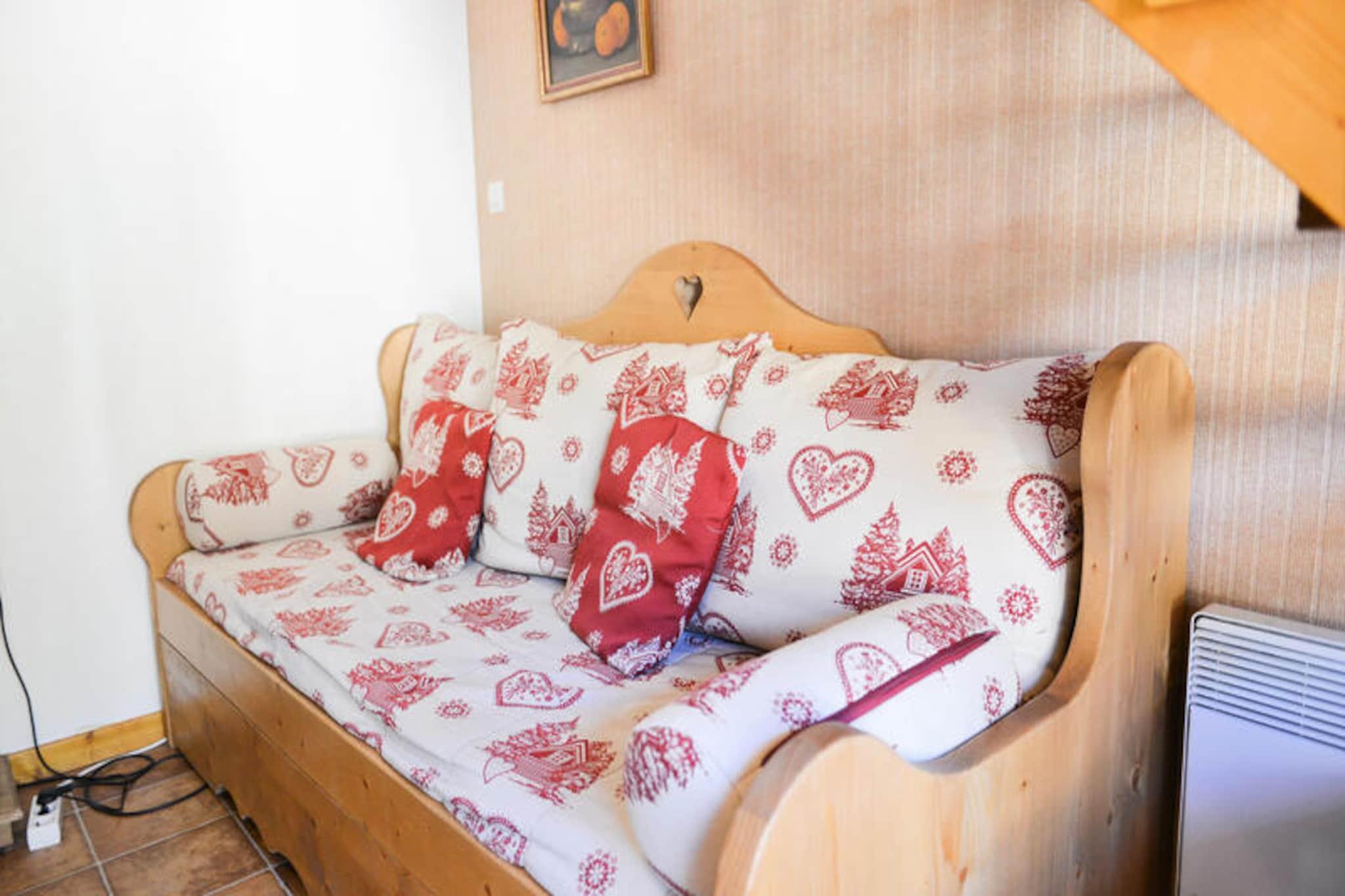 I den fridfulla byn Les Plans, bara 550 meter från hjärtat av Valloire, erbjuder denna charmiga alpina lägenhet en lugn tillflyktsort omgiven av hisnande bergslandskap. Oavsett om du besöker oss på vintern eller sommaren, ger boendets läge enkel tillgång till det bästa i regionen, från spännande skidbackar till livliga fritidsaktiviteter. Tänk dig att vakna upp till frisk alpluft och njuta av den fridfulla atmosfären i detta lugna område, med en bekväm busshållplats precis utanför dörren för enkel utforskning. \n\nLägenheten är utformad för att rymma upp till sex gäster och har en genomtänkt planlösning med mysiga sovarrangemang inklusive ett sovrum med två enkelsängar, en stuga med en bäddsoffa och en mezzanin med våningssängar. Det välutrustade köket inbjuder dig att laga rejäla måltider efter en dag av äventyr, medan vardagsrummet med TV erbjuder en välkomnande plats att varva ner. Moderna bekvämligheter som diskmaskin, tvättmaskin och skidförvaring garanterar en bekväm och praktisk vistelse. Balkongen i västerläge är perfekt för att njuta av de gyllene nyanserna av den nedgående solen över de majestätiska topparna. På vintern är du bara 550 meter från Crêt de la Brives linbana, skidskola och byns centrum, vilket gör det idealiskt för snöentusiaster. Under sommaren ligger fritidscentret med pool, ishall och hälsoavdelning bara 400 meter bort, medan en lekplats för barn ligger bara 150 meter från boendet. Den pulserande staden Valloire erbjuder charmiga butiker, lokala restauranger och kulturevenemang för att förhöja din vistelse. Oavsett om du söker spännande utomhusäventyr eller en lugn alpin flykt, är denna fastighet i Les Plans din port till oförglömliga minnen i de franska Alperna.