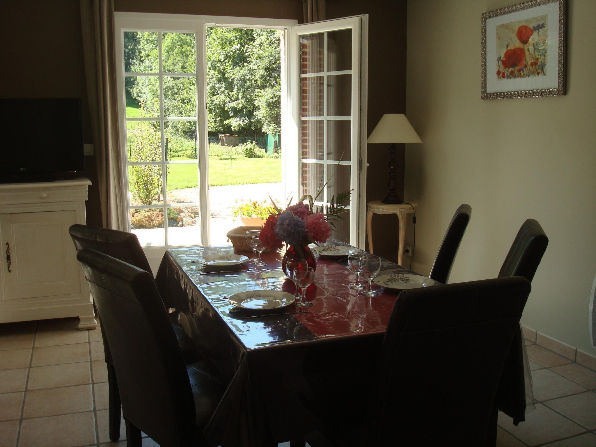 The detached holiday home is well maintained and comfortably furnished. With a living area of 70 m², it offers space for six people. You can enjoy both the pleasant living atmosphere and the view of the countryside. The house has a comfortably furnished 39 m² living room. The attractive dining room seats six and is located directly in front of the French windows. Facilities are complemented by a flat-screen TV, radio, DVD player and free Wi-Fi internet access. The modern kitchen is fully equipped with high-quality crockery, cooking utensils and appliances such as an extractor hood, multifunction oven, induction hob, fridge-freezer, coffee maker, microwave, toaster, coffee machine, dishwasher and silent washing machine. The bathroom has a walk-in shower. There is a separate toilet. The romantic bedroom has a double bed (160 x 200 cm) with a large duvet (260 x 240 cm). The second bedroom, furnished in a natural style, has a smaller double bed (140 x 190 cm) with a 240 x 220 cm duvet and a bunk bed with two single beds (90 x 190 cm) and two duvets (140 x 200 cm). It's ten kilometres to Fécamp, 25 to Etretat and 50 to Honfleur, a picturesque harbour town. Not far from your holiday home you'll find the first beaches with their typical houses. It is also an ideal base from which to explore the region's most interesting sites. Valmont is a beautiful town of a thousand inhabitants. It offers all the important amenities such as a bakery, butchers, supermarket, restaurant, bar, pub, pharmacy and doctors. The town centre with all its shops is around 1000 metres away by car. You can also take a stroll through the town along the promenade, which is around 600 metres away.