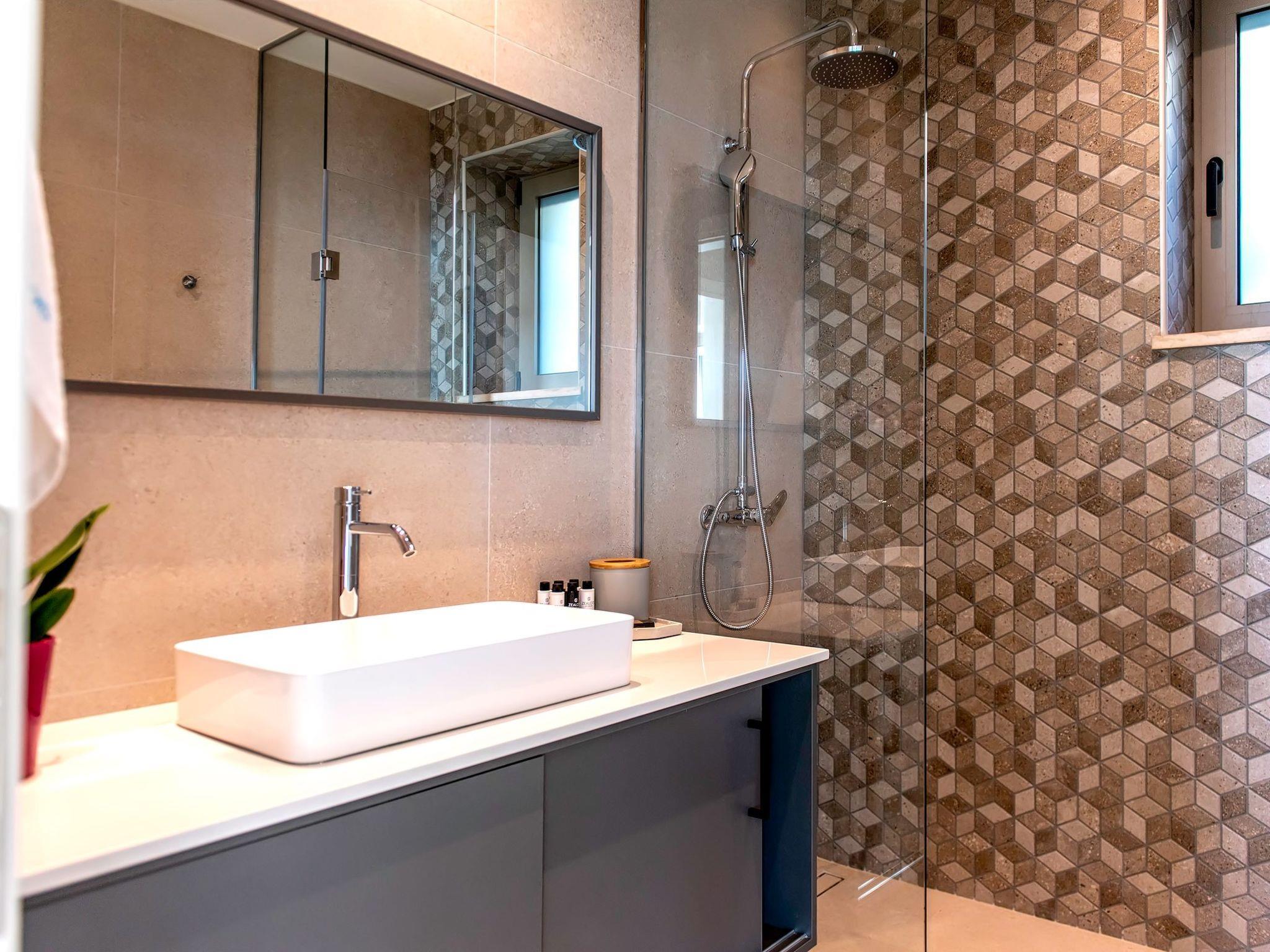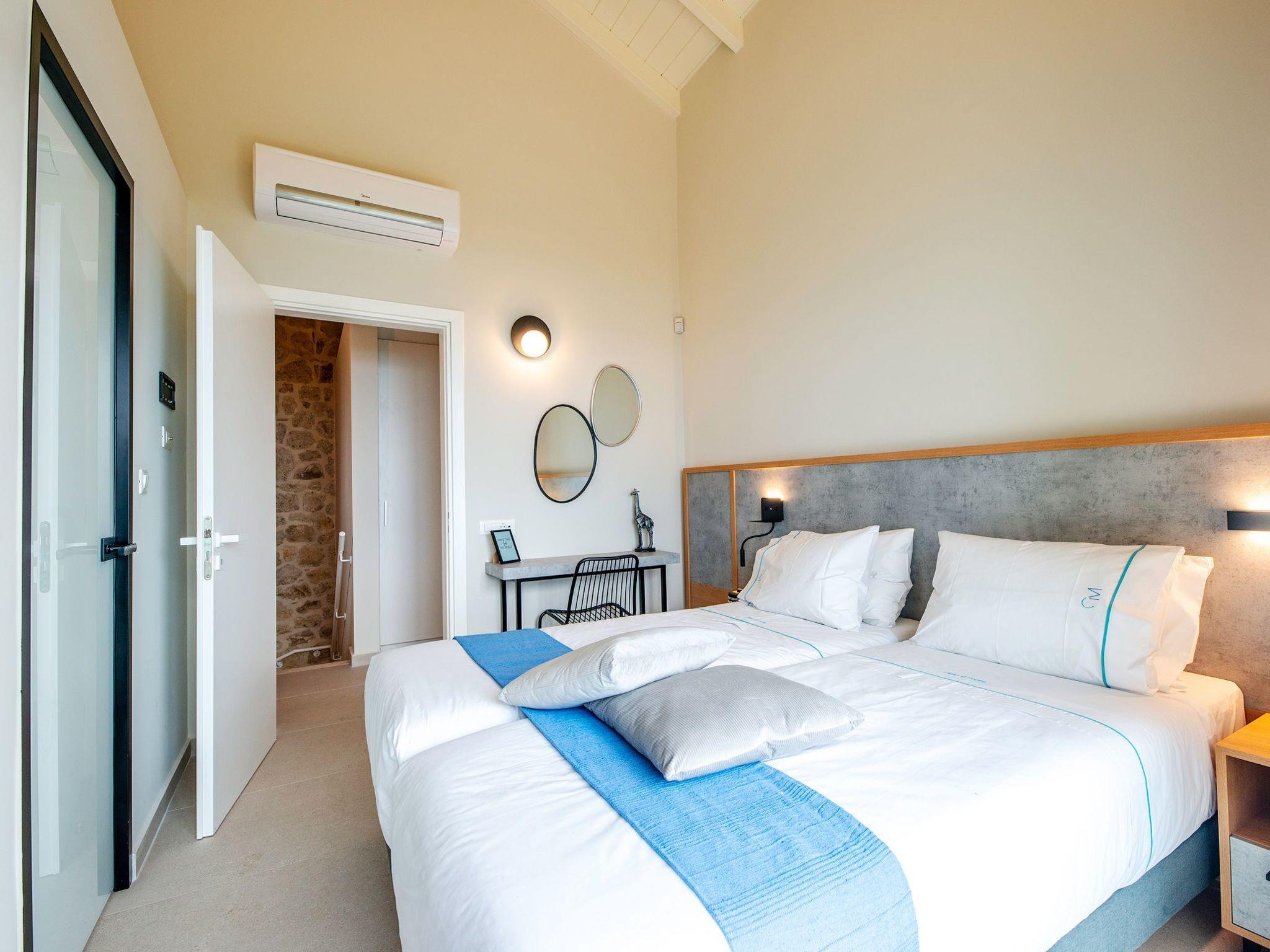 Villa Cielo is a two-story villa consisting of three bedrooms, two of them on the first floor one with twin beds with a sea view, and another double bed. The third bedroom on the ground floor has a king-size bed with a sea view. On the ground floor, there is a shared WC with a shower suitable for all the guests, and on the first floor 2 ensuite bathrooms with a shower. Luxury and modern design complete the scenery of contemporary architecture and high-quality products. Entering the villa on the ground floor you will find a spacious open area with a fully equipped contemporary kitchen that has branded appliances and facilities, making holiday cooking a most pleasurable experience. The area is completed with a dining room and a living room with a big flat-screen smart TV with satellite channels and an energy fireplace. The large windows create the illusion of transparency and provide a seamless transition between the indoor and outdoor areas.