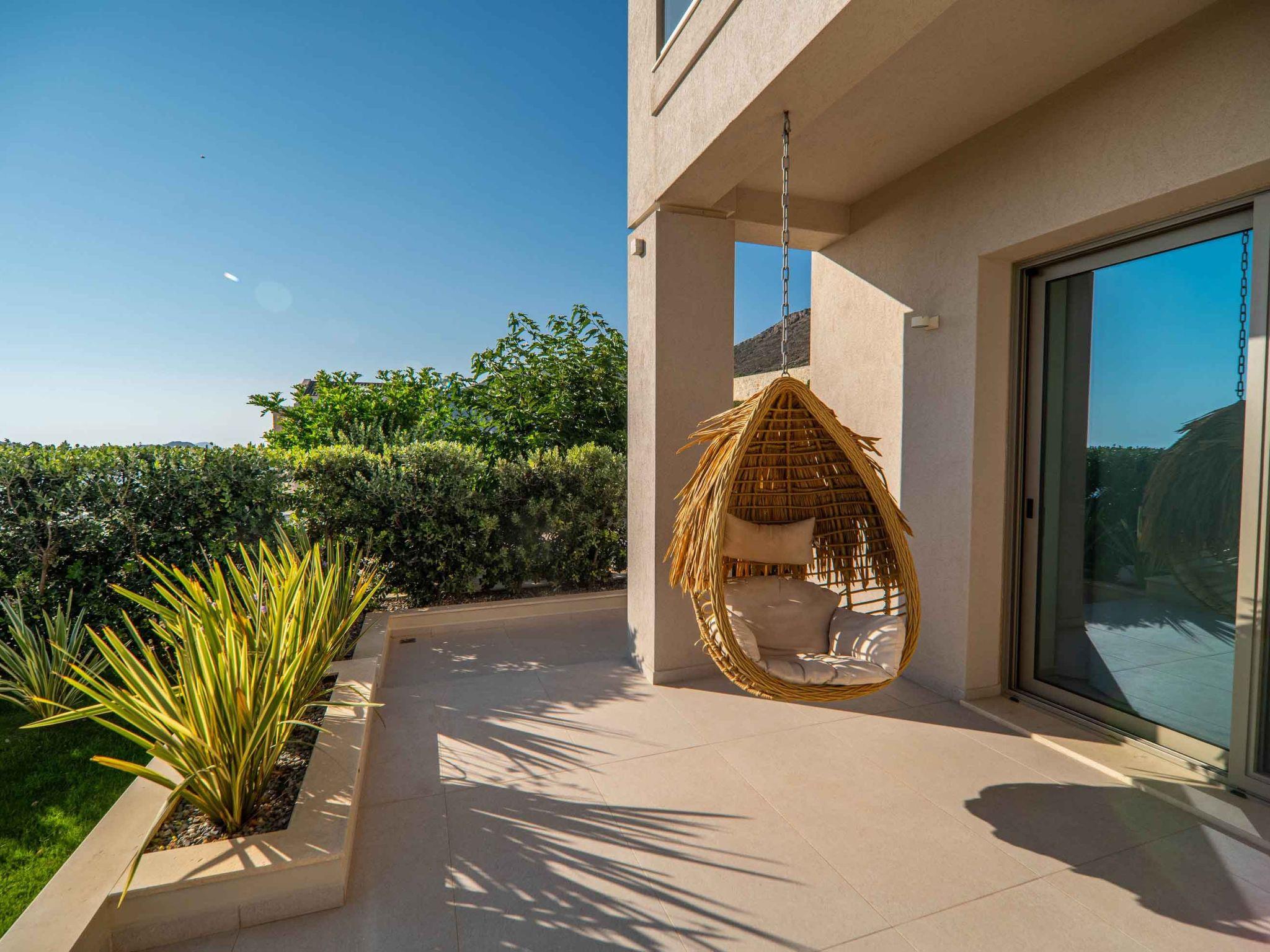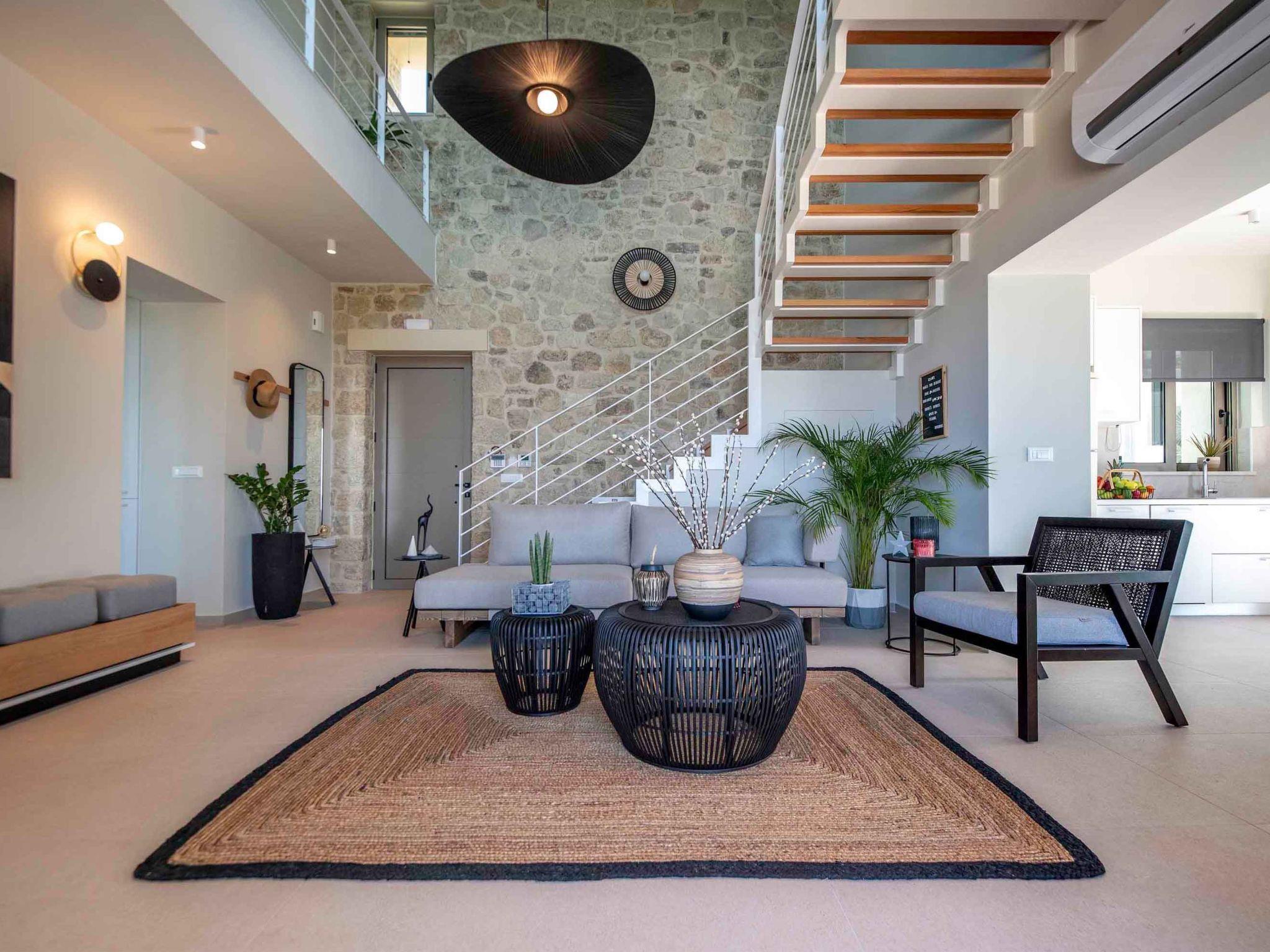 Villa Mare is a two-storey villa consisting of three bedrooms, two of which are located on the first floor with the other one. The bathrooms on the first floor are ensuite with showers. On the ground floor, there is another bedroom. Luxury and modern design complete the scenery of contemporary architecture and high-quality products. On the ground floor, there is a spacious open area with a fully equipped kitchen, a dining area, a living room with modern furnishings, and a big flat-screen smart TV with satellite channels. The large doors open onto the veranda and pool area, providing a seamless transition between the indoor and outdoor areas.
