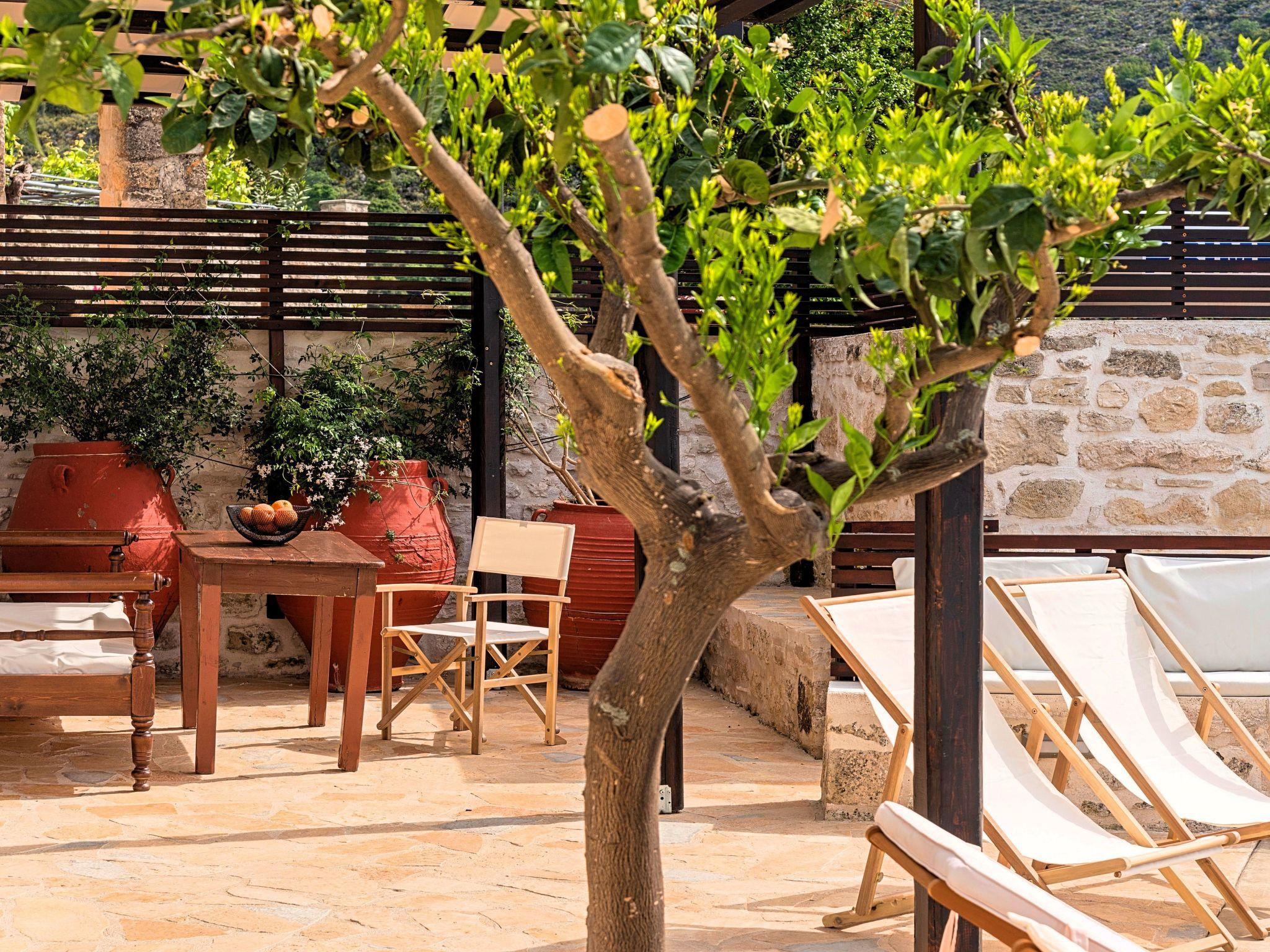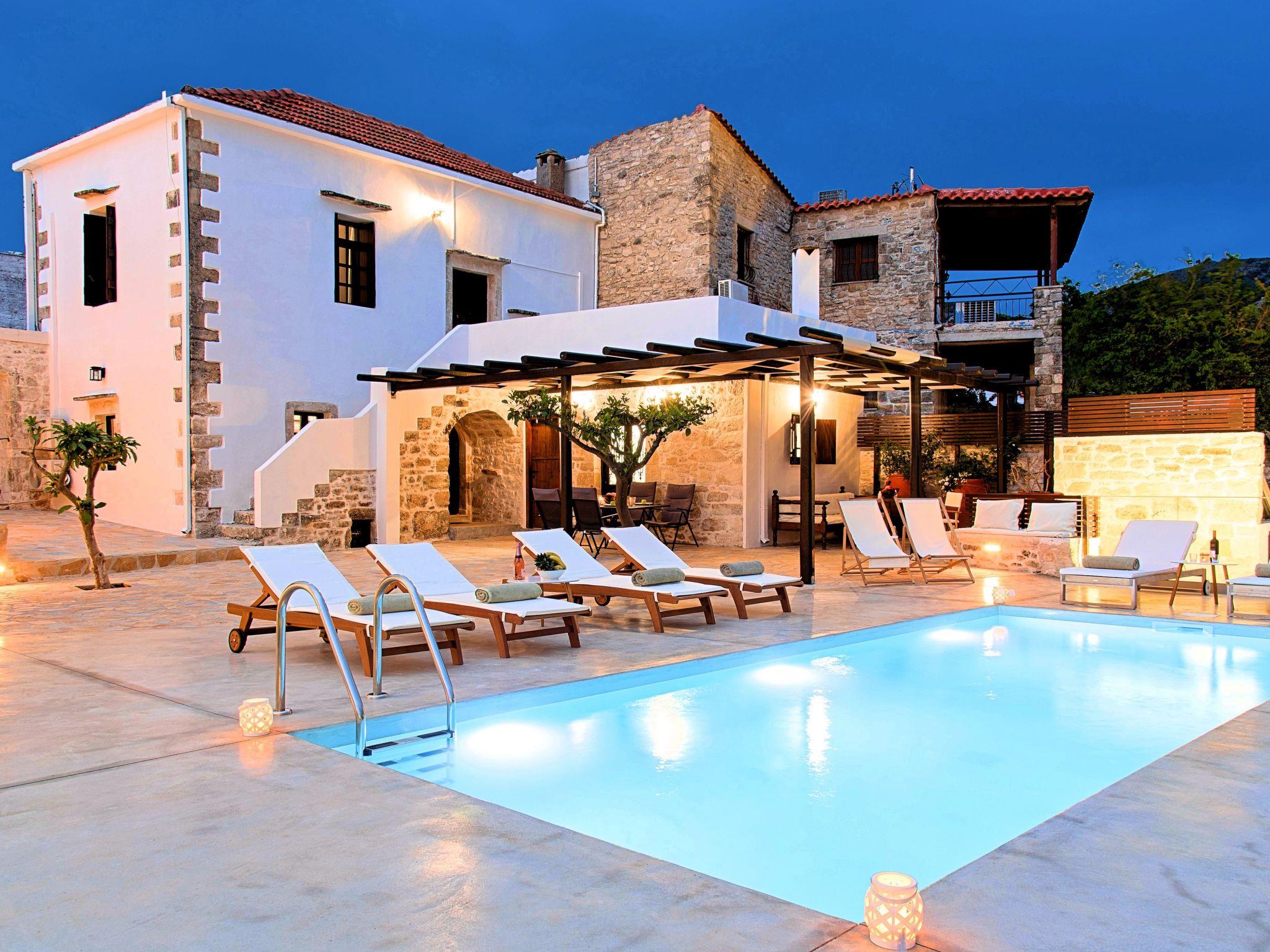 In the wildly beautiful landscape of Crete, Villa Barozziana stands proudly at the edge of Argyroupolis one of the most ancient villages of the island, reflecting a unique sense of freedom and enjoying the panoramic view of the surrounding mountains and the Cretan Sea.It is renovated with a harmonious blend of local rock, wood and steel in order to create a Villa of simple unpretentious comfort which blends perfectly with the surrounding Cretan landscape. But this does not mean that the needs of the modern traveler have been neglected. Factors such as the comfortable rooms with access to a large veranda overlooking the olive groves and the Cretan Sea, the fully equipped kitchen, the large swimming pool, the gardens and the heated jacuzzi will ensure that your stay with us will be pleasurably and unforgettable.The villa is spread over two floors, with the two levels connected by an interior staircase. Bedrooms are in the first floor and a large living area with a magnificent fireplace at the ground floor.