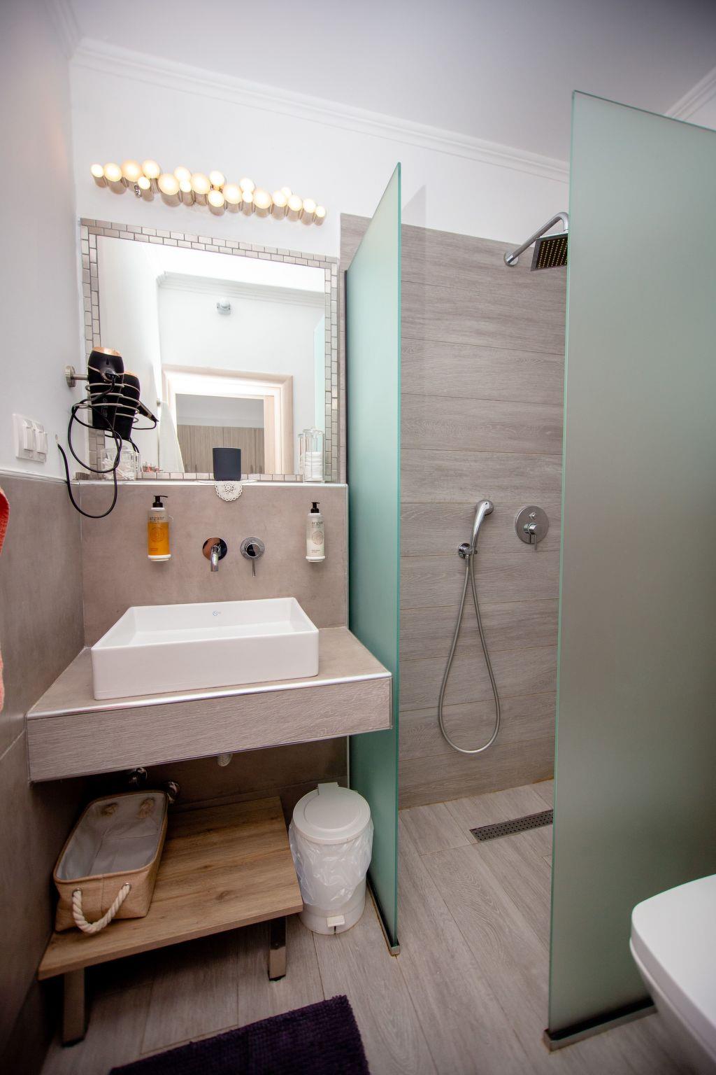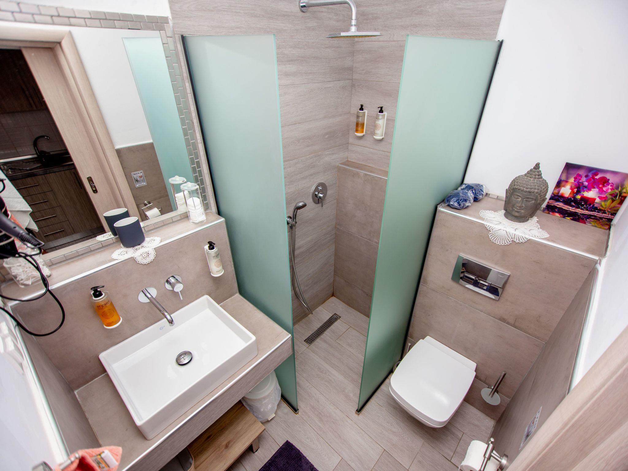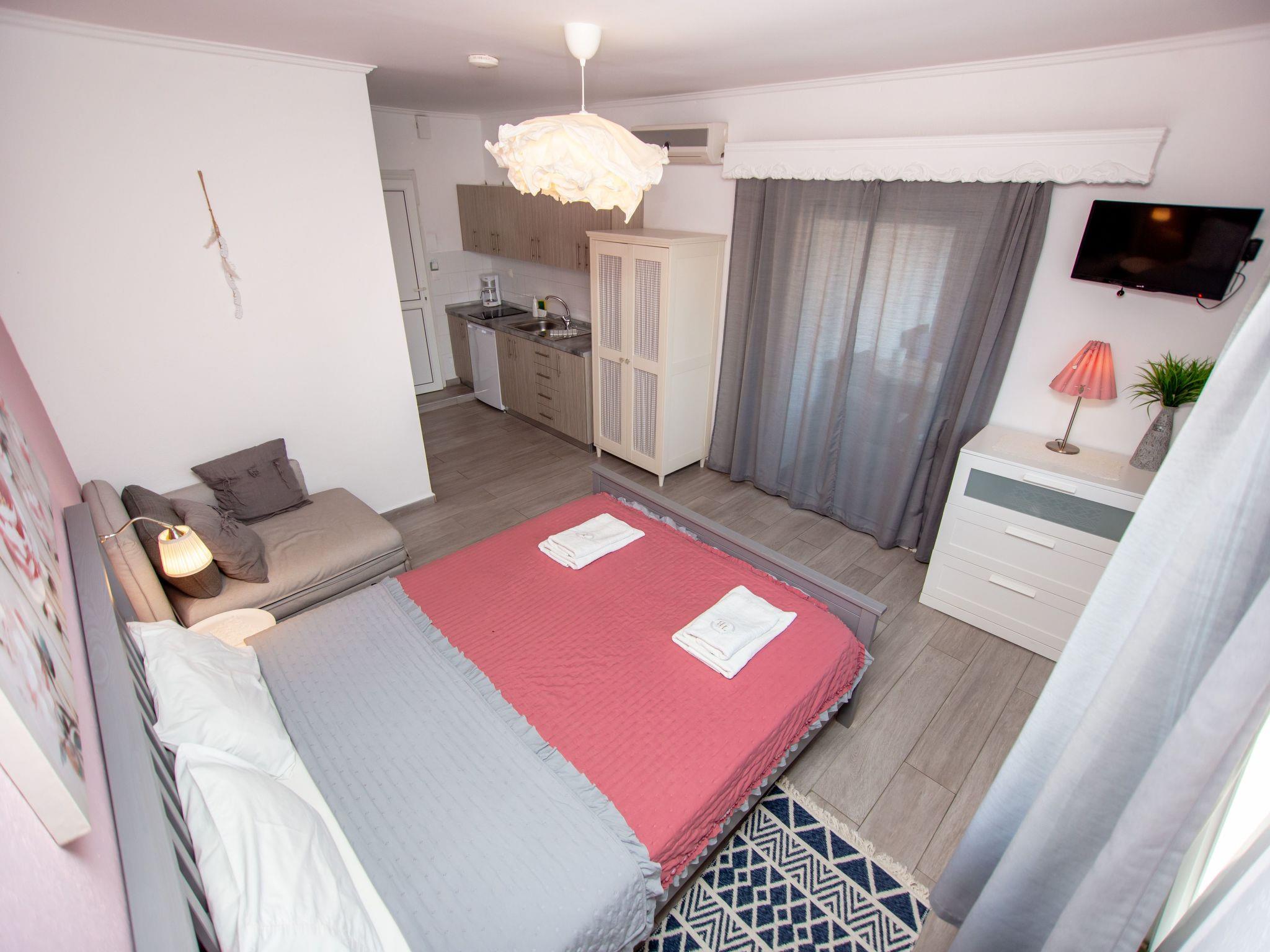 The triple room studio/apartment is approx. 27 square metres in size and is located on the first floor of the house. It has a room with a double bed (160 x 200), a sofa bed for one person and a ground-floor shower/WC. The adjoining kitchenette with fridge and induction hob is equipped with various crockery. A beautiful, large balcony with a view of the inner courtyard is also part of this cosy studio.