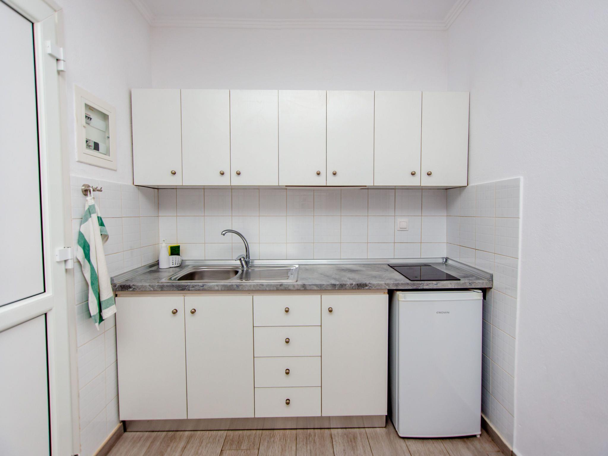 The double room/studio is approx. 27 square metres in size and is located on the first floor of the house. It has a room with a double bed (160 x 200) and a ground-floor shower/WC with window. The kitchenette with fridge and induction hob is equipped with a coffee machine, toaster, kettle and various crockery. A beautiful, very large balcony with a view of the village and the sea is also part of this cosy studio.