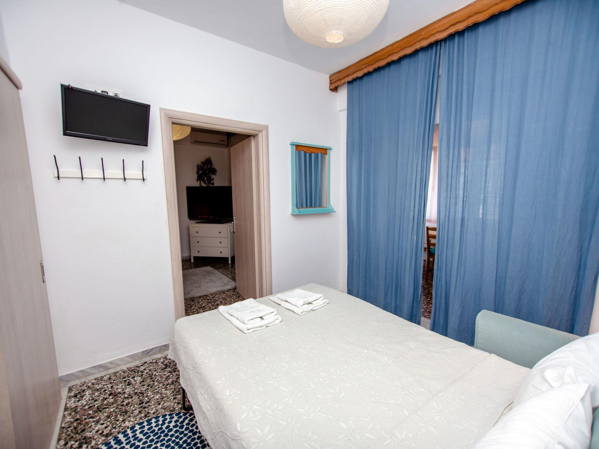 The family flat is located on the first floor of the house and has two bedrooms separated by a door. It is equipped with a ground-floor shower/WC with window, a kitchen with fridge, induction hob, coffee machine, kettle, toaster and various crockery. A beautiful, large terrace with a view of the inner courtyard is also part of this lovely family flat.