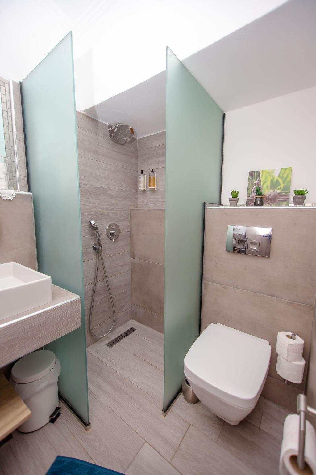 The studio/apartment is located on the 2nd floor of the house and is suitable for 2-3 people and is approx. 29 square metres in size. It is equipped with a ground floor shower/WC with window, a kitchen with fridge, induction cooker and various crockery. A beautiful terrace with a table and chairs overlooking the inner courtyard also belongs to this studio.