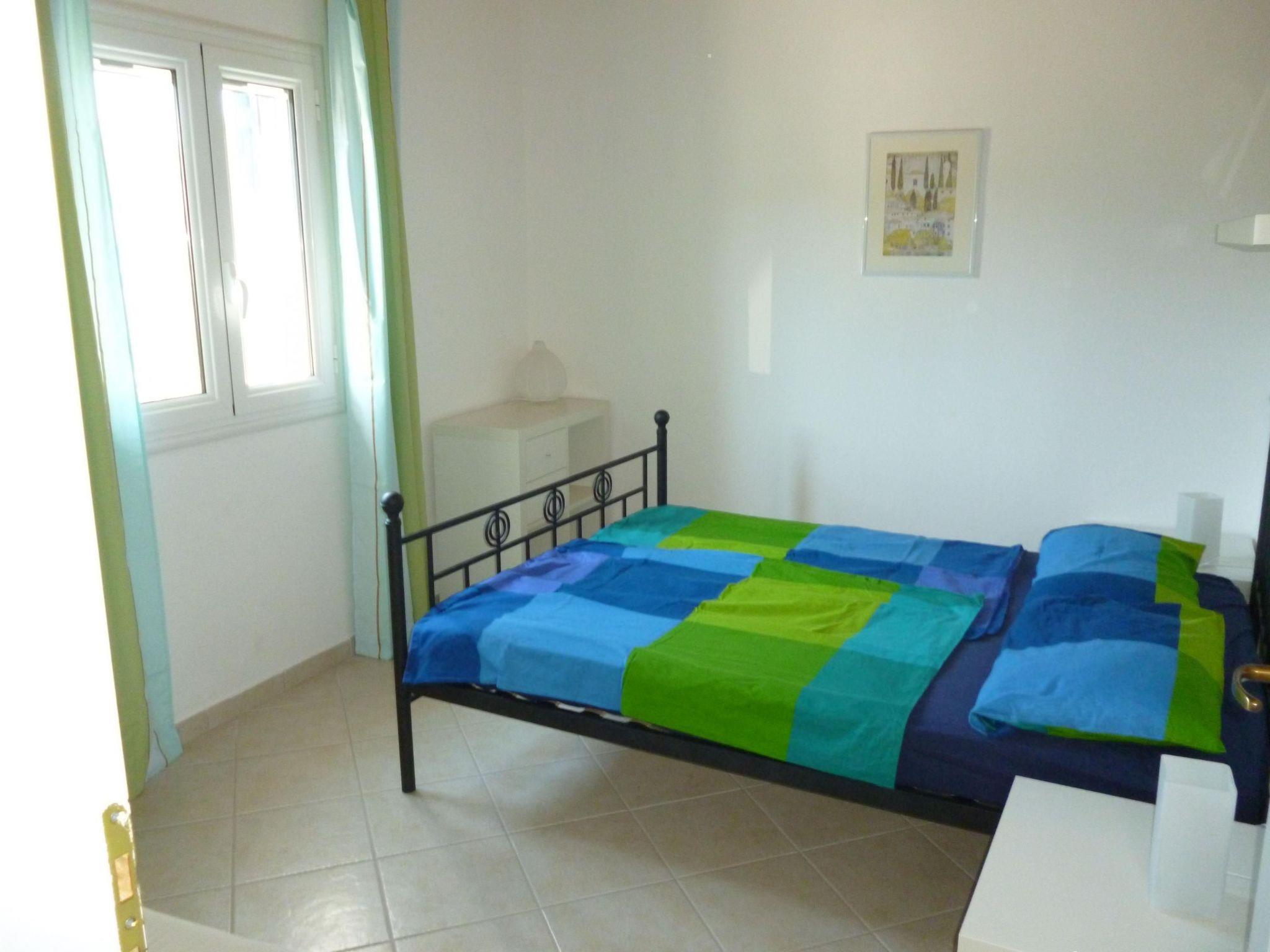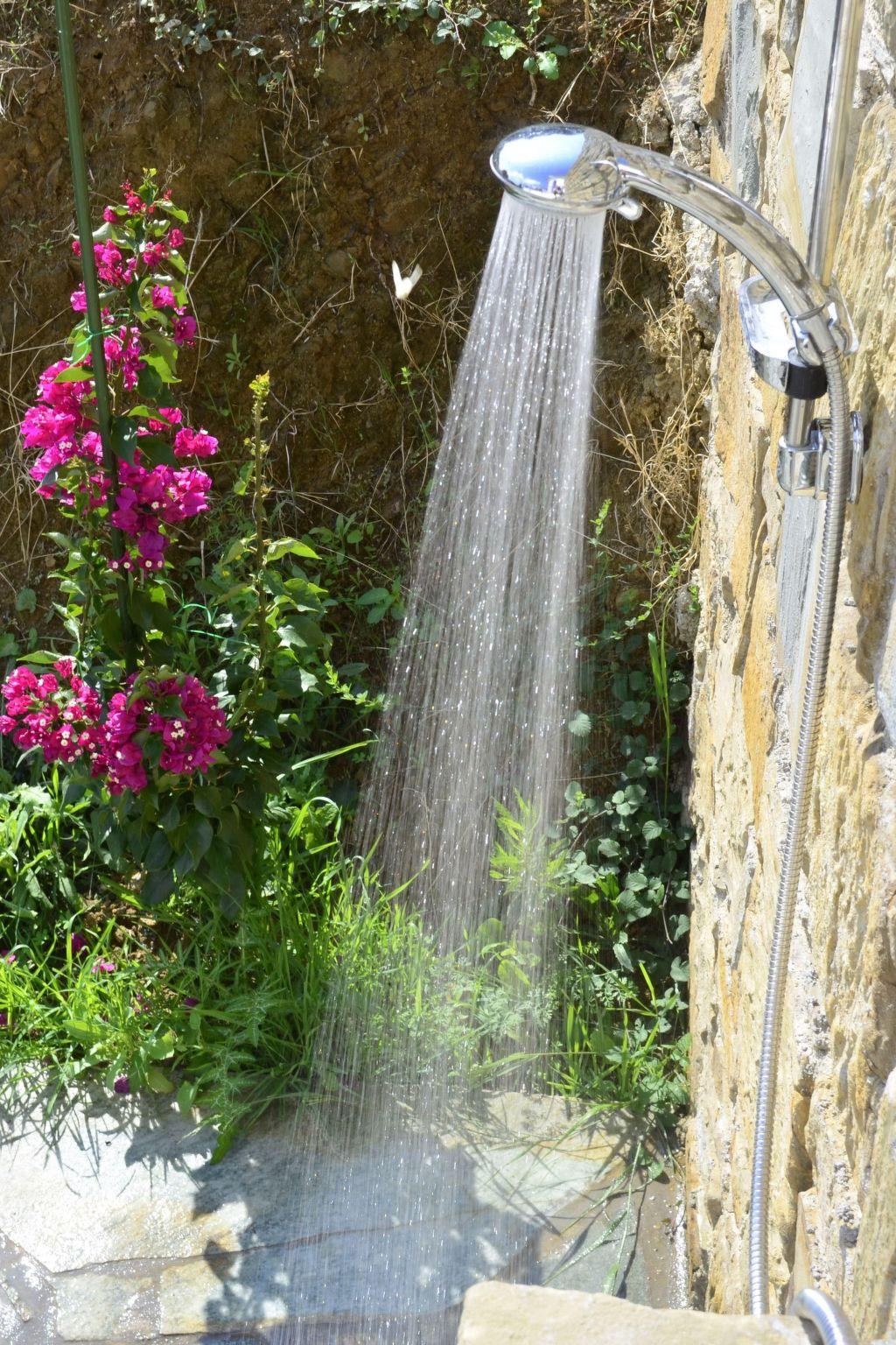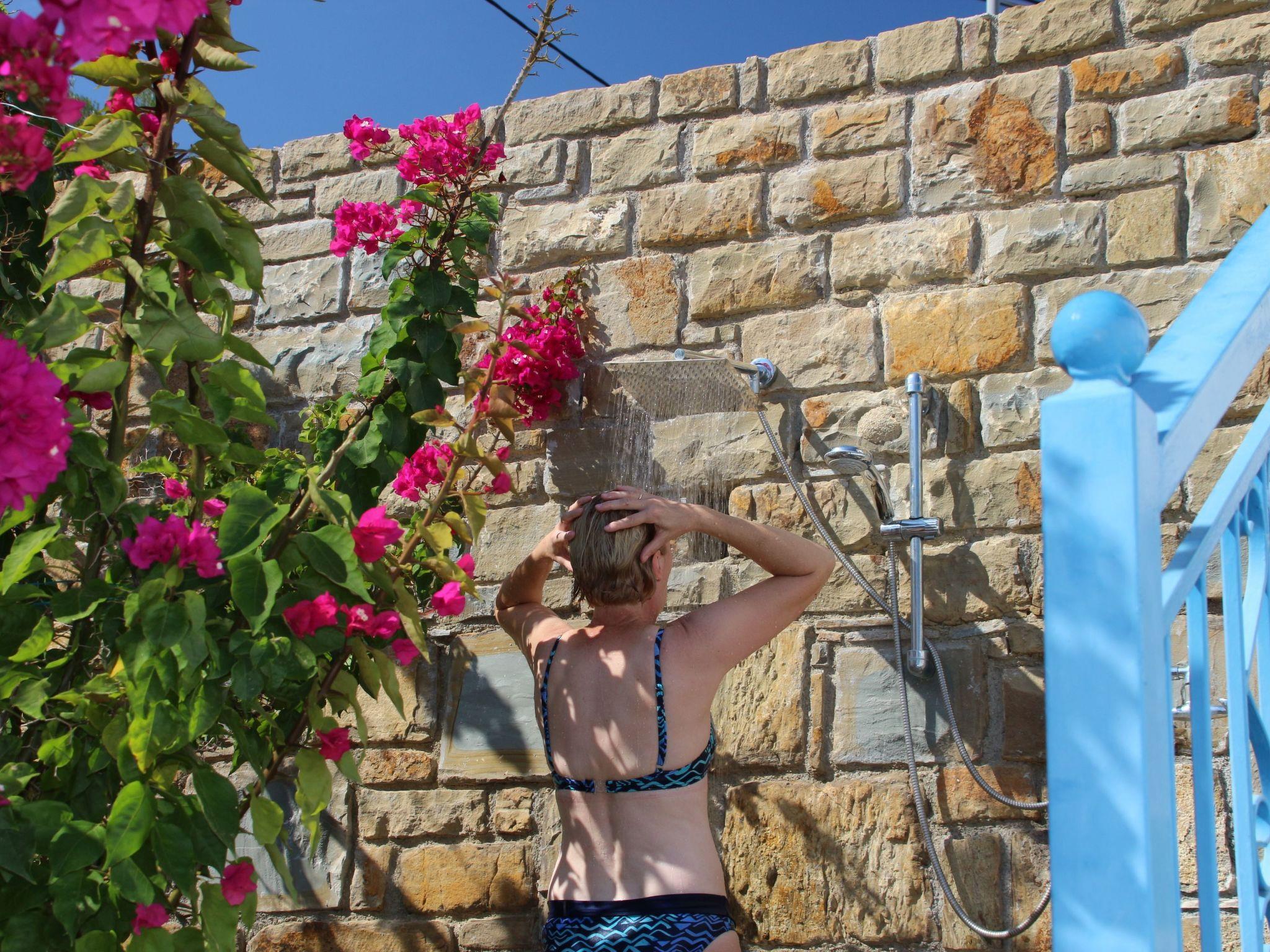 Folding loungers are available for sunbathing on the 50 square metre terrace, an awning as sun protection and a large table with six chairs for outside and just as many for the dining area inside invite you to linger. All windows are fitted with insect screens. The outdoor shower with hot water is a hit, while flowering bougainvilleas and oleanders next to the natural stone steps provide privacy. In front of the kitchen, a seating area with table and chairs between the olive tree and oleander invites you to enjoy the Mediterranean flora.