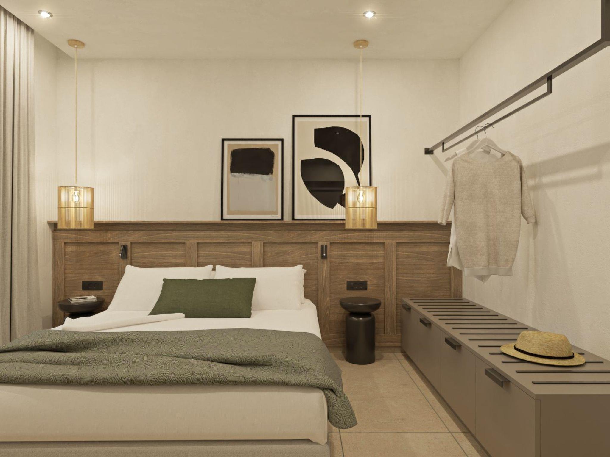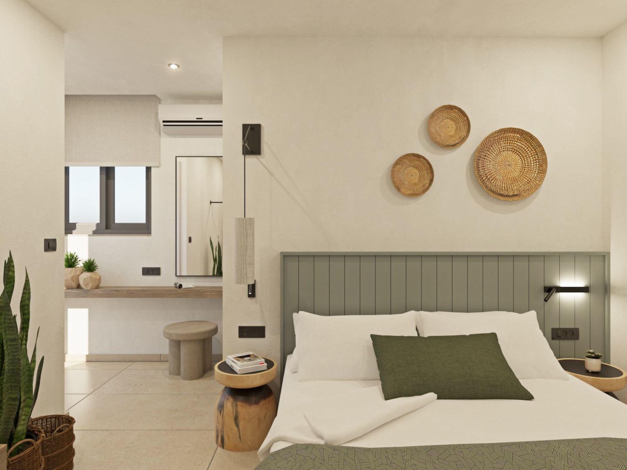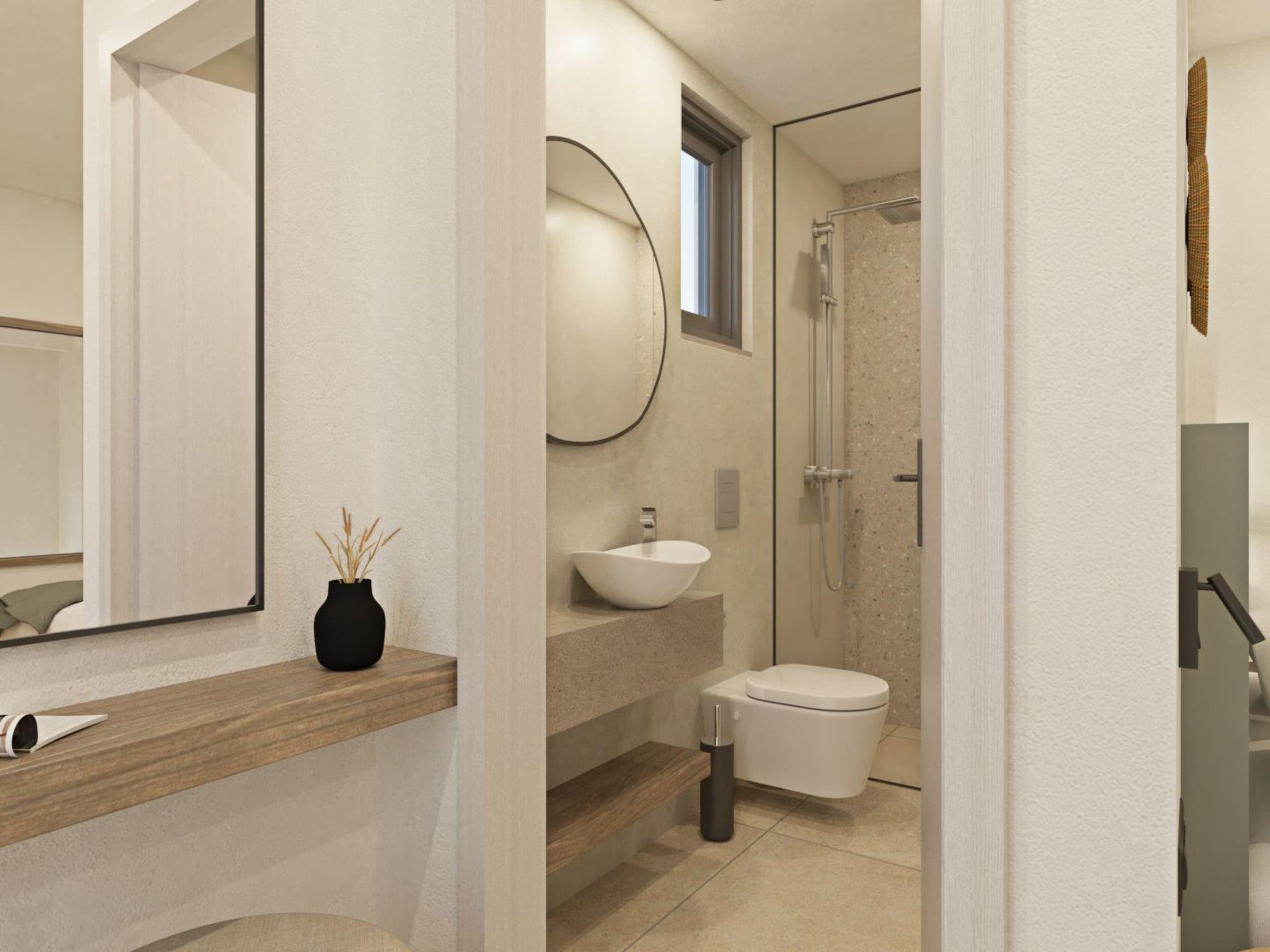 The villa spans approximately 80 sqm of indoor living space and 90sqm of outdoor area, making it ideal for groups or families. The villas feature a spacious open-plan living area, where guests can relax on a comfortable sofa while enjoying modern amenities such as a 50’’ Smart TV with satellite channels. Large sliding doors provide access to private terraces or the pool area, creating an easy flow between the indoor and outdoor spaces. The villa has a fully functional kitchen, allowing guests to prepare meals with ease, and the dining area offers a welcoming space for shared meals. An extra guest can be accommodated on the sofa in the living area upon request at an extra cost. The sofa is comfortable for both adults and children as the size is 1.10*2.20m.