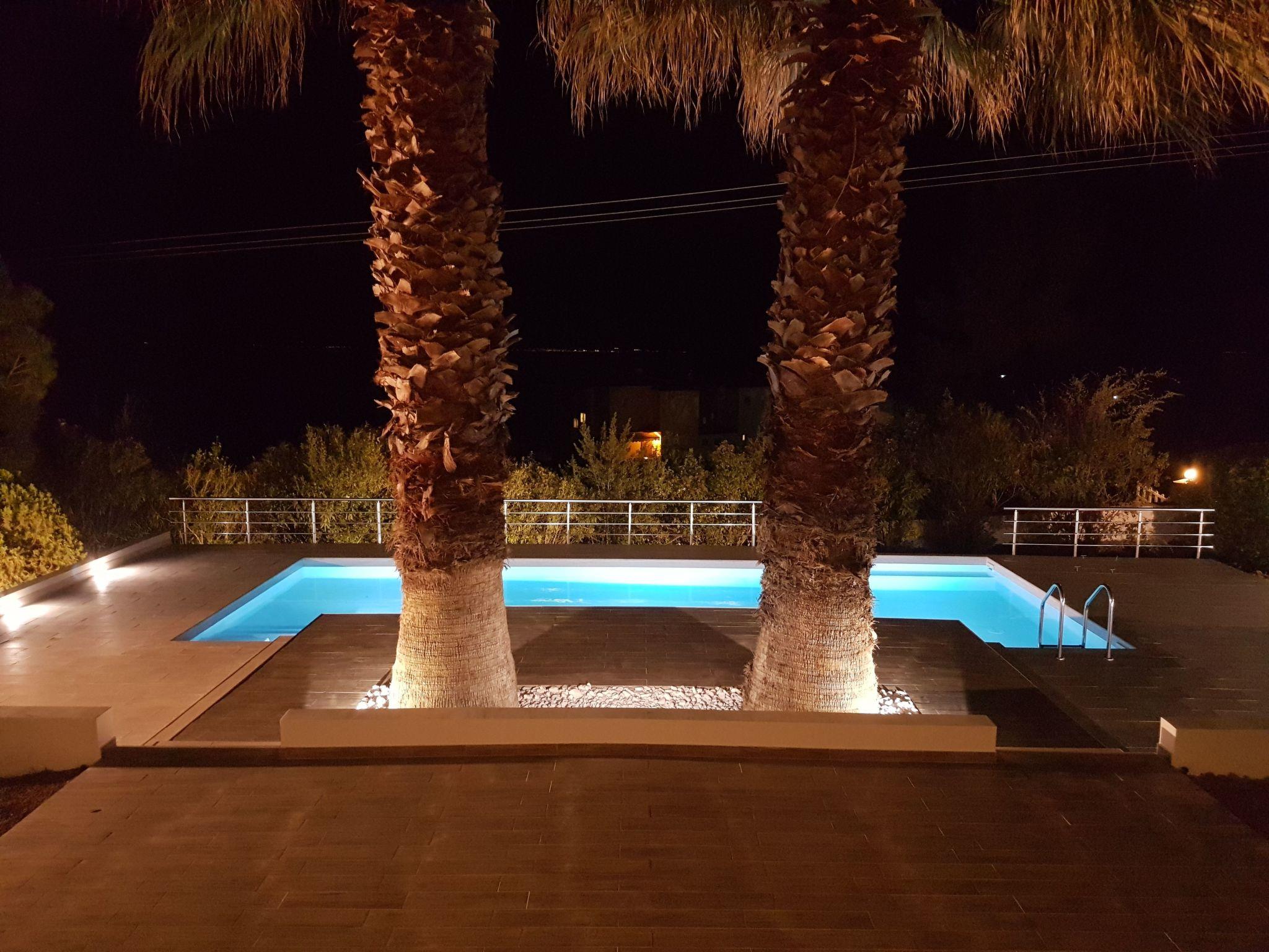 The exterior of the house is amazing. There are 4000 sqm with well maintained lawns, palm trees, pine trees, olive trees and a fully equipped large barbeque kiosk. The villa offers a private pool of 50 square meters.
