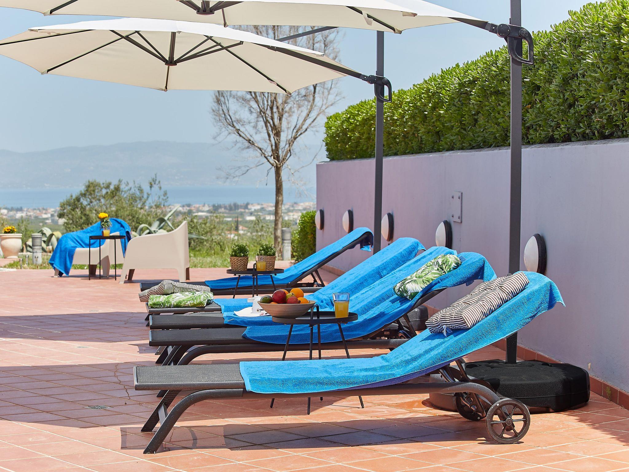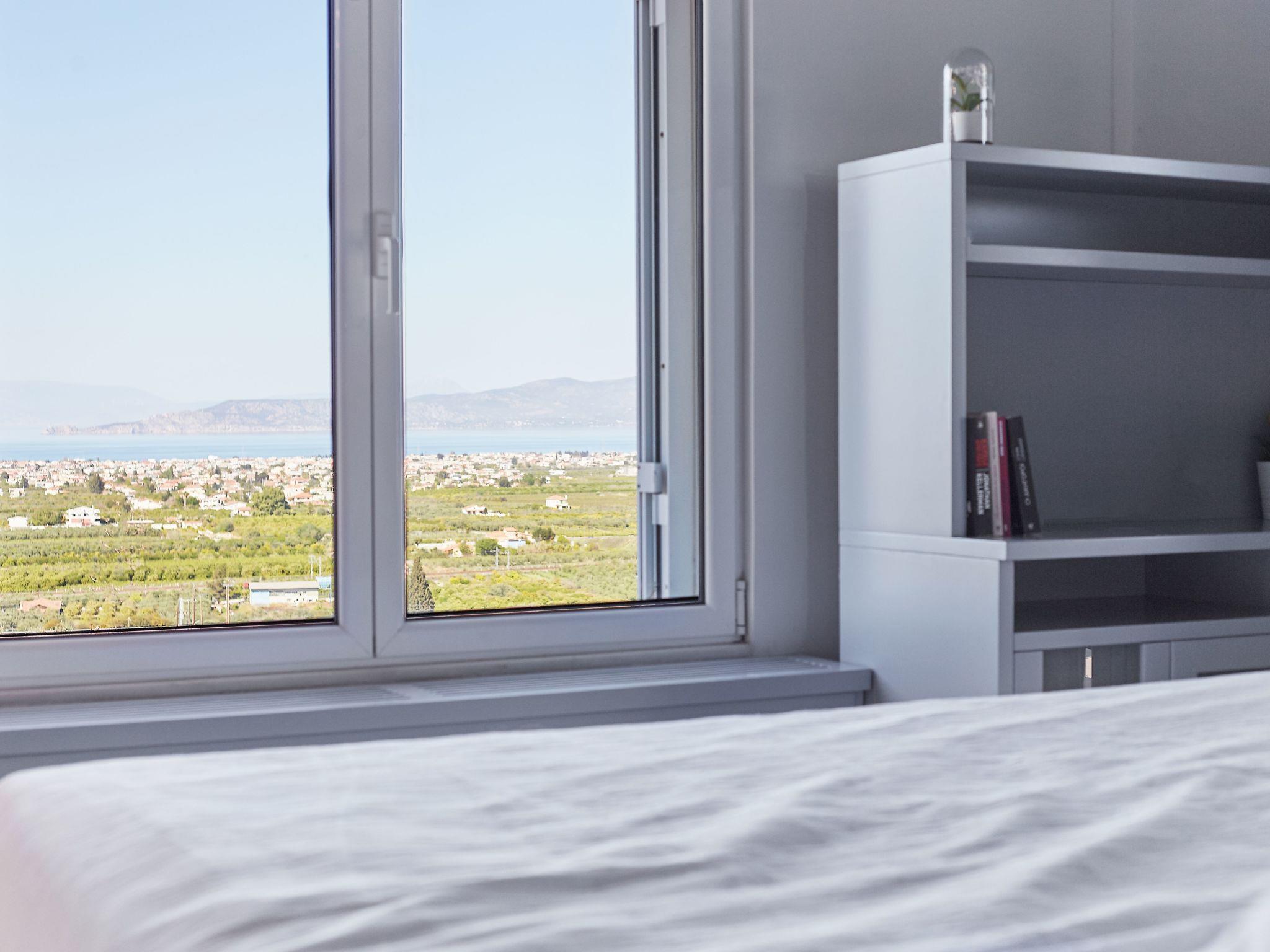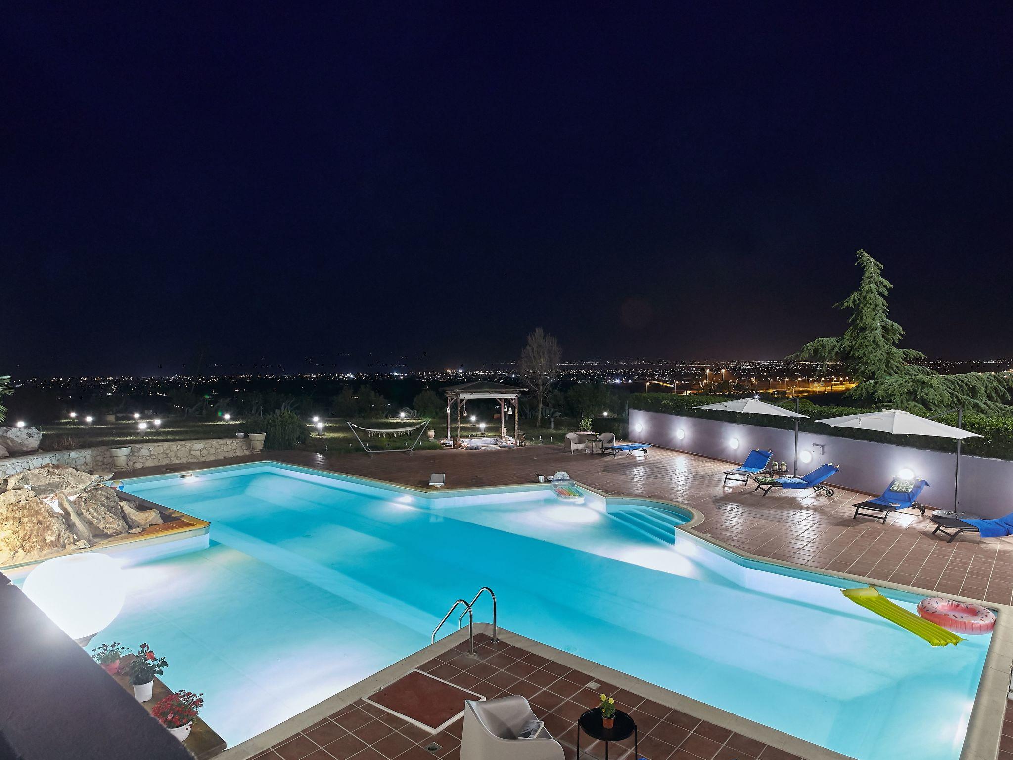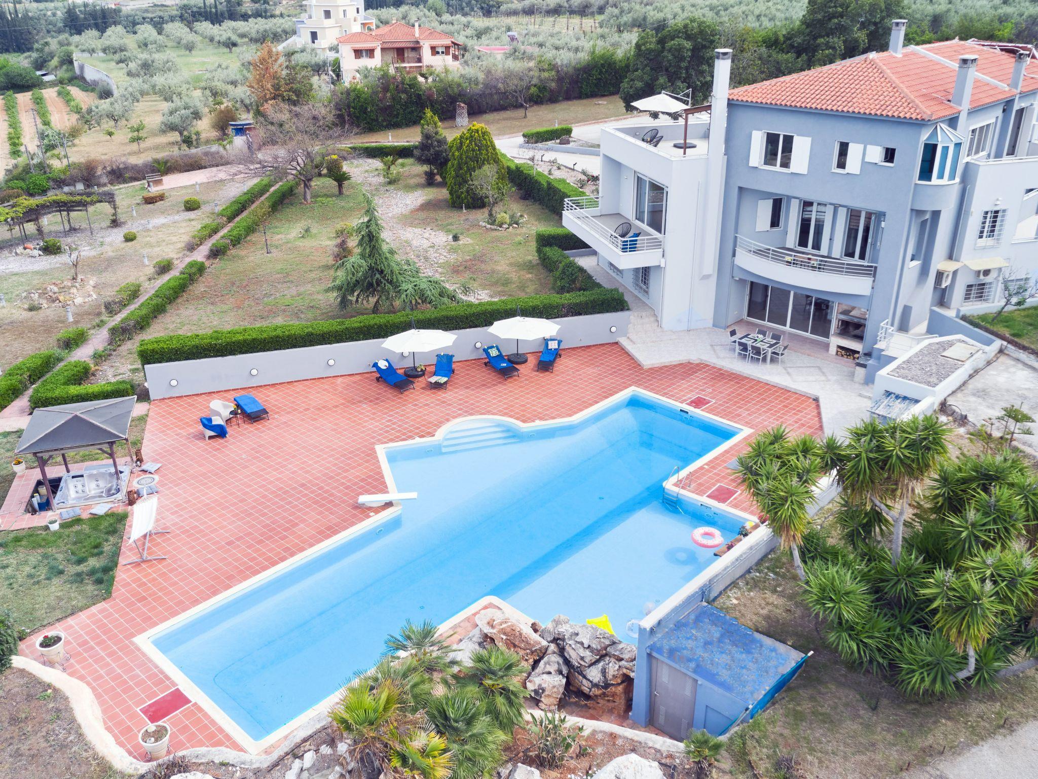 A luxurious complex of a main house and guest houses in a property of 3 acres overlooking the bay of Corinth. The outdoor facilities include a long swimming pool, a BBQ, a jacuzzi, sunbeds, couches and sun shades, a bar and a lounge. This unique villa is only 100 km from Athens. It has 10 bedrooms for 20 guests, 10 bathrooms, 3 dining areas, two fully equipped kitchens, 2 indoor jacuzzis and a patio with pool views.