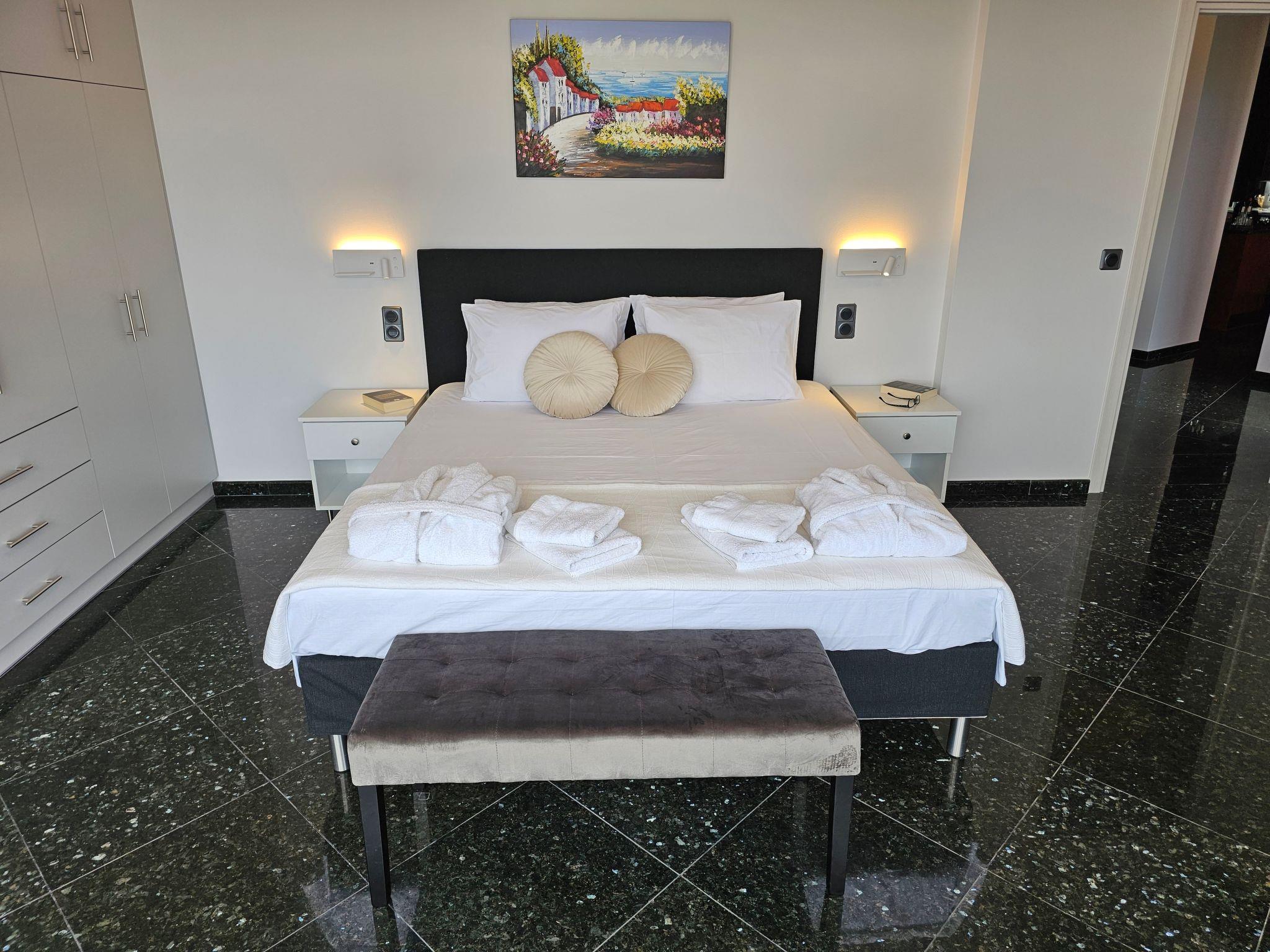 Bedroom 1- Master: King size bed, En-suite bathroom with stand-alone shower, Direct access to balcony, Air conditioning, view of the sea