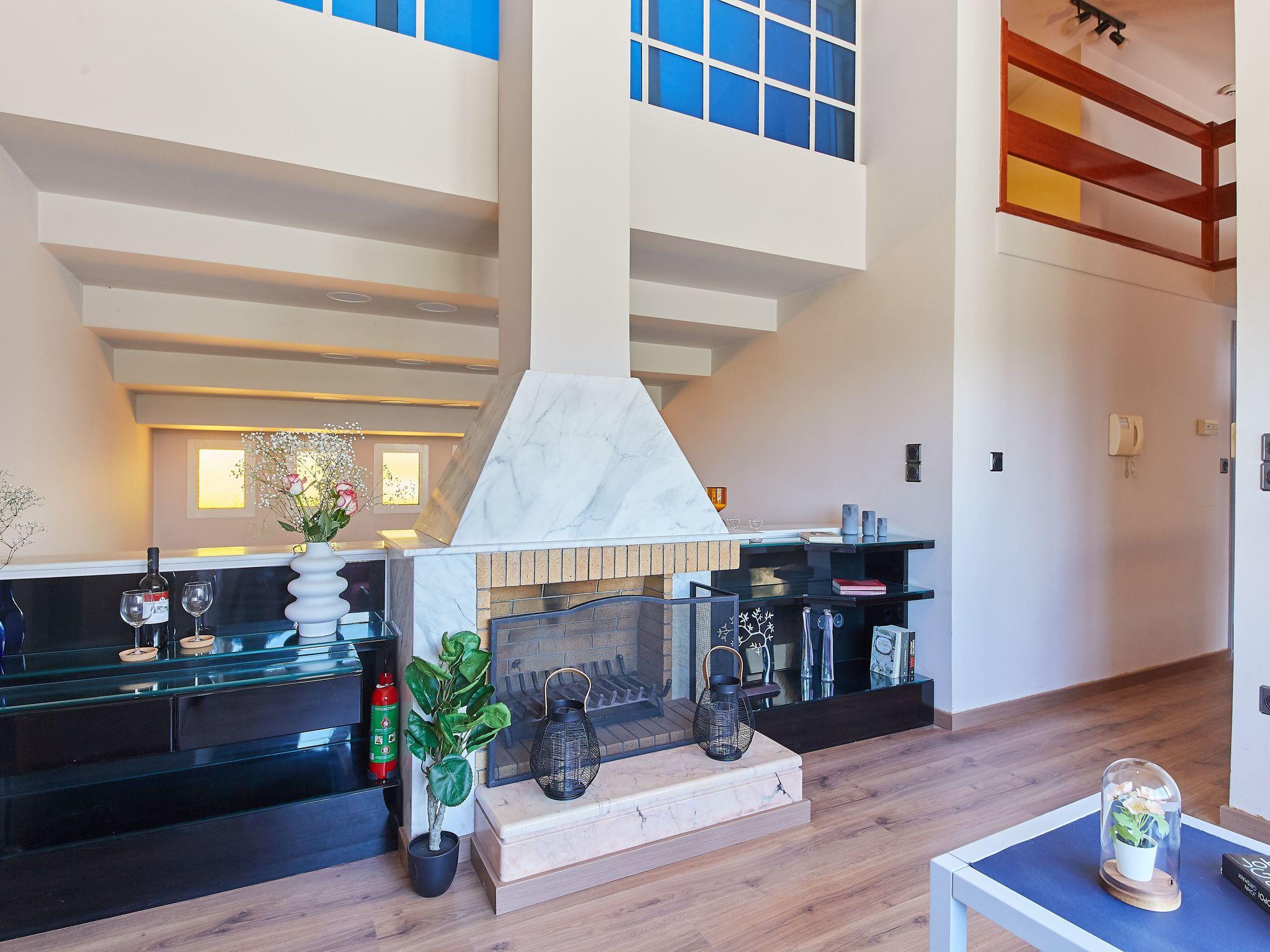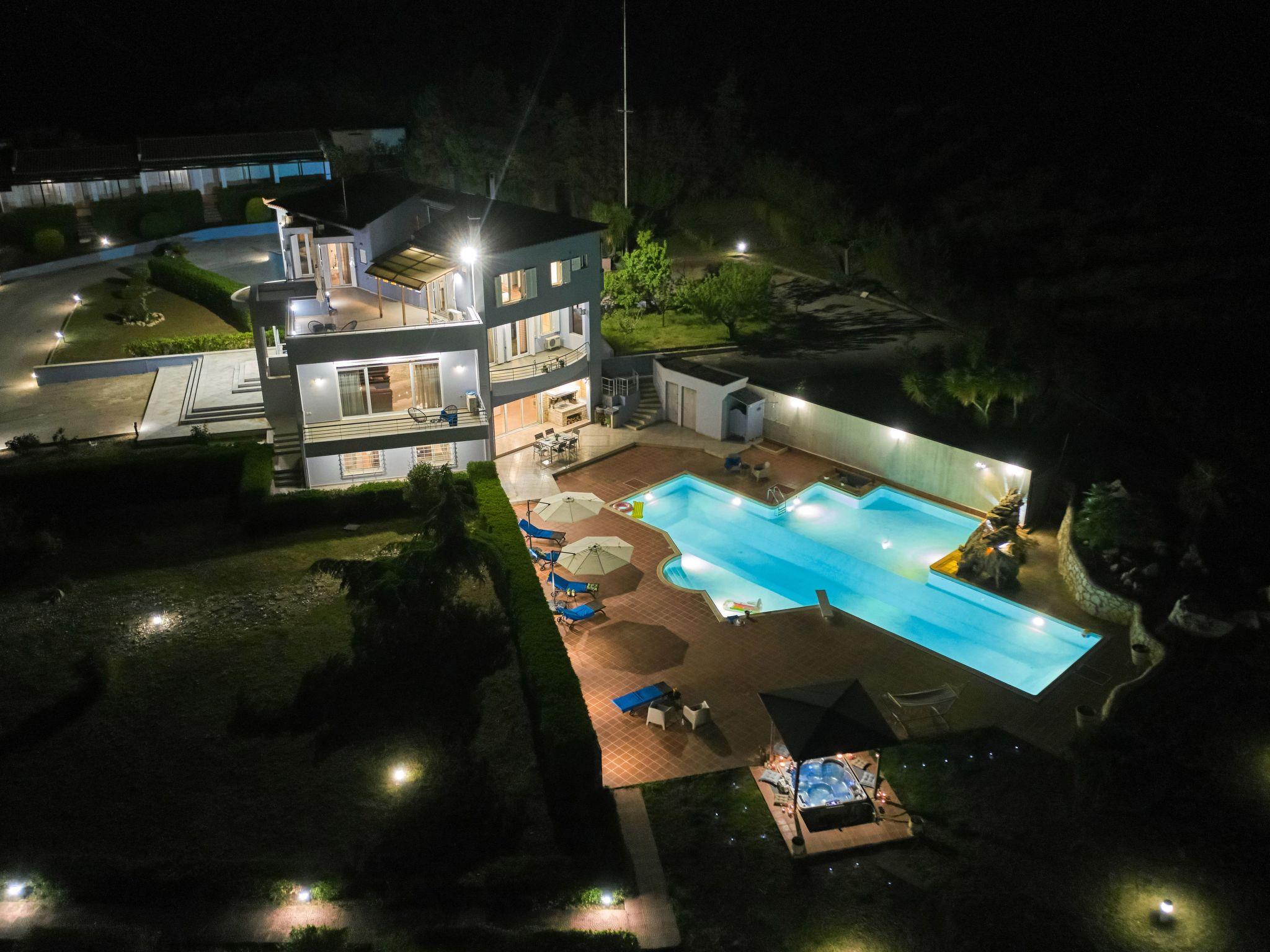 Villa Dennis is built on 450 square meters expanse on 3 different levels, plus an attic. The first level has a kitchen, living room, a dining room, a fireplace and an interior barbecue. Also, the ground floor has a bar and a tap draft beer tower for plenty of enjoyment.The large monastic dining room located at the interior is ideal to accommodate large groups of people.When opening the extra wide balcony doors, a single space is created with the pool area.On the first floor there is a large living room with big flat screen TV and a projector, with an open kitchen and a second bar. On the same floor there is a study with a sofa bed that has its private balcony overlooking the garden. On the second floor there are three bedrooms, each with a bathroom inside. The master room and a second room on this floor have a private Jacuzzi. All the rooms have spectacular views of the Corinthian Gulf, sharing a terrace overlooking the whole area. A small sitting room on this floor will provide further relaxing possibilities.Above is the attic, a unique experience for children, teenagers or someone who feels like a child. The attic can accommodate from 2 to 4 people in comfortable and luxurious mattresses.Two more guest houses are situated just 30 meters from the main building. Each guest house can accommodate 4 persons, has two separate bedrooms and one bathroom. One guest house is accesible for disabled persons and there is a bathroom equipped for disabled persons.