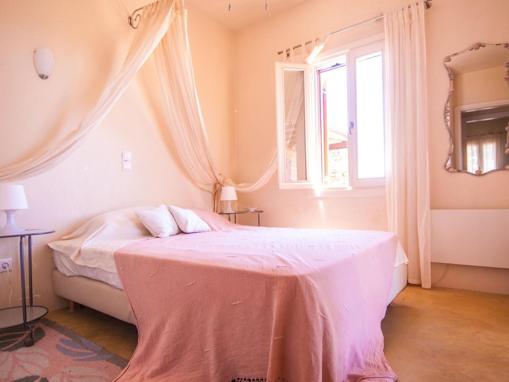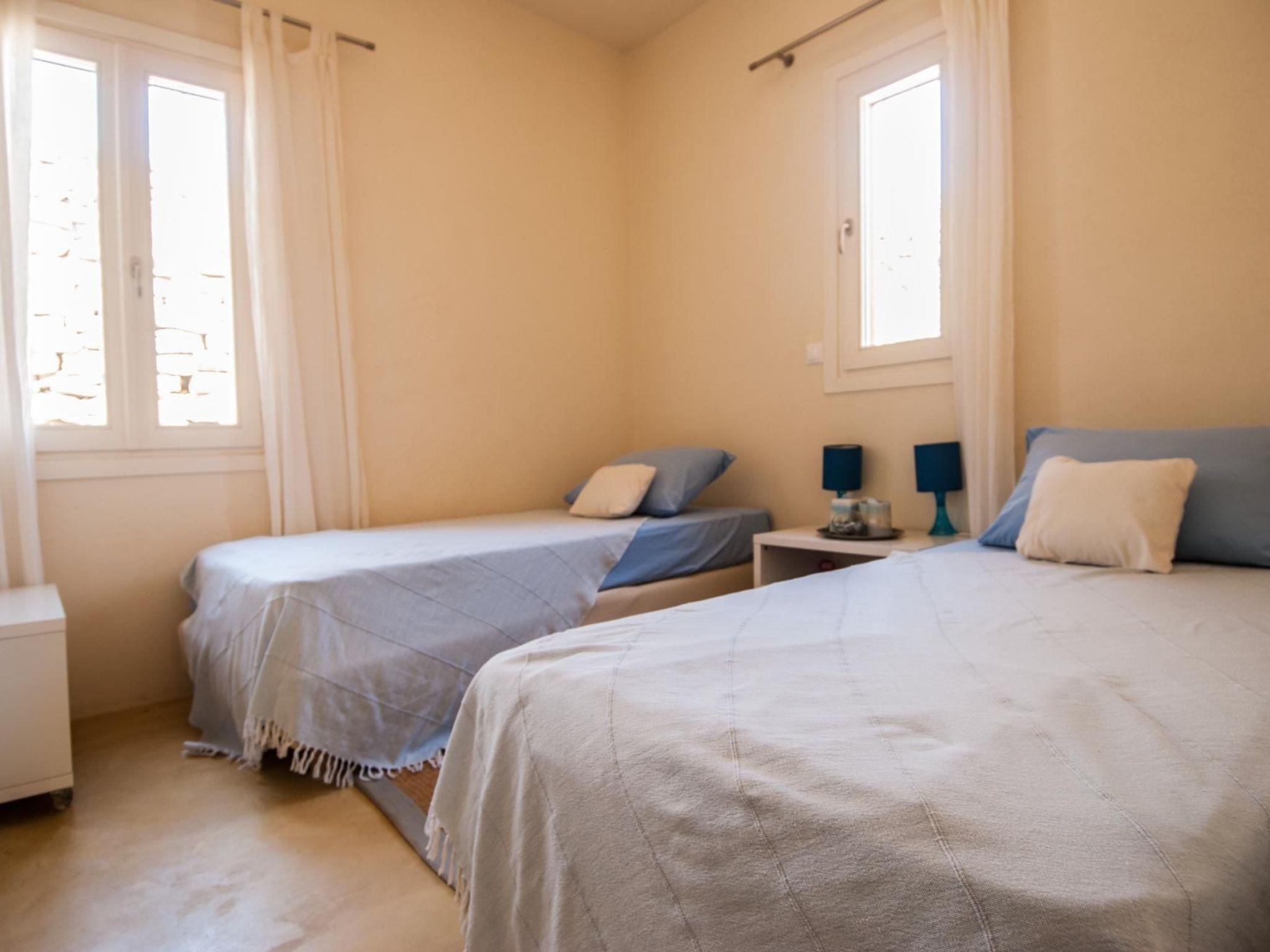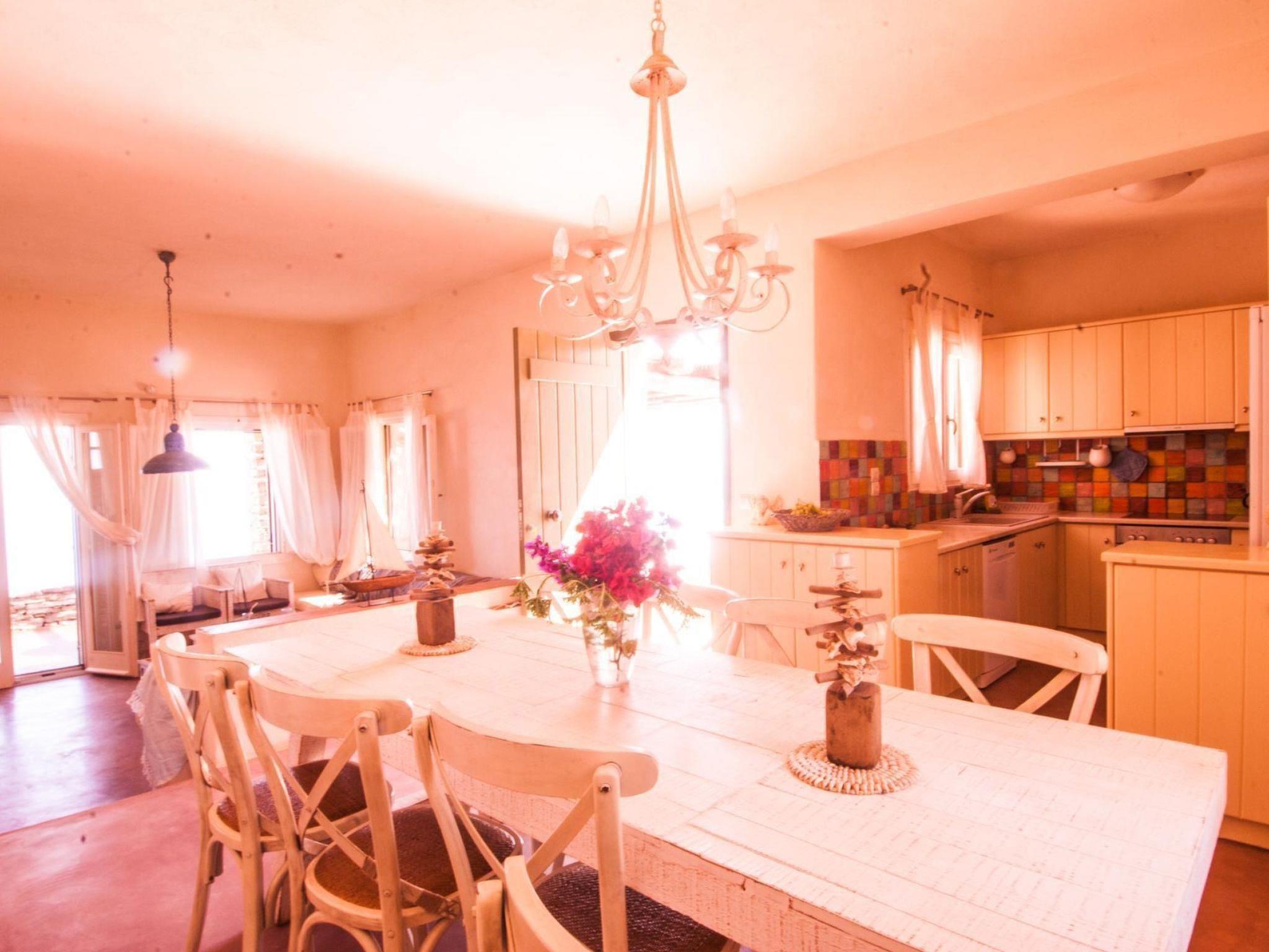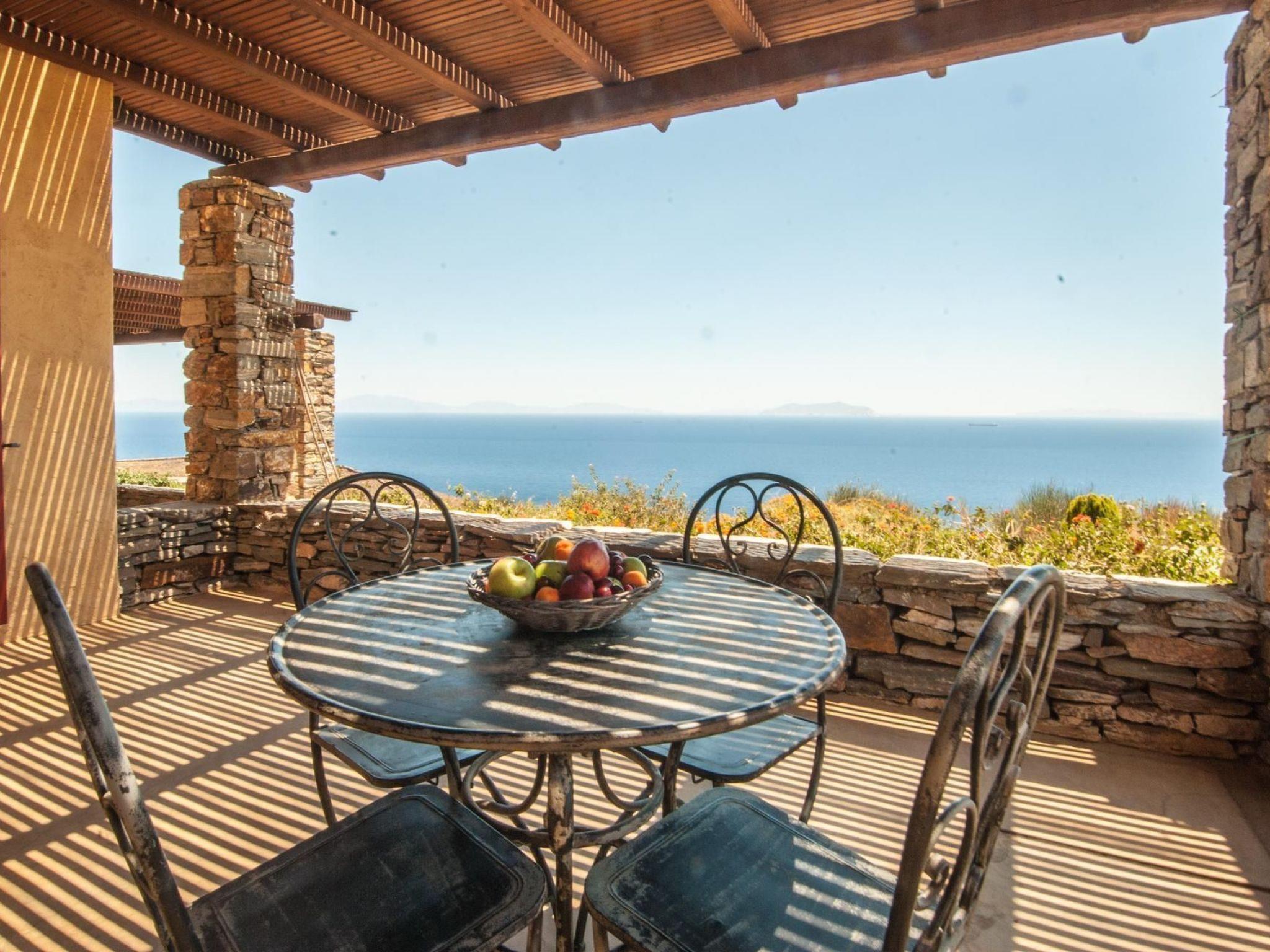 Two of the most beautiful beaches with their crystal clear water are within easy access. The Sikamia beach is about 800 metres from the property. The main town with restaurants, cafés and a bank is Ioulida about 8km away. The harbour is 15km away. The nearest supermarket is about 4km away. House 1This house feels like a pontoon bridge, as you have a view of the sea from every room. It measures 110m² and can accommodate up to six people. It provides three bedrooms – two with double beds and one with two single beds. A further person can sleep on the big sofa in the living room on request, or a supplementary bed can be provided. The living room has a fireplace. There are also two bathrooms, of which one has a whirlpool bath. Each room has its own character, featuring earthy and vibrant colours. The kitchen is equipped with a fridge, stove, dishwasher, microwave, coffee machine, espresso machine, toaster, electric kettle and other kitchen utensils. A washing machine is also available. The veranda has a sitting corner with bamboo sofas and armchairs, a built-in grill, and a big dining table for 16 people, which can also be extended for 22 people. House 2This house is built with earthy materials and colours, and affords a great view of the sea. It measures 65m² and can accommodate up to six people, if the sofa in the living room is also used as a bed. There are two bedrooms, one with a double bed and the other with two single beds. The kitchen is equipped with a fridge, stove, dishwasher, coffee machine and other kitchen utensils. The bathroom has a shower. There are two washing machines shared with house 3. The terrace has a table and chairs, as well as armchairs. A portable grill can be provided on request. House3This house is inspired by the blue, grey and metallic colour tones of the sky. It measures 65m² and provides two bedrooms, one with a double bed and one with two single beds. Two further people can sleep on the big sofa in the living room. The kitchen is equipped with a fridge, stove, dishwasher, coffee machine and further utensils. The bathroom has a shower. There are two washing machines shared with house 2. The terrace is furnished with a table and chairs and armchairs. There is also a built-in grill. House 4