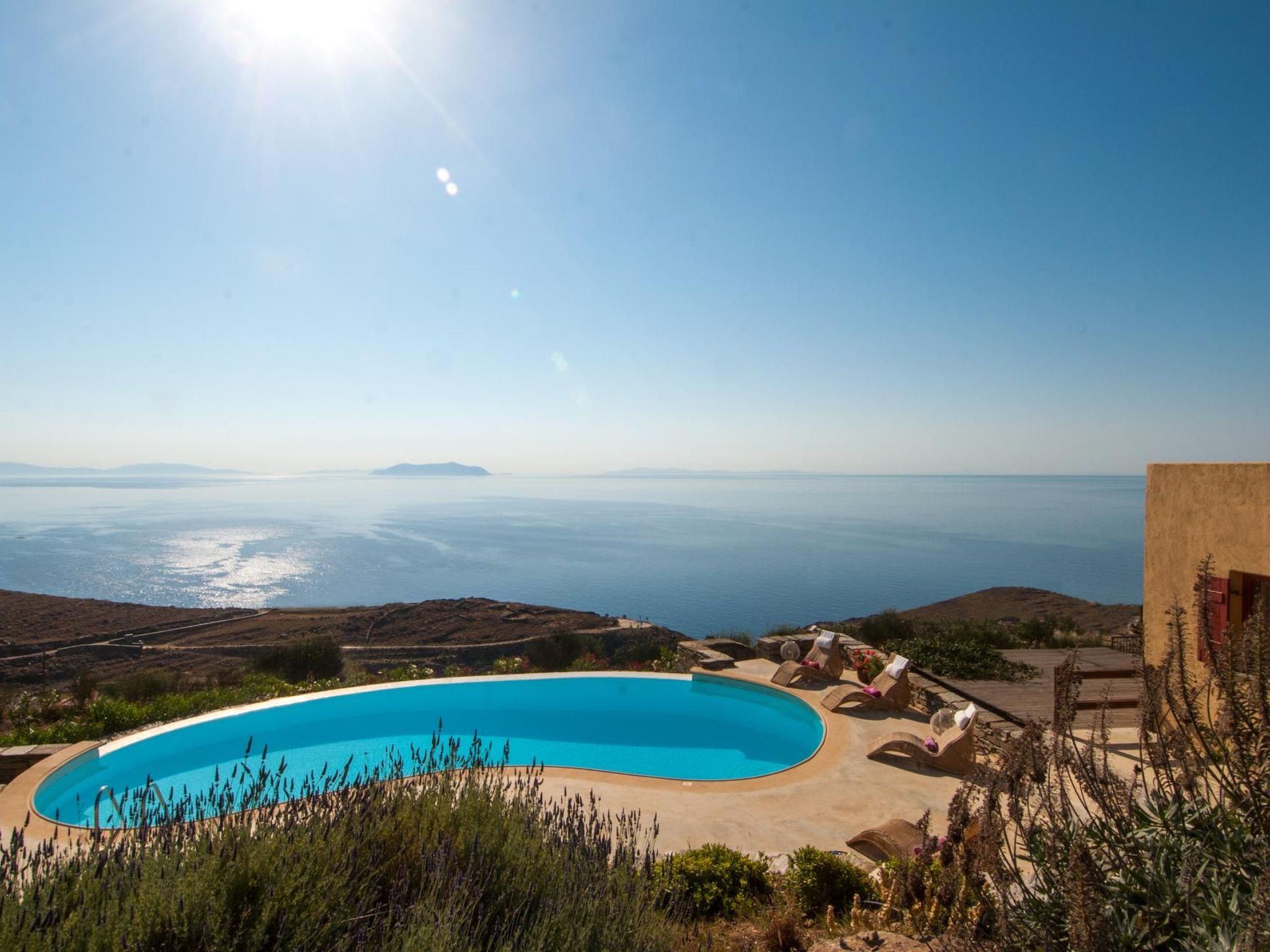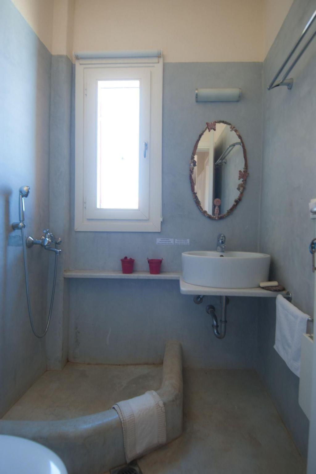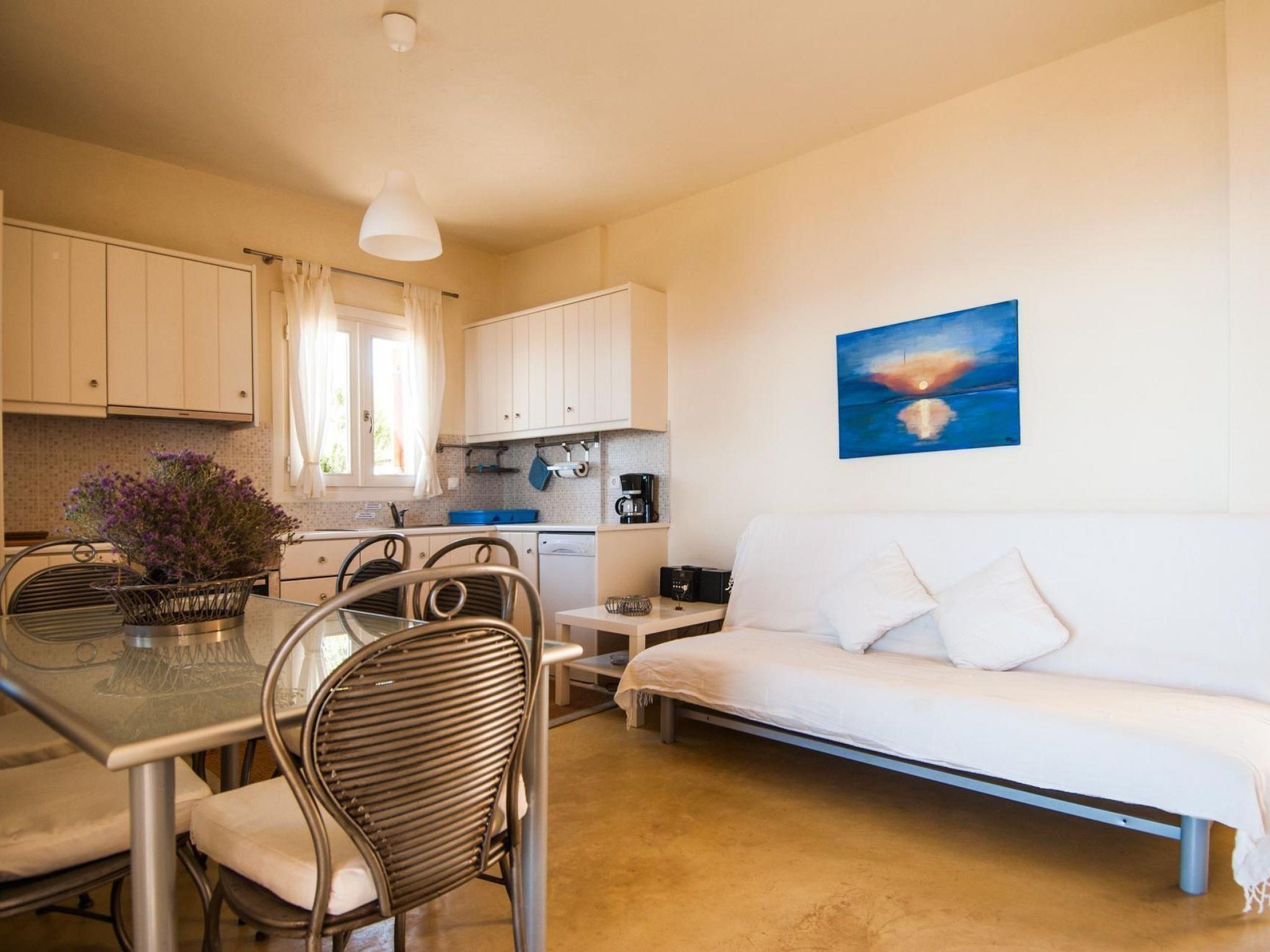 Two of the most beautiful beaches with their crystal clear water are within easy access. The Sikamia beach is about 800 metres from the property. The main town with restaurants, cafés and a bank is Ioulida about 8km away. The harbour is 15km away. The nearest supermarket is about 4km away. House 1This house feels like a pontoon bridge, as you have a view of the sea from every room. It measures 110m² and can accommodate up to six people. It provides three bedrooms – two with double beds and one with two single beds. A further person can sleep on the big sofa in the living room on request, or a supplementary bed can be provided. The living room has a fireplace. There are also two bathrooms, of which one has a whirlpool bath. Each room has its own character, featuring earthy and vibrant colours. The kitchen is equipped with a fridge, stove, dishwasher, microwave, coffee machine, espresso machine, toaster, electric kettle and other kitchen utensils. A washing machine is also available. The veranda has a sitting corner with bamboo sofas and armchairs, a built-in grill, and a big dining table for 16 people, which can also be extended for 22 people. House 2This house is built with earthy materials and colours, and affords a great view of the sea. It measures 65m² and can accommodate up to six people, if the sofa in the living room is also used as a bed. There are two bedrooms, one with a double bed and the other with two single beds. The kitchen is equipped with a fridge, stove, dishwasher, coffee machine and other kitchen utensils. The bathroom has a shower. There are two washing machines shared with house 3. The terrace has a table and chairs, as well as armchairs. A portable grill can be provided on request. House3This house is inspired by the blue, grey and metallic colour tones of the sky. It measures 65m² and provides two bedrooms, one with a double bed and one with two single beds. Two further people can sleep on the big sofa in the living room. The kitchen is equipped with a fridge, stove, dishwasher, coffee machine and further utensils. The bathroom has a shower. There are two washing machines shared with house 2. The terrace is furnished with a table and chairs and armchairs. There is also a built-in grill. House 4