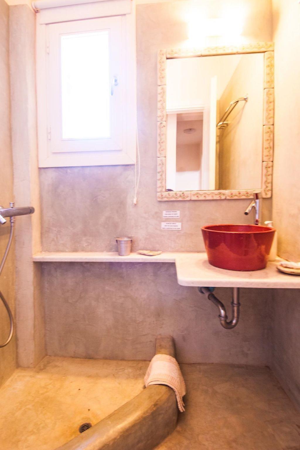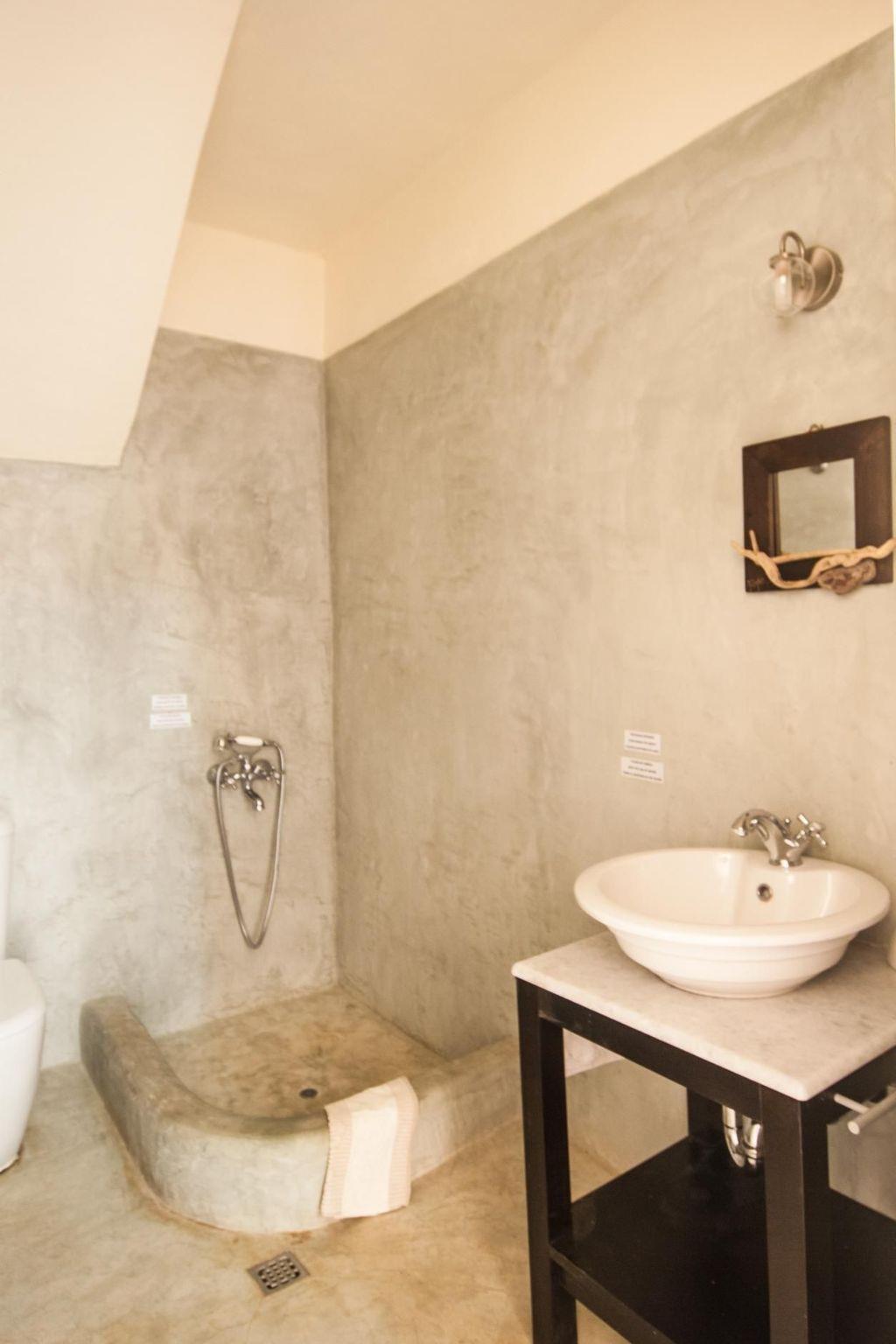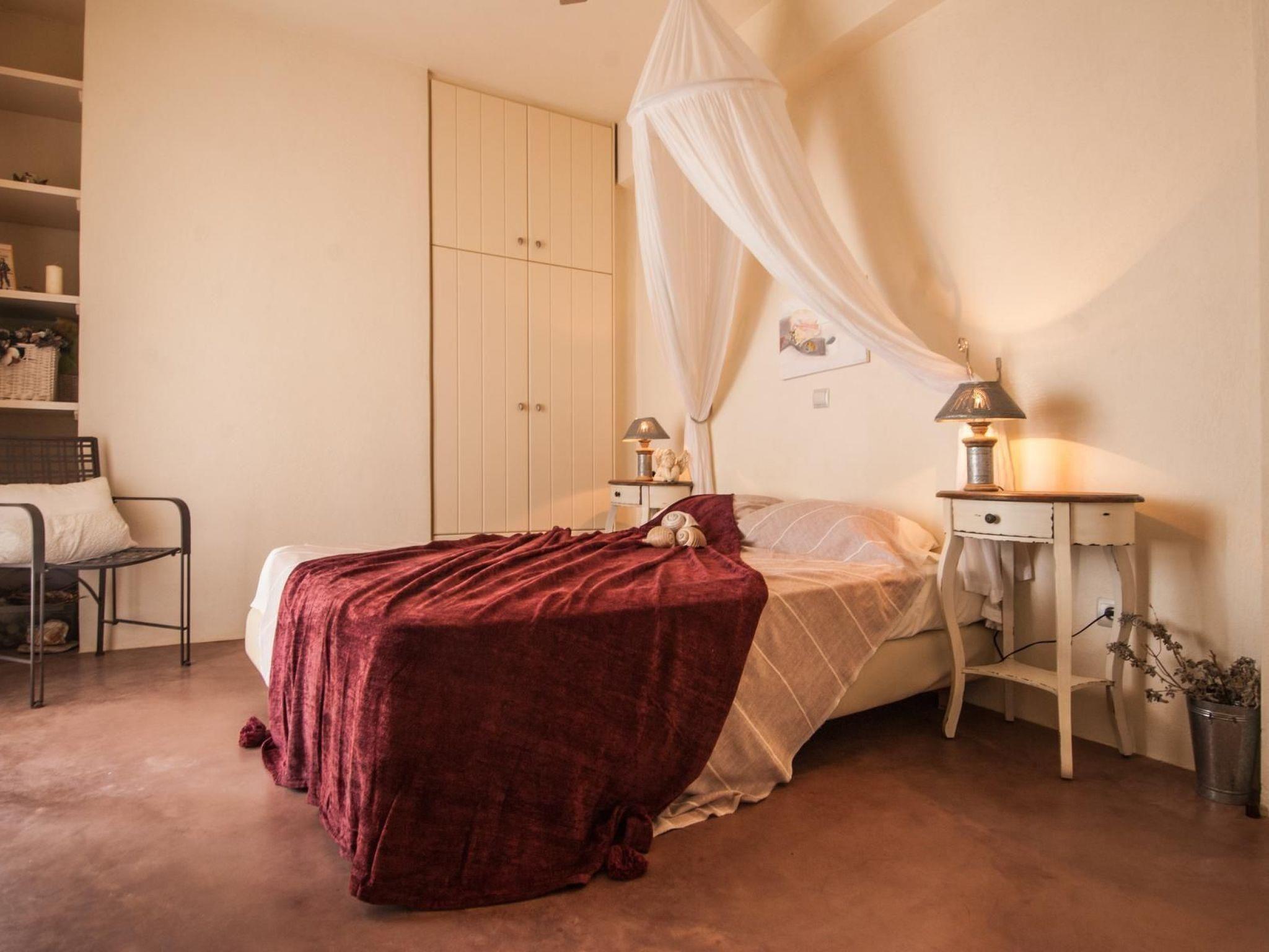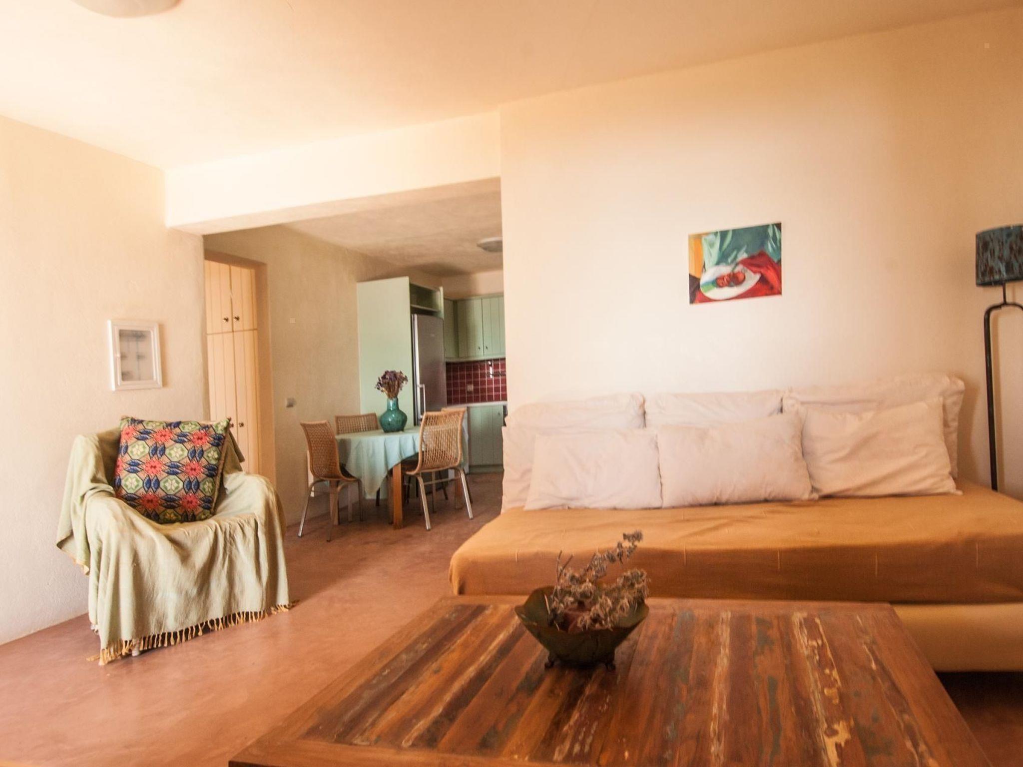 Two of the most beautiful beaches with their crystal clear water are within easy access. The Sikamia beach is about 800 metres from the property. The main town with restaurants, cafés and a bank is Ioulida about 8km away. The harbour is 15km away. The nearest supermarket is about 4km away. House 1This house feels like a pontoon bridge, as you have a view of the sea from every room. It measures 110m² and can accommodate up to six people. It provides three bedrooms – two with double beds and one with two single beds. A further person can sleep on the big sofa in the living room on request, or a supplementary bed can be provided. The living room has a fireplace. There are also two bathrooms, of which one has a whirlpool bath. Each room has its own character, featuring earthy and vibrant colours. The kitchen is equipped with a fridge, stove, dishwasher, microwave, coffee machine, espresso machine, toaster, electric kettle and other kitchen utensils. A washing machine is also available. The veranda has a sitting corner with bamboo sofas and armchairs, a built-in grill, and a big dining table for 16 people, which can also be extended for 22 people. House 2This house is built with earthy materials and colours, and affords a great view of the sea. It measures 65m² and can accommodate up to six people, if the sofa in the living room is also used as a bed. There are two bedrooms, one with a double bed and the other with two single beds. The kitchen is equipped with a fridge, stove, dishwasher, coffee machine and other kitchen utensils. The bathroom has a shower. There are two washing machines shared with house 3. The terrace has a table and chairs, as well as armchairs. A portable grill can be provided on request. House3This house is inspired by the blue, grey and metallic colour tones of the sky. It measures 65m² and provides two bedrooms, one with a double bed and one with two single beds. Two further people can sleep on the big sofa in the living room. The kitchen is equipped with a fridge, stove, dishwasher, coffee machine and further utensils. The bathroom has a shower. There are two washing machines shared with house 2. The terrace is furnished with a table and chairs and armchairs. There is also a built-in grill. House 4