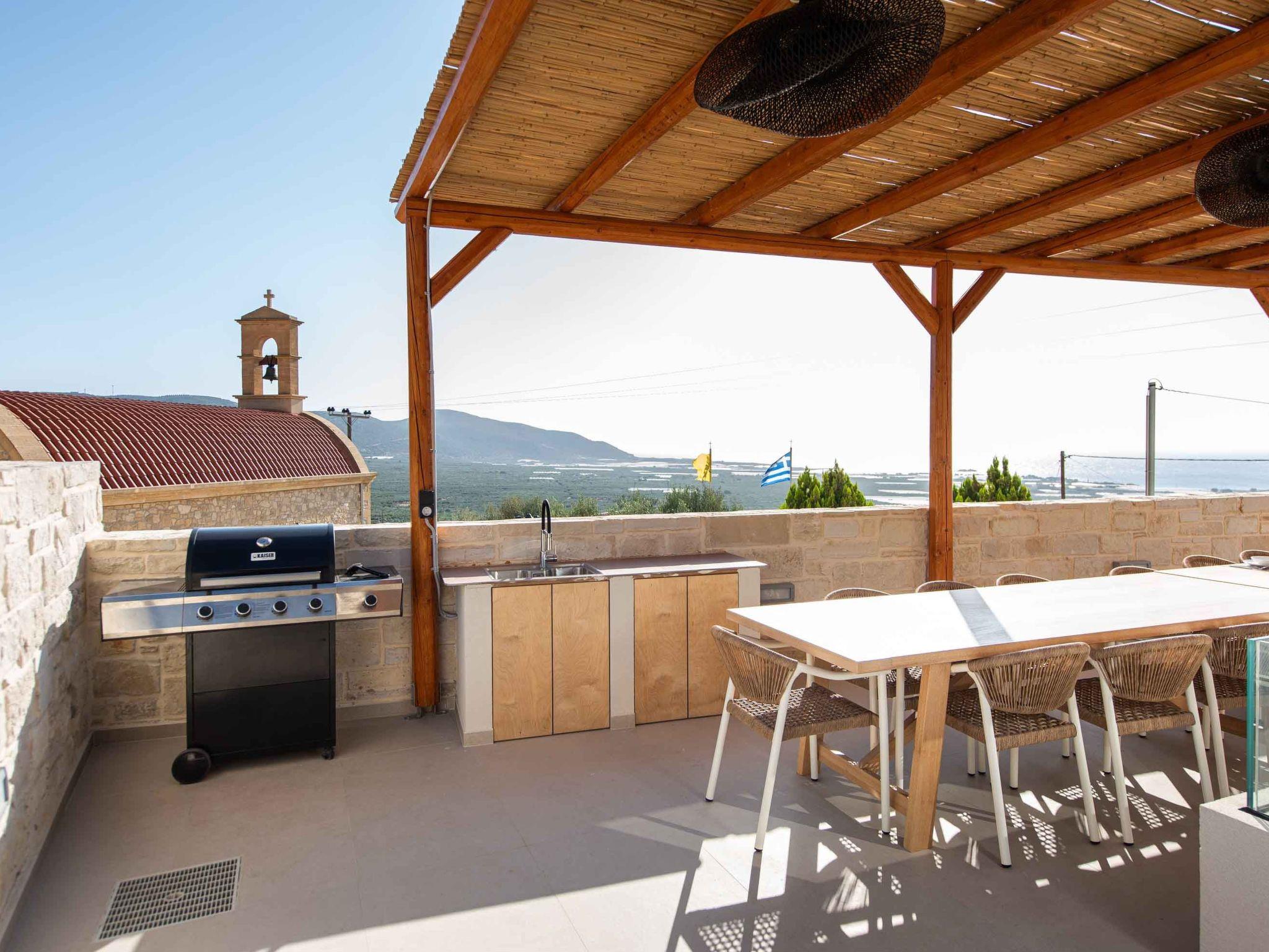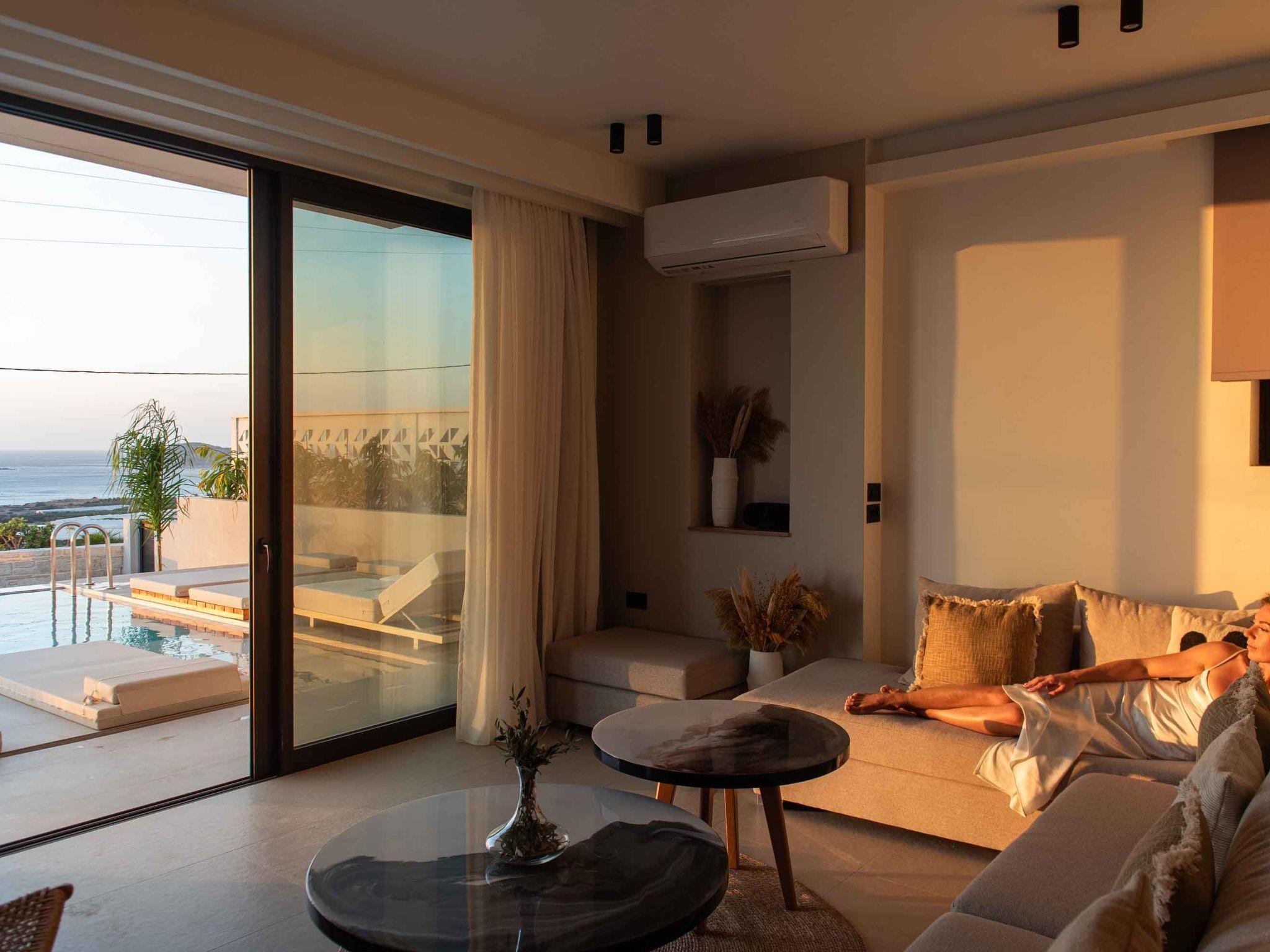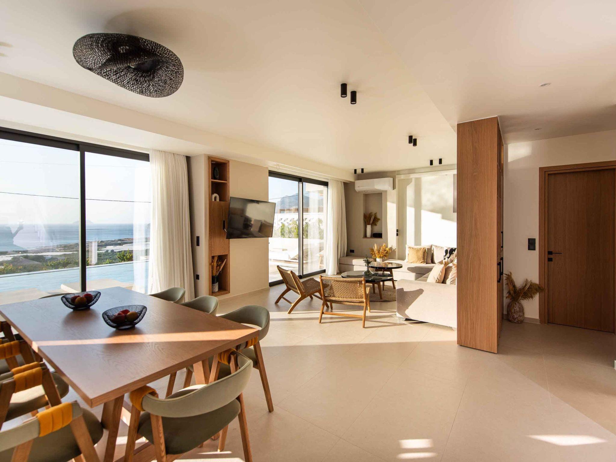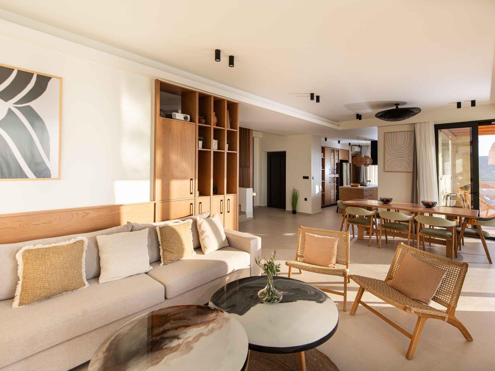 Is there a better place for you during summer vacation rather than lying by the pool and having your tanning session? The private garden lawn is suited for sunset drinks and a swimming pool with a lounge area with sofas make the ideal spot to relax. Pretty close to the pool area exists a dining table for 16 guests for moments of relaxation for you and your family. Fire up the grill and gather together for an alfresco meal under the pergola as the stars come out one by one. sunbeds to enjoy the Cretan sun and the little things that will impress you. Cool and contemporary, this stylish vacation property offers wonderfully appointed outdoor spaces and sleek and stylish interiors.