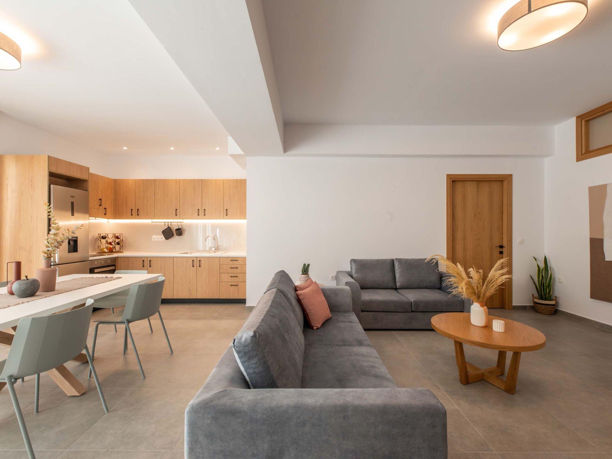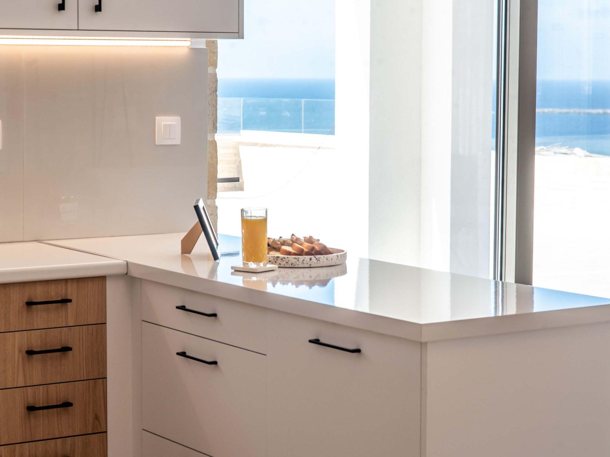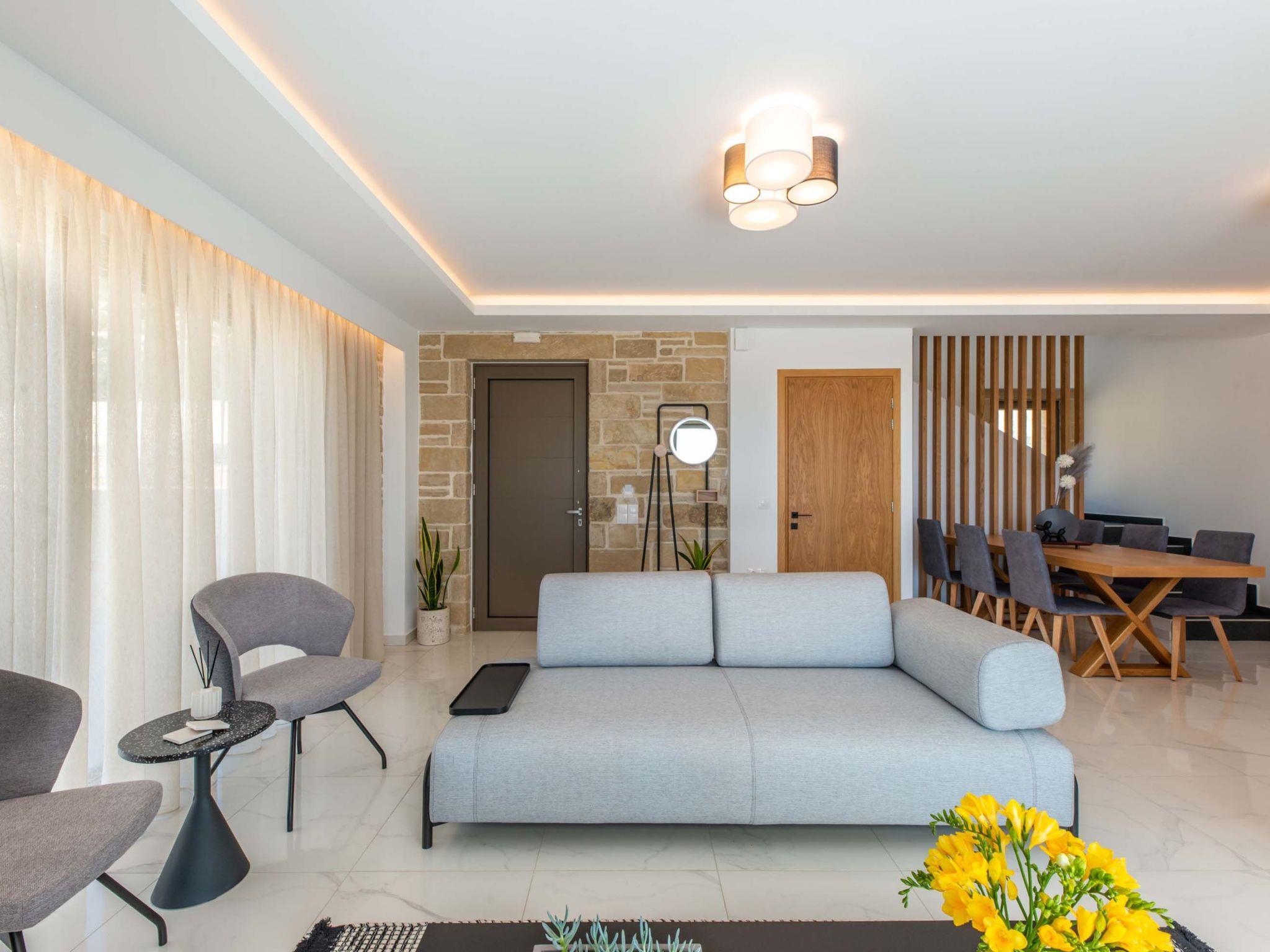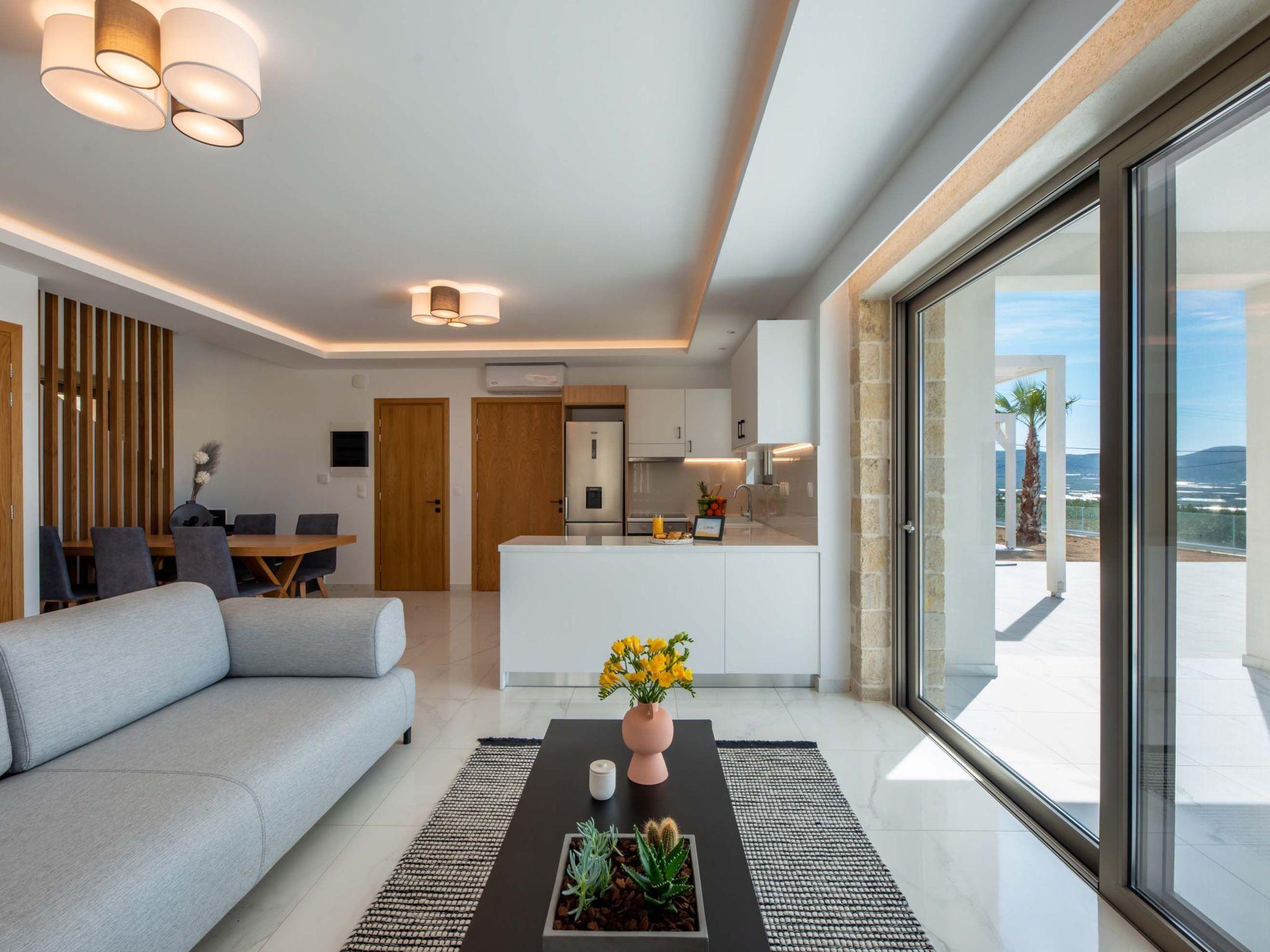 A sleek contemporary villa with arresting views, designed over three floors, features generous indoor and outdoor areas with a lavish design. Entering the villa you will step into a large living area with breathtaking views of the sea. The supreme amenities, the exuberant living room, and the dining area are also adequate for people with special needs. The villa is styled to feel like an immersive sanctuary, where natural materials meet modern design for a calming atmosphere that is luxurious yet comfortable with every space designed to embrace the exterior environment. Pretty close to the living area there is a glossy kitchen where cooking is anything but a chore and have light breakfasts and gourmet dinners. On the same level, there is also a bedroom with a satellite Smart TV and large windows that create the illusion of transparency and a dining room with seating for 6 persons.